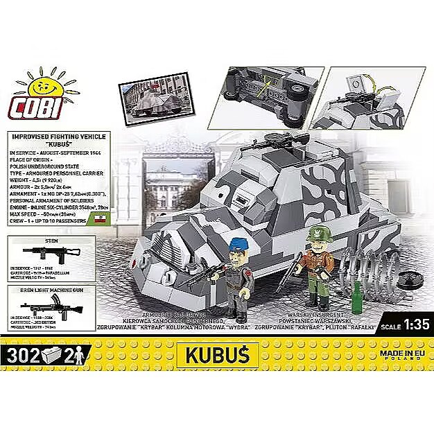 Description - Kubuś to polski improwizowany samochód pancerny, który został zbudowany przez powstańców warszawskich w sierpniu 1944 roku podczas Powstania Warszawskiego. Pojazd ten powstał w zaledwie kilka dni, w warsztacie przy ul. Tamka. Do jego budowy wykorzystano podwozie ciężarówki Chevrolet 157 oraz blachy stalowe, które miały chronić załogę przed ogniem nieprzyjaciela. Kubuś, uzbrojony w karabiny maszynowe, brał udział w kilku akcjach bojowych, w tym w nieudanym ataku na Uniwersytet Warszawski. Po zakończeniu powstania Kubuś cudem przetrwał wojnę i obecnie jest eksponowany w Muzeum Wojska Polskiego w Warszawie jako symbol odwagi i pomysłowości powstańców warszawskich! Razem z Muzeum Wojska Polskiego postanowiliśmy uczcić 80. rocznicę wybuchu Powstania Warszawskiego! Przygotowaliśmy wyjątkowy klockowy zestaw z legendarnym samochodem powstańczym Kubuś! Klockowy model w skali 1:35 zawiera nadruki oraz wszystkie najważniejsze cechy swojego pierwowzoru znajdującego się w Muzeum Wojska Polskiego w Warszawie. Nie zapomnieliśmy nawet o tak mało znanym detalu, jak emblemat Kolumny Motorowej Wydra, który znajdował się na zderzaku! Nasz model został wyposażony w karabin maszynowy DP-28. Górny właz można otworzyć, aby umieścić w nim figurkę. Nie każdy wie, że do Kubusia wsiadało się przez otwór w podłodze! Zaznaczyliśmy w modelu to nietypowe wejście! Do zestawu dołączone są dwie figurki przedstawiające powstańców warszawskich. W szarym kombinezonie, z biało-czerwoną opaską na prawym ramieniu, z naszywką Wydry na lewym i niebieskiej furażerce przedstawiliśmy żołnierza z Kolumny Motorowej Wydra, która była częścią Zgrupowania Krybar. Drugi z żołnierzy należy do plutonu Rafałki. To, co ich wyróżniało spośród innych formacji to używanie jako emblematów niemieckich saperskich żółtych trójkątnych proporczyków z trupią czaszką, które stanowiły oznaczenie dla terenu zaminowanego bądź skażonego chemicznie. Symbol ten znajduje się na lewym ramieniu żołnierza. Na hełmie z boku białą farbą namalowana jest litera R charakterystyczna dla tej formacji. Obie figurki zostały wyposażone w akcesoria takie jak: pistolet maszynowy STEN, ręczny karabin maszynowy Bren, granat ręczny i minę. W zestawie znajduje się również butelka oraz fragment drutu kolczastego. Powstanie warszawskie wybuchło 1 sierpnia 1944 roku i trwało aż do 3 października. Było zbrojnym wystąpieniem polskiego ruchu oporu, głównie Armii Krajowej, przeciwko okupującym Warszawę wojskom niemieckim. Celem powstania było wyzwolenie stolicy przed nadejściem Armii Czerwonej, aby zapewnić suwerenność Polski po wojnie. Mimo początkowych sukcesów, powstańcy nie zdołali utrzymać swoich pozycji w obliczu przeważających sił niemieckich i braku dostatecznej pomocy z zewnątrz. Po 63 dniach zaciętych walk powstanie zostało stłumione. Zginęło około 16 tysięcy powstańców i około 150-200 tysięcy cywilów, a miasto zostało niemal doszczętnie zniszczone. Powstanie warszawskie pozostaje symbolem polskiego heroizmu i patriotyzmu. 302 wysokiej jakości elementy Wyprodukowane w UE przez firmę z ponad 20-letnią tradycją Spełniają normy bezpieczeństwa dotyczące produktów dla dzieci W pełni kompatybilne z innymi markami klocków konstrukcyjnych Klocki z nadrukami nie odkształcają się i nie bledną w czasie zabawy czy pod wpływem temperatury Model samochodu pancernego Dwie figurki Akcesoria.