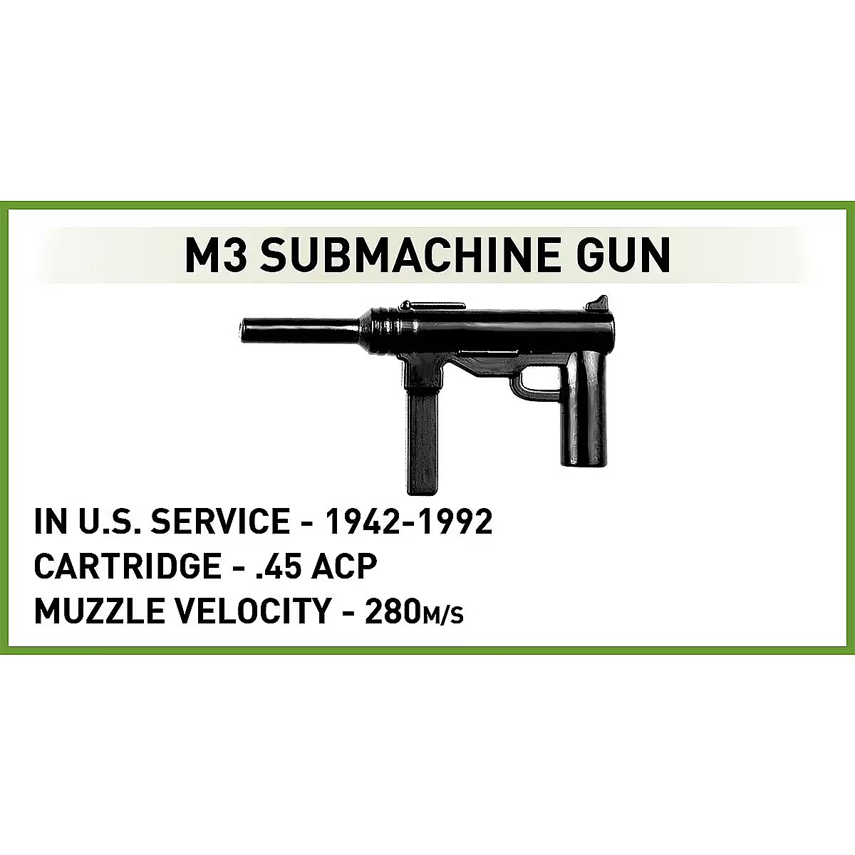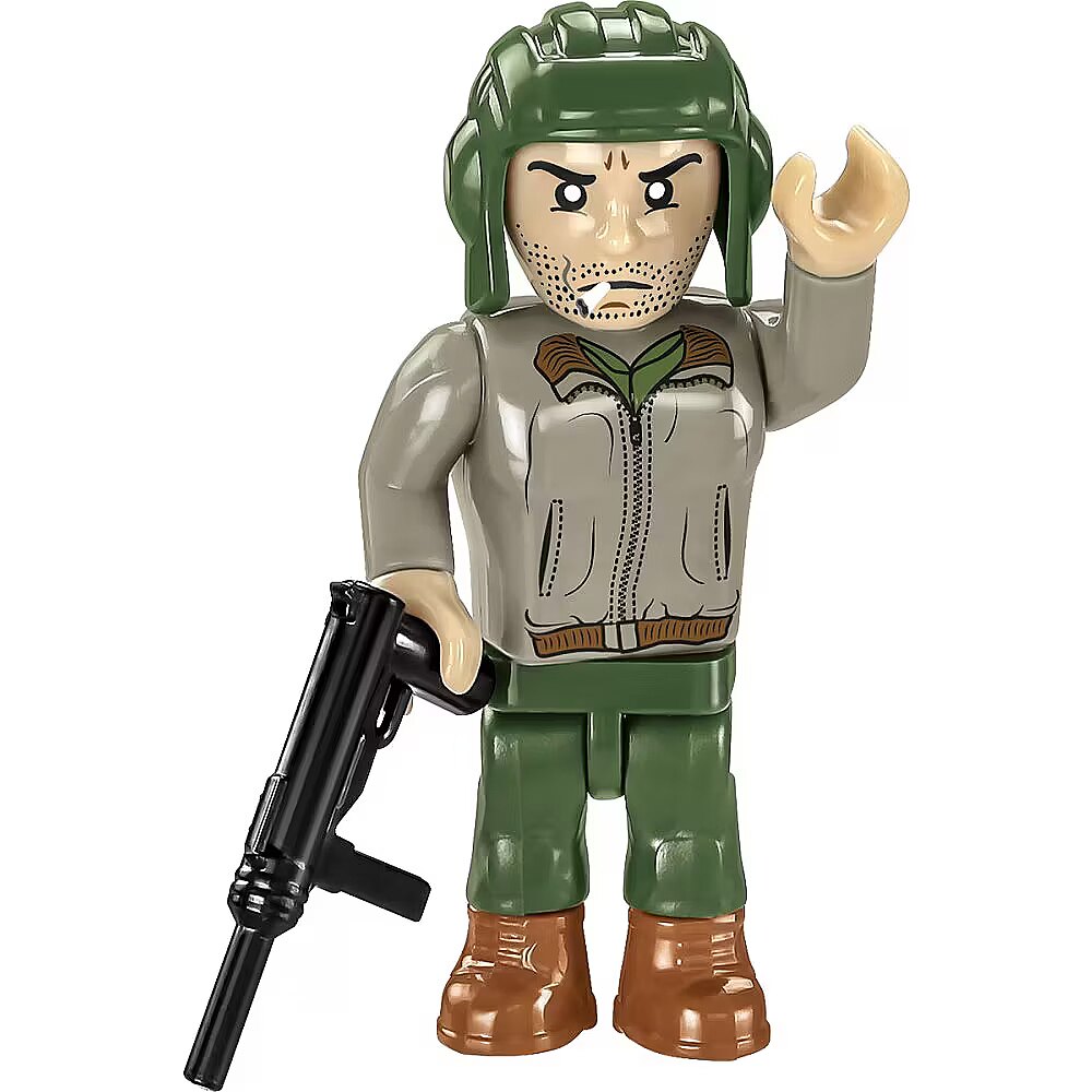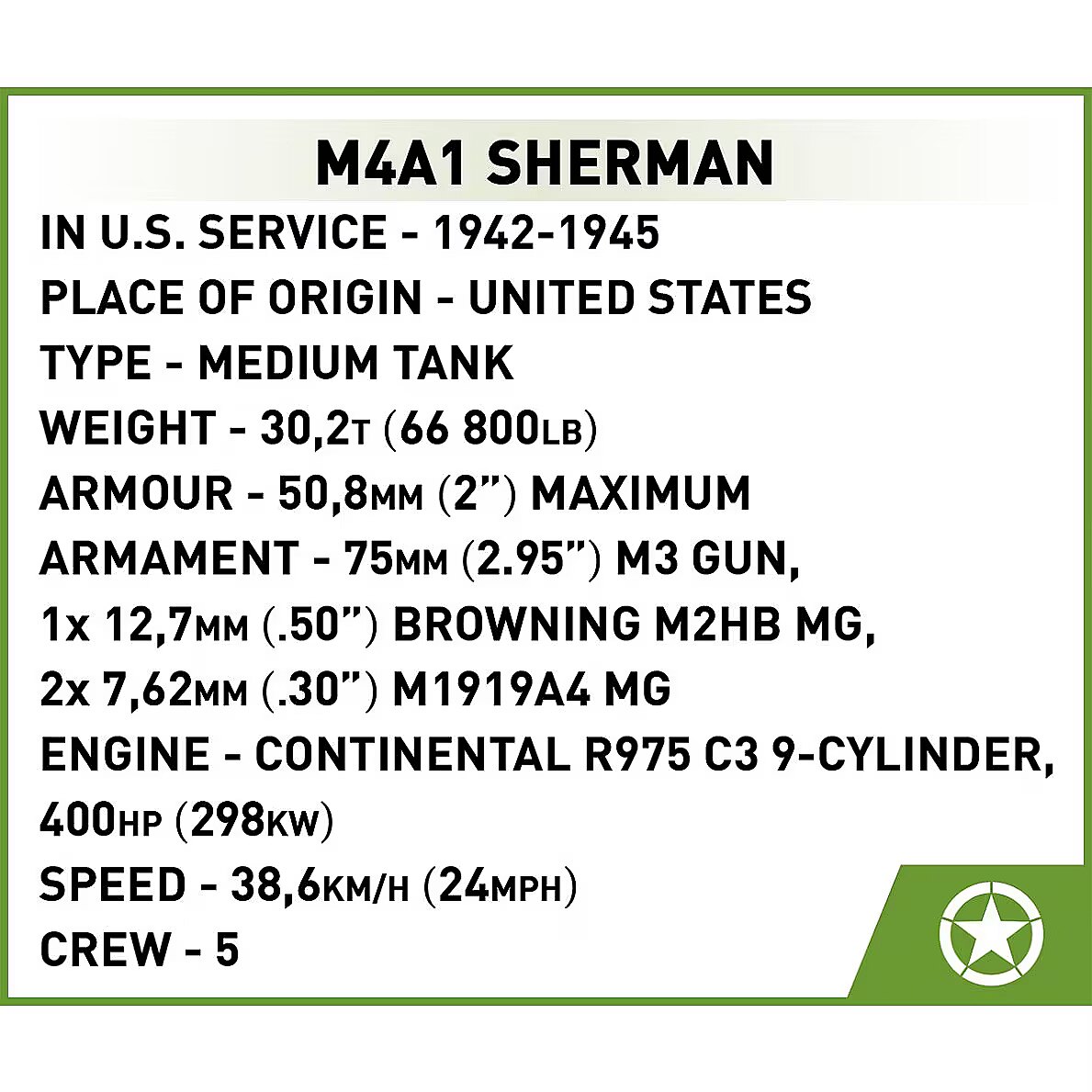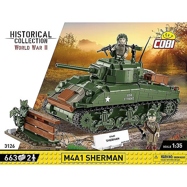 Description - M4A1 Sherman M4 Sherman to podstawowy, amerykański czołg średni, produkowany w czasie II wojny światowej. Używany był między innymi przez: USA, Wielką Brytanię, Polskę, Związek Radziecki i Kanadę. Uzbrojony w armatę M3 kal. 75 mm ze względu na swoją niezawodność, znakomitą konstrukcję i niski koszt produkcji był bardzo wysoko oceniany na wszystkich frontach II wojny światowej. Klockowy Sherman został starannie zaprojektowany w skali 1:35 przy wykorzystaniu 663 elementów. Czołg zawiera działającą trakcję gąsienicową, obracającą się wieżę, ruchomą lufę, otwierany właz oraz klapę serwisową, pod którą znajduje się klockowa atrapa silnika. Do zestawu dołączona jest figurka amerykańskiego czołgisty z hełmofonem i pistoletem maszynowym M3 "Smarownica". Druga figurka przedstawia żołnierza piechoty ubranego w gruby płaszcz i uzbrojonego w karabin M1 Garand. Na klockach znajdują się wysokiej jakości nadruki, które odzwierciedlają oznaczenia i detale czołgu, szczegóły umundurowania dowódcy czołgu oraz żołnierza piechoty. Do zestawu dołączone zostały elementy otoczenia: fragment płotu wraz z żywopłotem. Zestaw został opracowany z dbałością o detale i jest również doskonałym rozwinięciem popularnej serii Historical Collection! Fani historii oraz klocków znajdą tutaj coś dla siebie! 663 wysokiej jakości elementy Wyprodukowane w UE przez firmę z ponad 35-letnią tradycją Spełniają normy bezpieczeństwa dotyczące produktów dla dzieci W pełni kompatybilne z innymi markami klocków konstrukcyjnych Klocki z nadrukami nie odkształcają się i nie bledną w czasie zabawy czy pod wpływem temperatury Klockowy model czołgu 2 figurki wraz z akcesoriami Elementy otoczenia Skala 1:35 Tabliczka z nazwą modelu Klocki dla dorosłych, którymi mogą bawić się dzieci