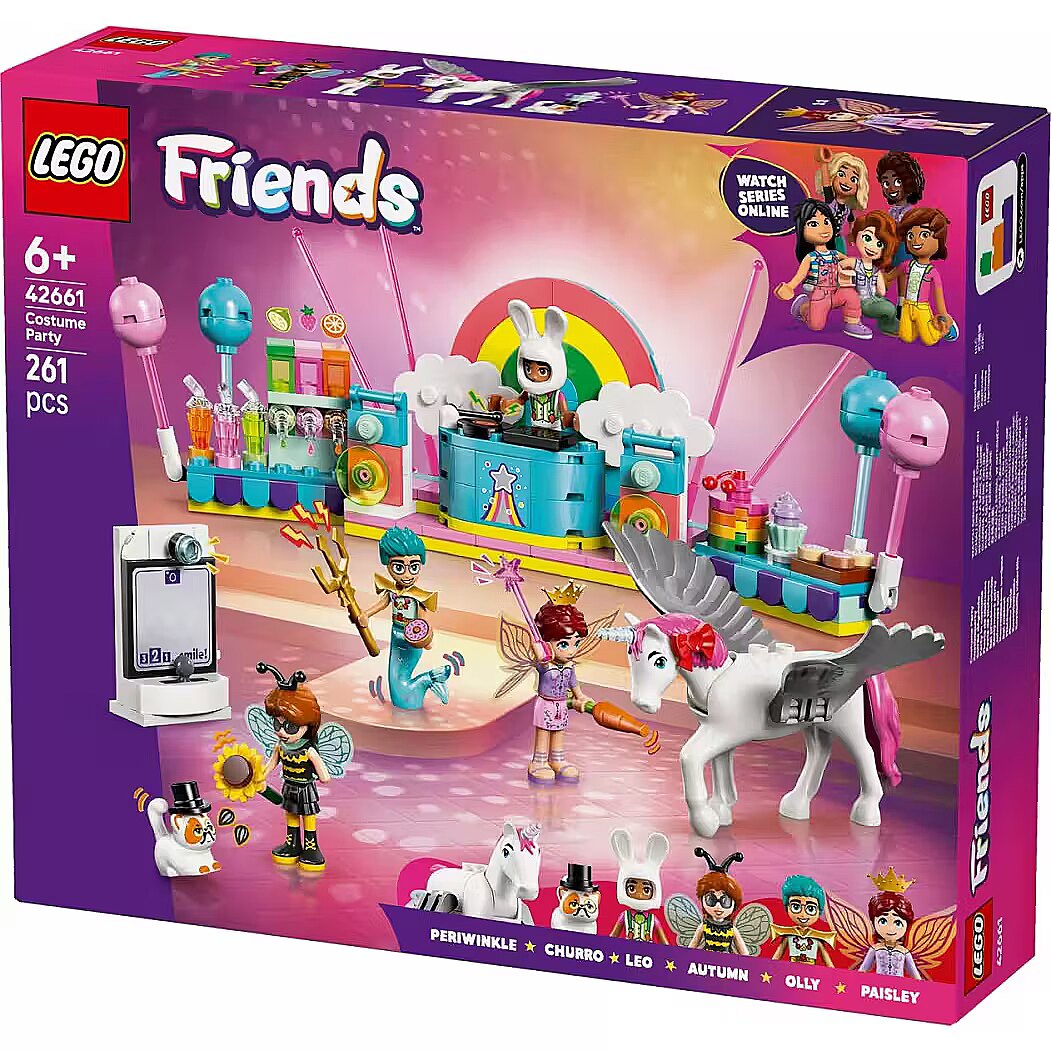 Description - Ten zestaw konstrukcyjny LEGO Friends Bal przebierańców z jednorożcem i wróżką (42661) dla sześciolatków i starszych dzieci jest pełen inspiracji do opowiadania historii. Zawiera cztery minilaleczki LEGO Friends oraz figurki kota i konia. Obejmuje również wiele uroczych akcesoriów imprezowych do zabawy w udawanie. Dzieci mogą wymyślać własne historie i bawić się w bal przebierańców. Autumn przebiera się za trzmiela, a Olly jest trytonem. Kot Churro także dołącza do zabawy i przebrał się za magika, a Leo jest jego białym króliczkiem. Paisley założyła kostium wróżki, a koń Periwinkle przemienił się w jednorożca. Przyjaciele bawią się na imprezie ze sceną, stanowiskiem DJ-a i przekąskami. Jest też fotobudka z fajnymi akcesoriami! Odkryj więcej zestawów konstrukcyjnych do zabawy (sprzedawanych oddzielnie) ze świata LEGO Friends. Do zestawu dołączona jest aplikacja LEGO Builder do intuicyjnego budowania. Dzieci mogą w niej powiększać i obracać modele i śledzić postępy w budowaniu. Zestaw inspirujący do kreatywnej zabawy - zestaw LEGO Friends Bal przebierańców z jednorożcem i wróżką dla dziewczynek i chłopców w wieku od sześciu lat przedstawia imprezę ze stanowiskiem DJ-a Cztery minilaleczki i dwie figurki zwierząt LEGO- rozpocznij imprezę z Autumn, Ollym, Leo, Paisley i ich zwierzętami, którzy przebierają się za trzmiela, trytona, magika, króliczka, wróżkę i jednorożca Inspiracja do kreatywnej zabawy - ten zestaw jest pełen fajnych detali i uroczych akcesoriów, które zachęcają dzieci do kreatywnego opowiadania historii, gdy wymyślają przygody i odgrywają sytuacje społeczne Akcesoria na bal przebierańców - ten zestaw LEGO zawiera wiele akcesoriów, które zachęcają do odgrywania ról, w tym maszynę do robienia sorbetu, ciasta, napoje, balony, kapelusze, trójząb trytona, różdżkę wróżki i wiele innych Prezent dla dzieci, które uwielbiają kreatywne zabawki ten zestaw do budowania to świetny prezent na urodziny lub inną okazję dla chłopców i dziewczynek, którzy lubią wymyślać historie o przyjaźni Serial dostępny online - zainspiruj dzieci do twórczej zabawy dzięki innym zestawom (sprzedawanym osobno) oraz serialowi online LEGO Friends: Następny Rozdział, gdzie dzieci mogą poznać bohaterów z miasta Heartlake Pomoc w budowaniu - odkryj intuicyjne instrukcje budowania dzięki aplikacji LEGO Builder, w której można powiększać i obracać modele w 3D, śledzić postępy i zapisywać zestawy, jednocześnie rozwijając nowe umiejętności Wymiary - 261-elementowy zestaw z modelem głównym ma 8 cm wysokości, 25 cm szerokości i 5 cm głębokości