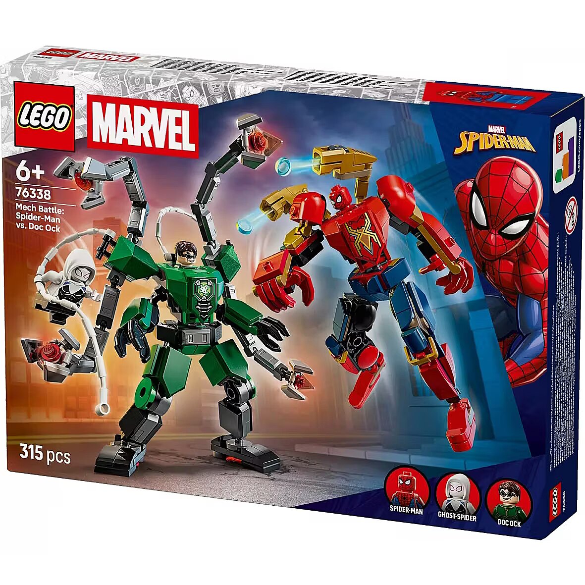 Both mechs are fully posable for maximum action. Each has an opening cockpit that seats a pilot minifigure. Spider-Man's mech features Iron Spider's design and two movable, button-activated stud shooters. Doc Ock's mech has four fully posable tentacles. The set also includes two spider lines that easily attach to the mechs and minifigures, while Ghost Spider has spider webs that attach to Doc Ock's mech's torso.