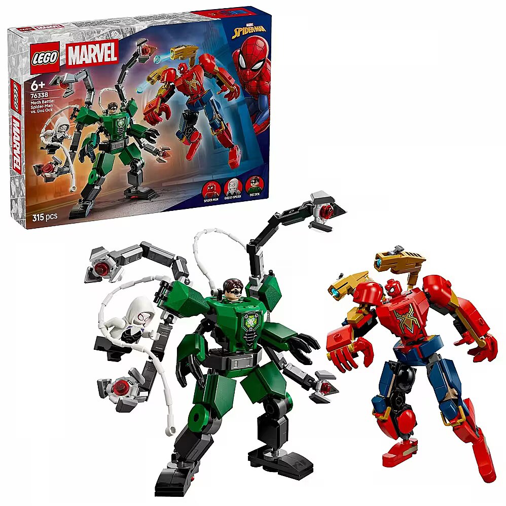 Build two fully posable mechs and immerse yourself in superhero action with the Mech Battle: Spider-Man vs. Doc Ock (76338) set for boys and girls aged six and up. Kids can pose the two mechs to role-play exciting adventures with LEGO Marvel minifigures: Spider-Man, Ghost Spider, and Doc Ock.