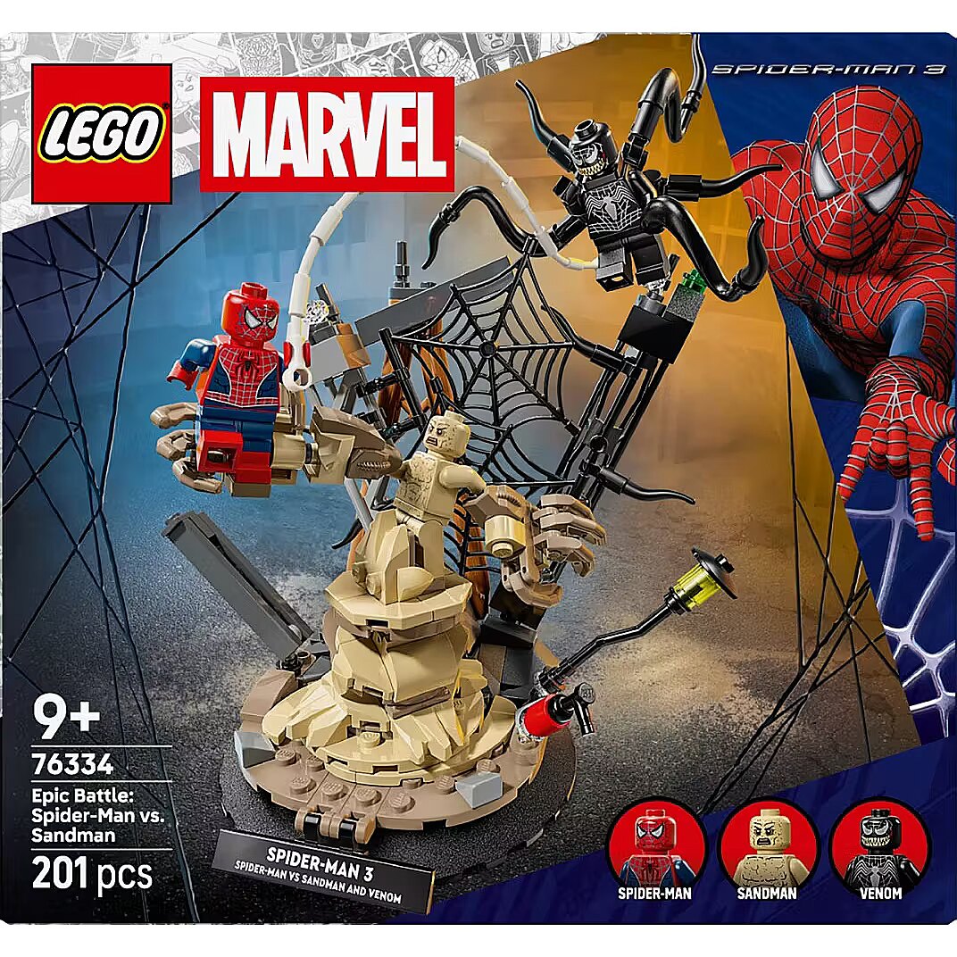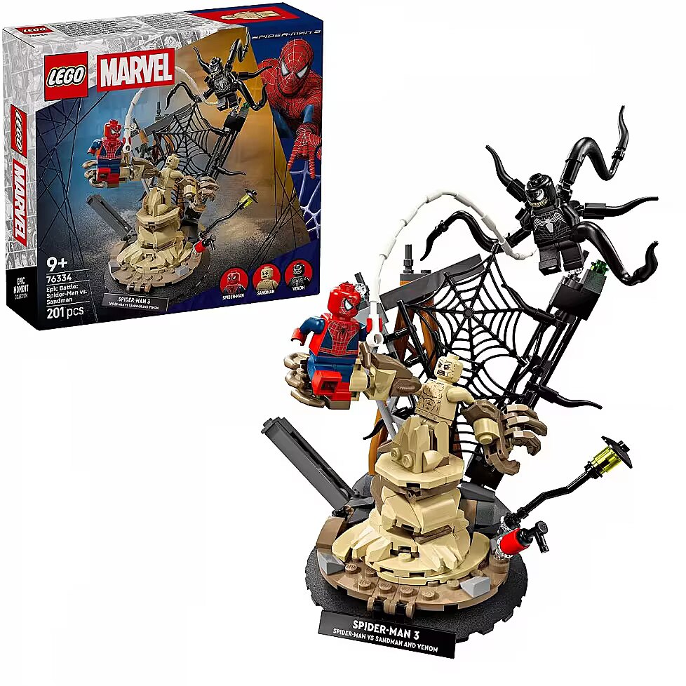 Description - Blocks Super Heroes 76334 Epic Battle: Spider-Man vs. Sandman Recreate scenes from the Marvel Studios film Spider-Man 3 with the LEGO Marvel Epic Battle: Spider-Man vs. Sandman set (76334), designed for boys and girls aged nine and up. The set includes three iconic minifigures - Spider-Man, Venom, and Sandman - perfect for acting out epic adventures and creating amazing scenes. This buildable set features outstanding characters from the movie and plenty of interactive elements: Spider-Man leaps from a tower on a web, Sandman rises from the rubble with a massive hand, and Venom attacks with four movable tentacles. Kids can display the LEGO model as a room decoration thanks to its sturdy base and nameplate, or detach the minifigures to invent their own stories during play. This set makes an excellent birthday gift for young superheroes, LEGO builders, and Spider-Man gadget fans. With the LEGO Builder app, kids can build with confidence by zooming in on models, rotating them in 3D, and tracking their progress using simple digital instructions. The set contains 201 pieces.