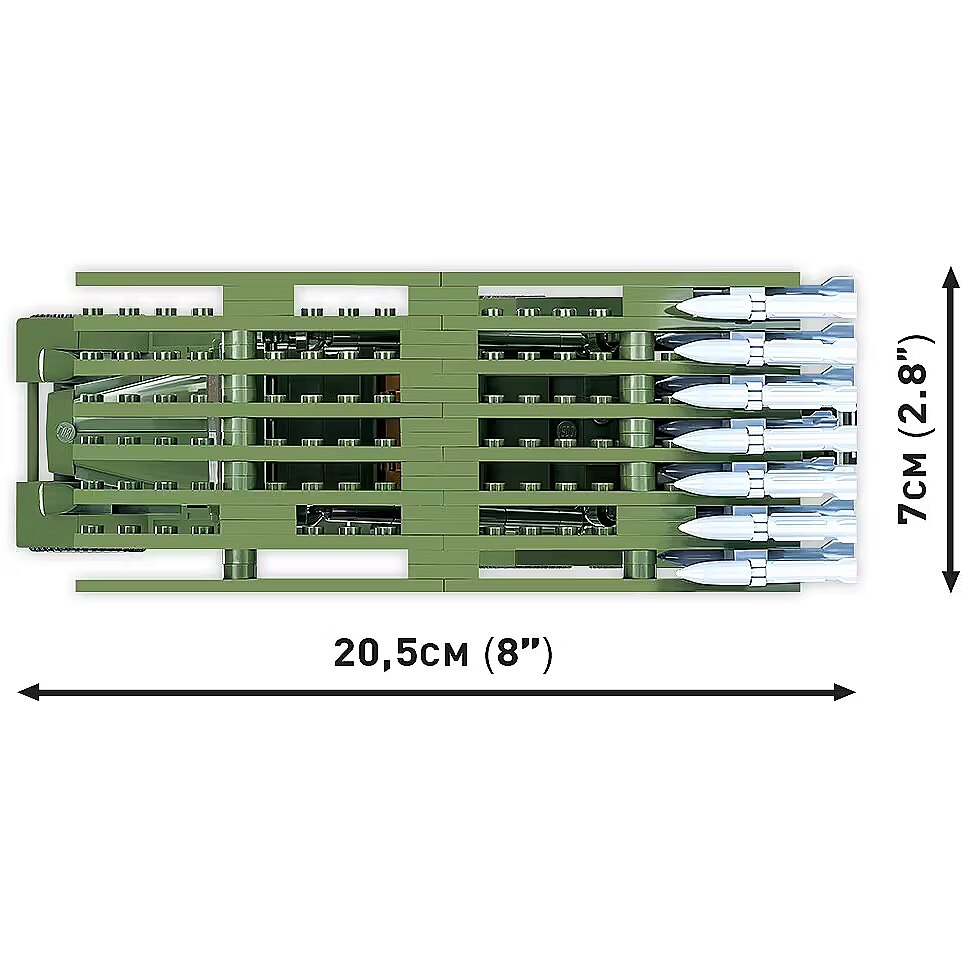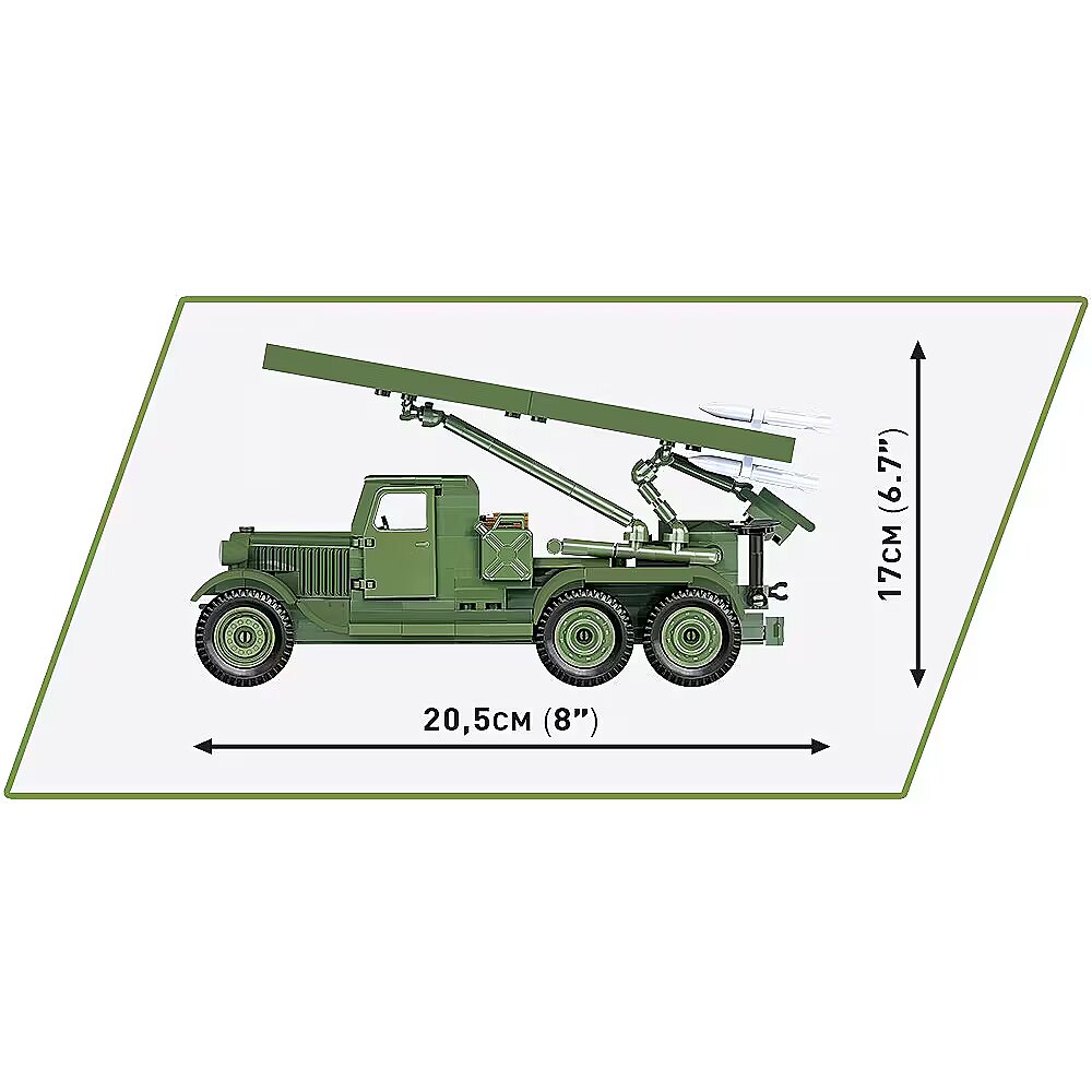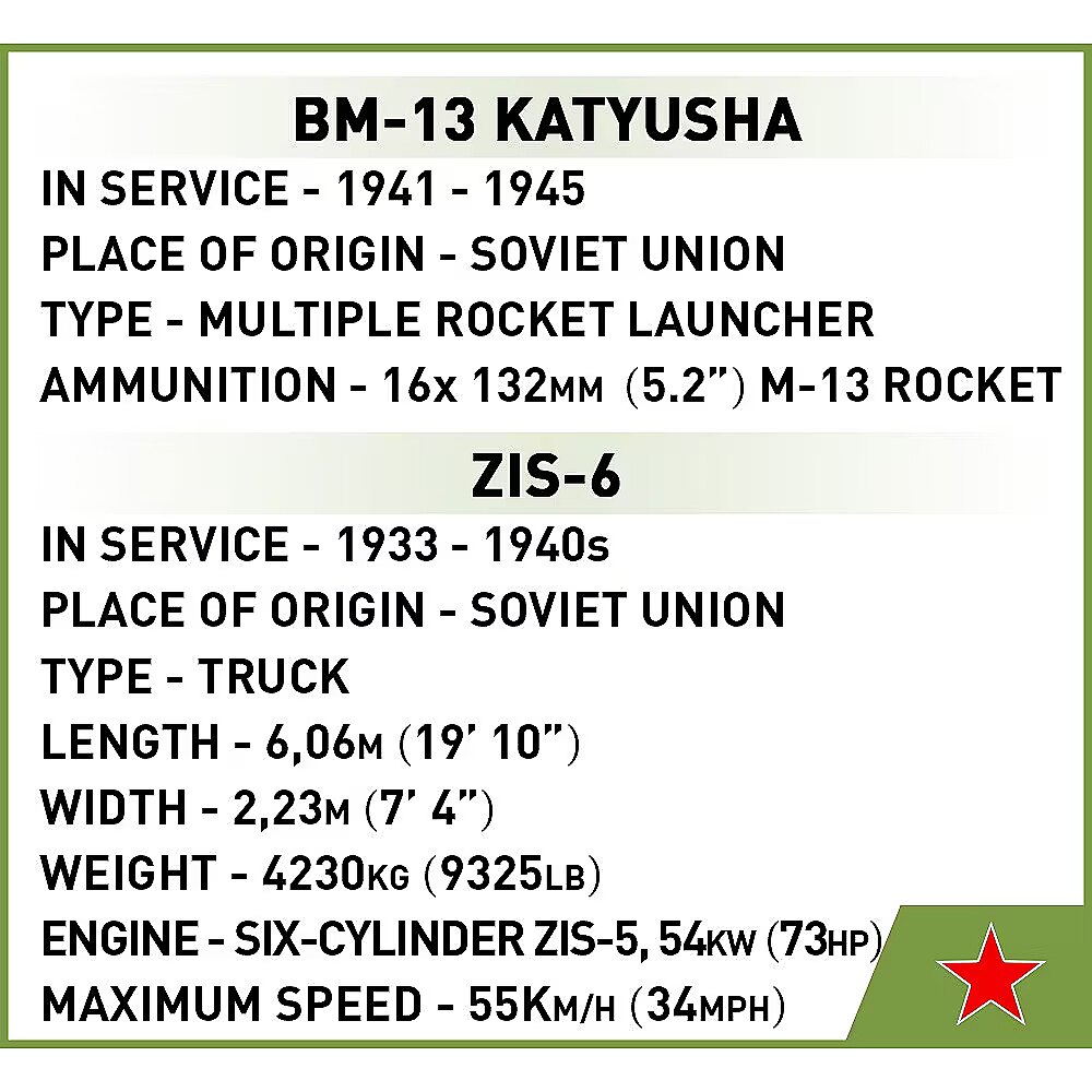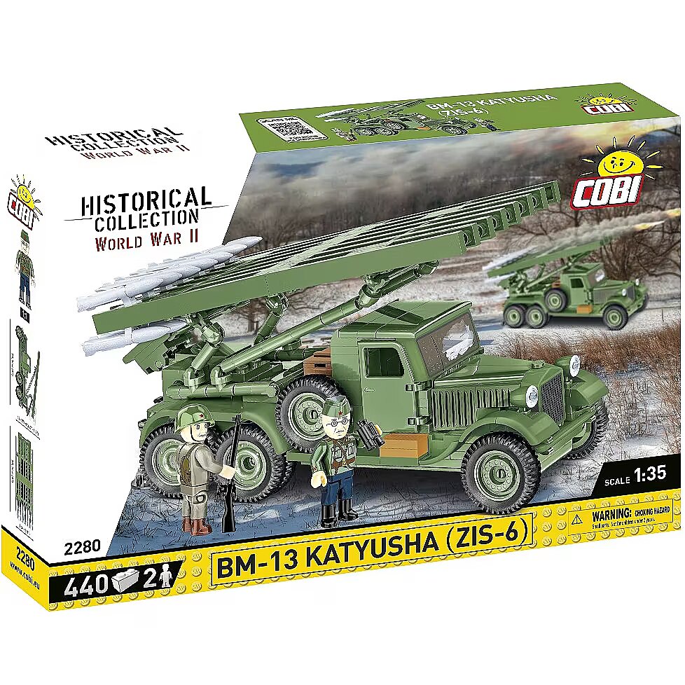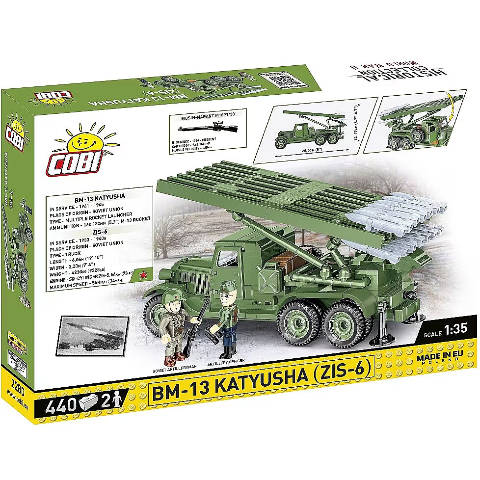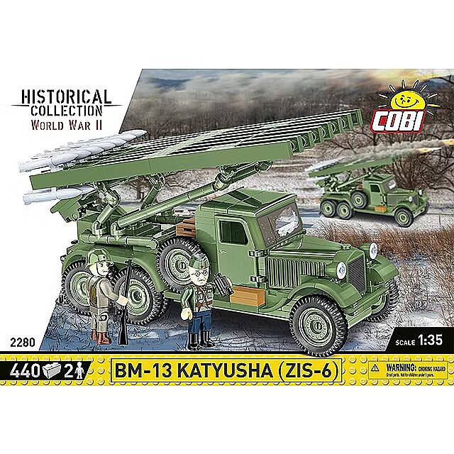 Description - Katyusha was a family of Soviet-made rocket launchers. Their combat use has been documented since mid-1941. Despite the low accuracy of the rockets, the shelling of the enemy position with the use of Katyushas was very effective thanks to its concentration on a relatively small area and the sheer number of rockets. Also, the shrill sound of launching missiles caused a justified panic in the ranks of the enemy. It is not without reason that the Germans called these weapons "Stalin's Organs. The BM-13 model was a rail-mounted rocket launcher mounted on the chassis of ZIS cars. The M-13 missiles were mounted in two rows, and their range, depending on the version, was over 9 kilometers.   The set of the famous BM-13 KATYUSHA rocket launcher was developed in a 1:35 scale that fits the COBI figures and consists of 440 building blocks. The use of the latest elements from the COBI catalog allowed faithful reproduction of the characteristic shapes of the original vehicle. The functionalities of the model are rotating wheels equipped with tires, adjustable launcher angle, opening vehicle cabin and detachable rockets! All graphic elements are high-quality prints. The figures represent Soviet soldiers from the launcher service. Both officer and enlisted figures have detailed prints on the back as well. Our 1:35 scale collection isnt complete without this set! Katyusha is one of the most recognizable and distinctive weapons used during the Second World War. Experienced builders will certainly use the truck chassis to build other variants of World War II vehicles in 1:35 scale. Build history, piece by piece, with COBI! 440 high-quality elements Produced in the EU by a company with over 20 years of tradition The blocks meet the safety standards of products for children Fully compatible with other brands of construction blocks Blocks with prints do not scratch or smear and do not fade during play or under the influence of temperature Clear and intuitive instructions based on illustrations and step-by-step directions Two figures - an officer and a private
