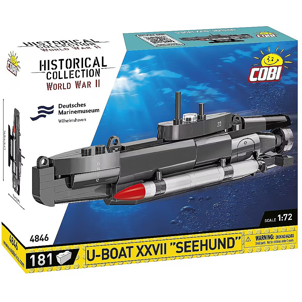 Description - COBI, together with the Deutsches Marinemuseum, has created a unique commemorative set in honor of the museum exhibit! Seehund (Type XXVII B) was a midget submarine produced in Germany at the end of World War II. Designed in 1944 and manned by a crew of two, it was used by the German Navy in the final months of the war. One of the few surviving ships is exhibited in the Deutsches Marinemuseum. The block U-Boot TYPE XXVII "SEEHUND" was developed in 1:72 scale. The 1:144 scale used so far for submarines turned out to be too small for such a small submarine. The use of the 1:72 scale made it possible to reproduce the characteristic shapes of a real ship. All graphic elements are high-quality, durable prints. The set includes a block display stand and a plate with the name of the set printed on it. Our Historical Collection isnt complete without this sub! Build history, piece by piece, with COBI. 181 high-quality elements Produced in the EU by a company with over 20 years of tradition The blocks meet the safety standards of products for children Fully compatible with other brands of construction blocks Blocks with prints do not scratch or smear and do not fade during play or under the influence of temperature Clear and intuitive instructions based on illustrations and step-by-step directions Display stand Name plate of the ship