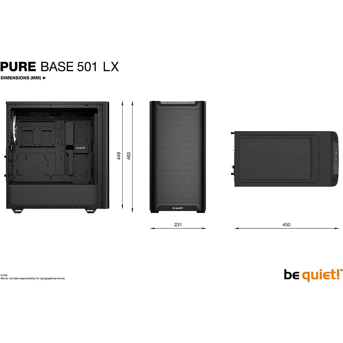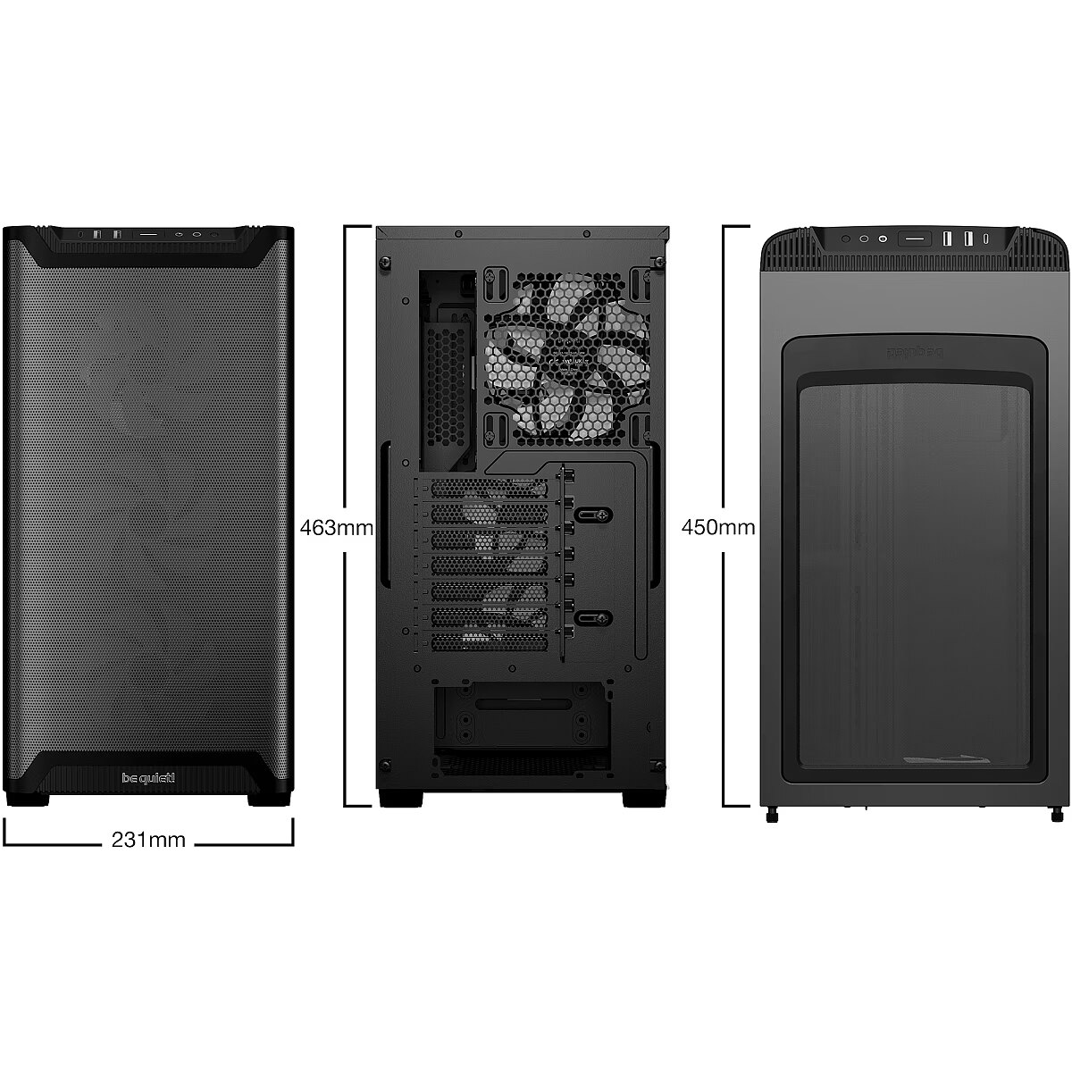 Summary - be quiet! Pure Base 501 LX Black. Form factor: Midi Tower, Type: PC, Product colour: Black. Supported power supply form factors: ATX, PS2. Front fans installed: 3x 120 mm, Front fans diameters supported: 120,140 mm, Rear fans installed: 1x 140 mm. Supported HDD sizes: 2.5,3.5". Width: 231 mm, Depth: 450 mm, Height: 463 mm