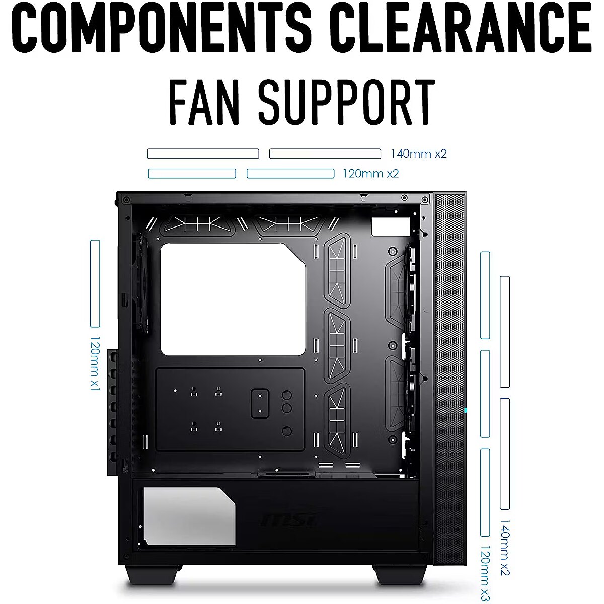 LongSummaryDescription - MSI MPG SEKIRA 100R 'S100R' Mid Tower Gaming Computer Case 'Black, 4x 120mm ARGB, Mystic Light Sync, 8 Channel ARGB Hub, USB Type-C, Tempered Glass Panels, ATX, mATX, mini-ITX'. Form factor: Desktop, Type: PC, Product colour: Black. Power supply location: Top, Supported power supply form factors: ATX. Front fans installed: 3x 120 mm, Front fans diameters supported: 120,140 mm, Rear fans installed: 1x 120 mm. Supported HDD sizes: 2.5,3.5". Width: 215 mm, Depth: 420 mm, Height: 475 mm