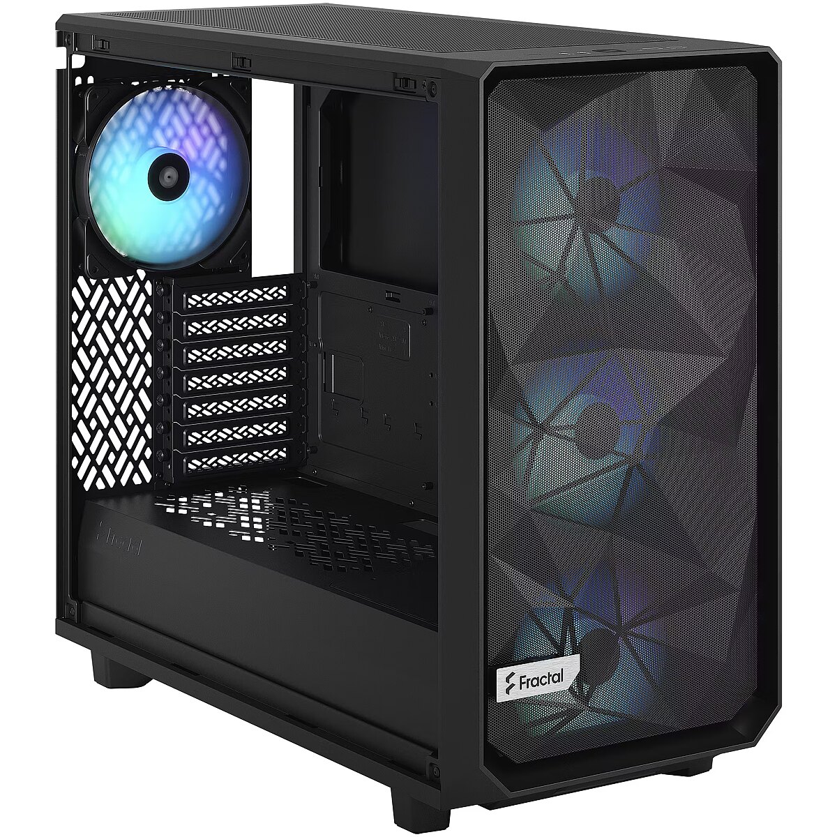 Technical_details - Meshify 2 Lite RGB Black TG Light Tint, tower case The Fractal Design Meshify 2 Lite RGB Black TG Light Tint PC Case is a high-performance case with an iconic, striking design. It impresses with a screwless tempered glass side panel, a spacious interior, a fully removable top panel for easy installation of the components, and a mesh front panel. It equally supports systems with many storage devices or multiple radiators for optimal cooling. Type: Tower case Color: Black EAN: 7340172703891 Manufacturer No.: FD-C-MEL2A-05 Design: midi tower Mainboard form factor: E-ATX Window Kit: Yes Mesh Front: Yes Internal dimensions: plug-in card length | maximum 450 mm Internal measurements: CPU cooler height | maximum 185 mm Internal dimensions: PSU form factor | ATX Drive bays: 3.5 inch | internal | 2 pieces Drive bays: 2.5 inch | internal | 2 pieces Slots: Full Size | 7 pieces Front connectors: 2x USB-A 3.2 Gen 1 (5 Gbit/s) Front connectors: The designation USB 3.2 Gen 1 corresponds to the former designation USB 3.1 Gen 1 / USB 3.0. Front: 3x 140 mm Aspect 14 RGB fans available, alternatively 3x 120 mm fans can be installed Rear: 1x 140 mm Aspect 14 RGB fan available, alternatively 1x 120 mm fan can be installed Notes: 3x 140mm or 3x 120mm fans can be installed on the top, 2x 140mm or 2x 120mm fans can be installed on the bottom, top and bottom (mesh front) Lighting: Yes, RGB Water cooling possible: Yes Water cooling possible: Supported radiators | Front: up to 360/280 mm, top: up to 360 mm, back: up to 120 mm, bottom: up to 280 mm More information: Integrated RGB controllers on the front I/O panel including the iconic Fractal Northern Lights effect Dimensions: Width: 240mm x Height: 474mm x Depth: 542mm Weight: 9.8kg