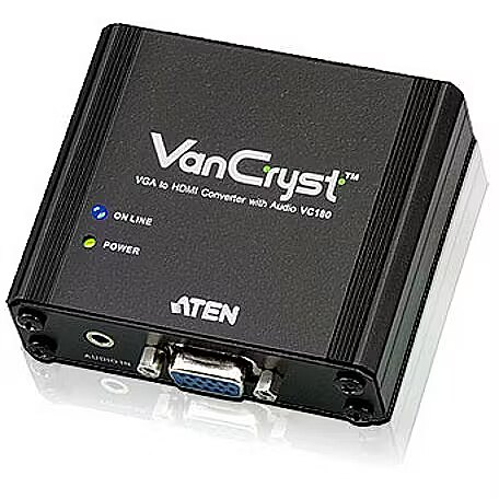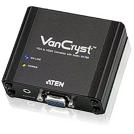 LongDesc - The VC180 is a VGA-to-HDMI Converter with Audio that lets you view VGA source data in an HDMI output display with stereo sound quality. It uses dual power sources – from the VGA port or a power adapter. The VC180 gets its power supply from the VGA port. However if your source device is not capable of supplying power, use the power adapter to connect the VC180 to a power source. The VC180 is compact, flexible and convenient to install – with no software required. Simply make the hardware connections and enjoy the experience.1x VC180 VGA to HDMI Converter with Audio 1x 0AD6-1605-09EG Power Adapter1x User Instructions