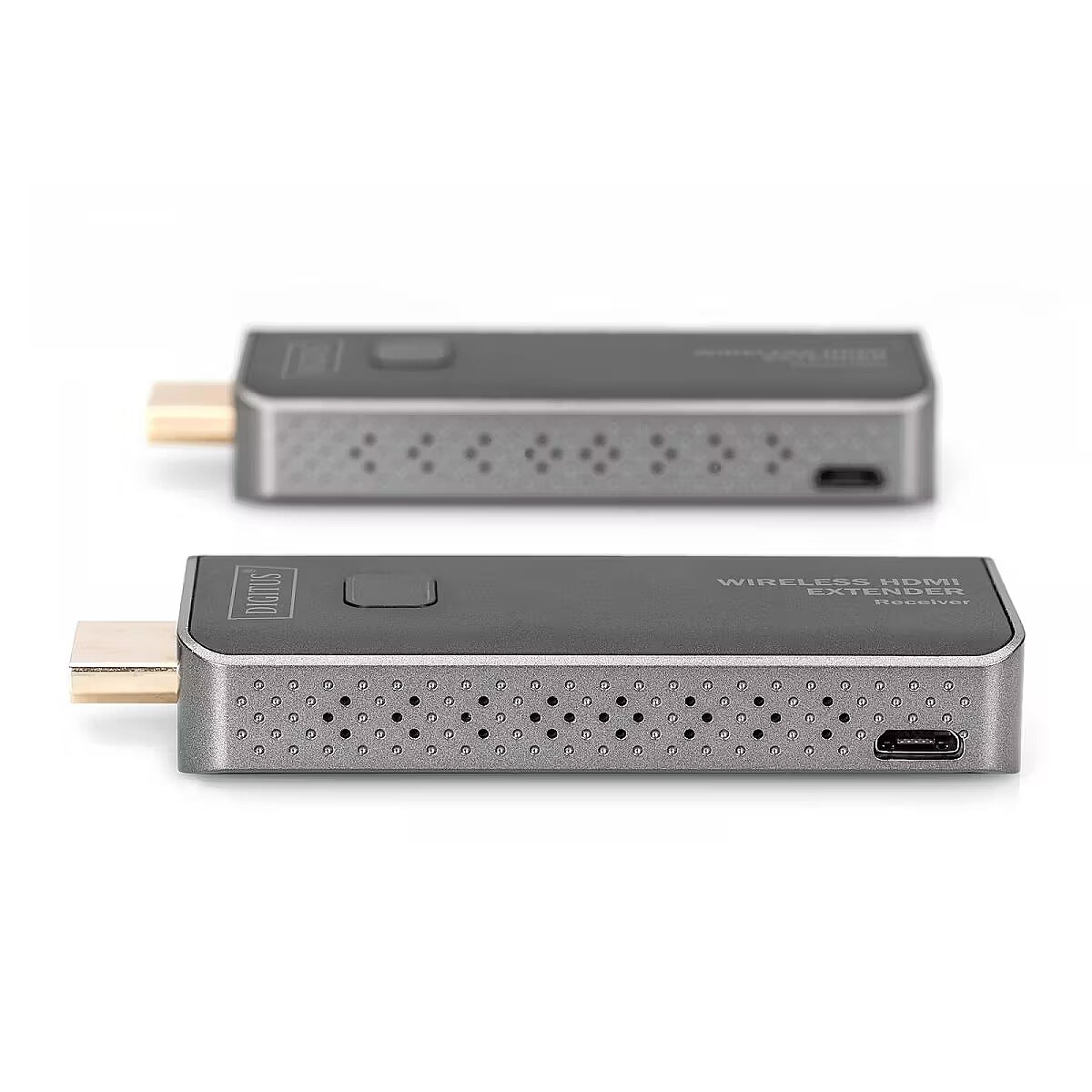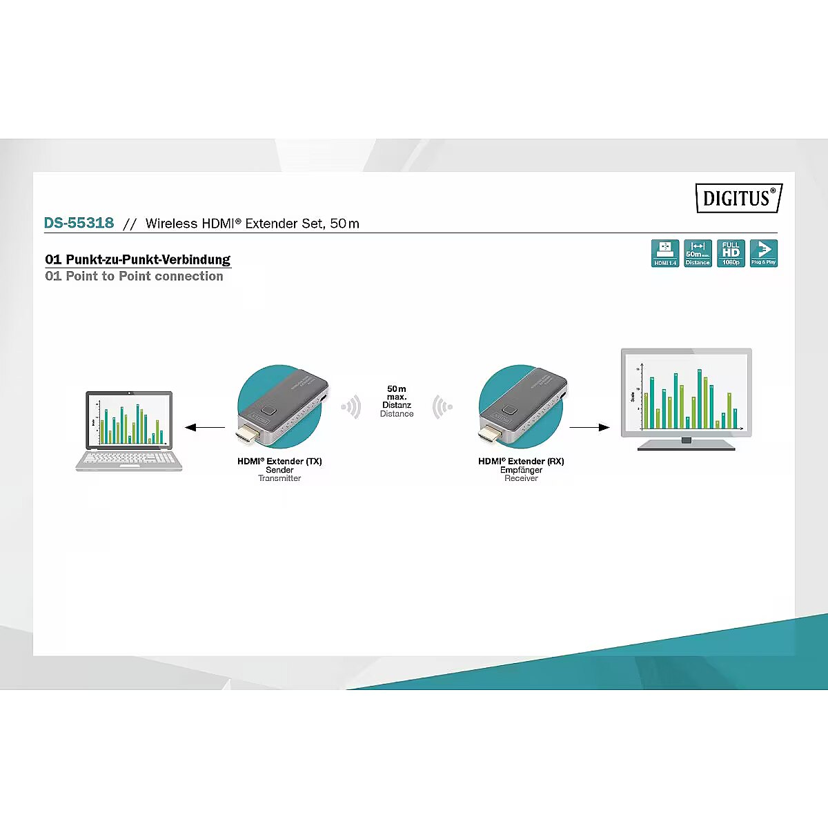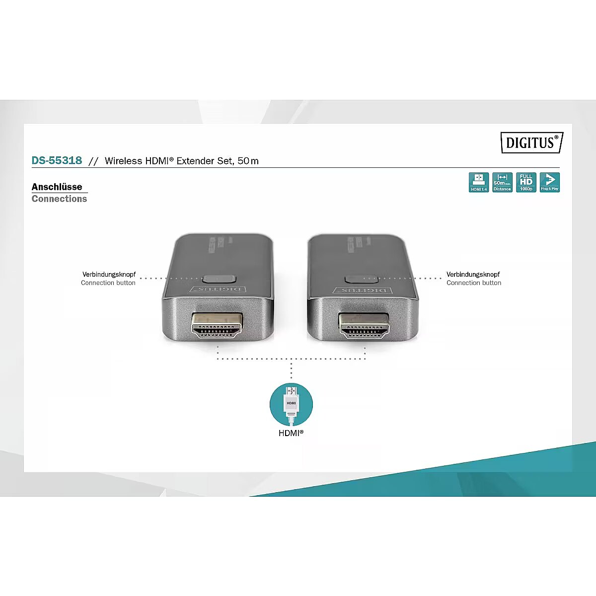 Description - Wirelessly transmit HDMI video and audio signals in Full HD up to 50m   With the Wireless HDMI Extender kit, you can wirelessly transmit HDMI video and audio signals up to 50m in a straight line without obstacles. Operation and installation are very simple. Plug & Play just plug and play. The transmitter and receiver can be powered via the HDMI connector of the user's device (0.5 A is required), alternatively (additionally) using the included micro USB cable via the USB port of a notebook, computer, etc. Thanks to the compact design of the transmitter and receiver, you can easily , quickly and individually installed, it is the ideal solution for meeting rooms. This can also be used for quick installations in the private application area. Wireless HDMI signal transmission up to 50 m (with no obstacles in a straight line) Supports resolutions up to 1920x1080p Multimedia streaming: The DIGITUS HDMI extender kit, which is based on radio technology, wirelessly transmits audio and video signals in full HD quality (1080p/60 Hz) No software to install: Simply connect the pre-paired transmitter and receiver modules to the source device and receiver respectively to establish a connection Range: In the absence of physical obstacles, the signal transmission range is up to 50 m, while in the case of physical obstacles, the transmission range cannot be clearly defined and depends on local conditions Uses in the private area and at work: The streaming solution is suitable for longer or short video transmissions (meeting rooms, conference rooms, presentations)