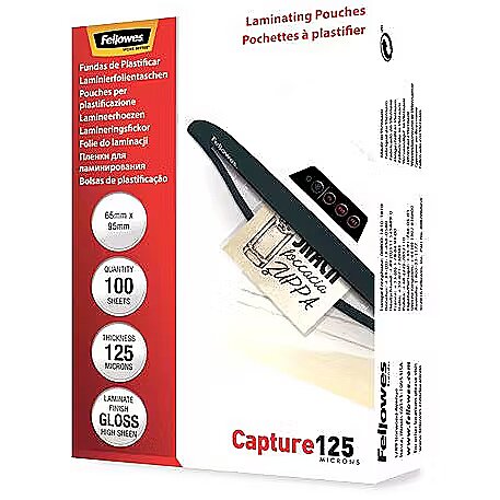 Name - Fellowes | Laminating Pouch - 65x95mm | Glossy | Ideal for identity cards, credit cards, business cards and visitor cards; Capture 125 Micron thickness - providing an advanced level of document protection; Pack size of 100; Compatible with all laminator brands