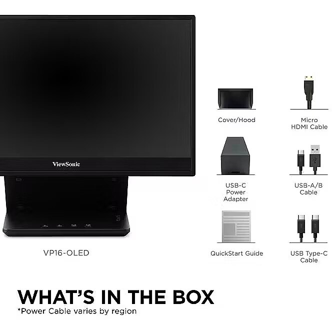 LongDesc - The ViewSonic® ColorPro™ VP16-OLED is a 15.6” portable monitor with native Full HD 1080p resolution and advanced OLED technology for incredible visual performance on the go. The VP16-OLED is Pantone Validated and factory calibrated to deliver richer color uniformity and enhanced details, ensuring that it meets the demands of professional content creators. A flexible and foldable ergonomic stand delivers easy height adjustment for the perfect viewing angle in a variety of environments. A convenient tripod mount is integrated into the stand so that the display can be used as a high-quality photo or video preview screen for fine adjustments in the field, while a protective screen cover also doubles as a shading hood for a “dark room” effect. In addition, versatile connectivity options include two USB-C ports for 2-way charging, as well as mini HDMI and a headphone jack.Beautiful Visual PerformanceEvery pixel in this OLED screen is individually lit by a series of light-emitting diodes. This delivers better contrast, higher brightness, wider viewing angles, a broader color range and much faster refresh rates when compared to standard LCD monitors.Portable PowerhouseMeasuring less than 1-inch thick, and weighing about 2 pounds, this compact monitor is ideal for on-the-go creators and can be stowed into backpacks and laptop cases – giving you an additional screen to work effectively from nearly anywhere.Versatile ViewingAn ergonomic height-adjustable stand provides more comfortable viewing angles for nearly any working position. The stand also includes a tripod mount for additional versatility.Pantalla Validada por PantoneFor professionals who require color fidelity, Pantone™ Validated ViewSonic® displays offer pinpoint color accuracy.Each Pantone Validated display has been rigorously tested and deemed capable of reproducing the Pantone Matching System (PMS) Colors. Whether it’s video editing, graphic design or other jobs where color is critical, these certified displays are built to eliminate guesswork and help you create with confidence, so you can finish your assignments with flying colors.On-the-Go ChargingWith USB-C 40W two-way power, this monitor can be powered by a laptop, or it can deliver power to a laptop or mobile device via pass-through charging when plugged into a USB-C power bank or AC adapter and outlet.Monitor Hood and Screen CoverAn included detachable monitor hood blocks ambient light, reduces screen glare, and helps you see colors more accurately—making this portable monitor ideal for outdoor use or as a dark room on the road. When not in use, the hood doubles as a protective screen cover.