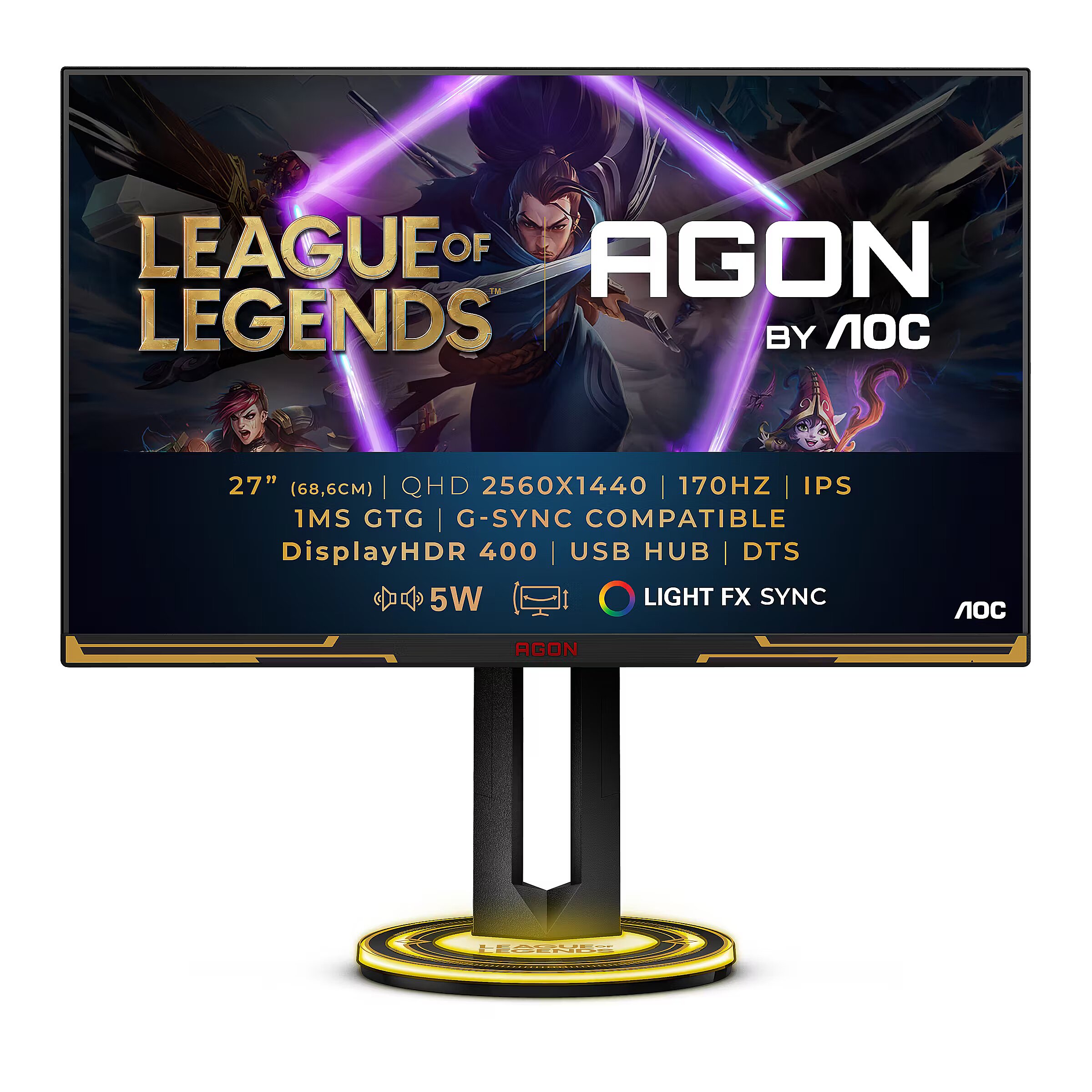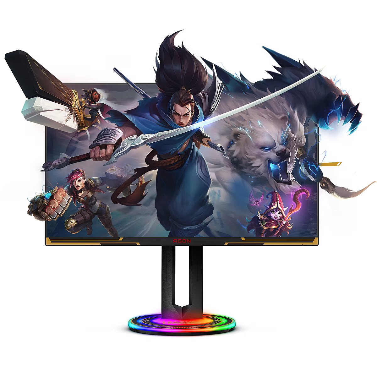 LongDesc - League of Legends x AGON by AOCReady to gain ELO in style? The AOC AGON 27” League of Legends Edition is waiting to accompany you through your next big fights. Equipped with the best specs for MOBAs and embellished with a unique design, this monitor will upgrade your battle station and your in-game experience alike!
