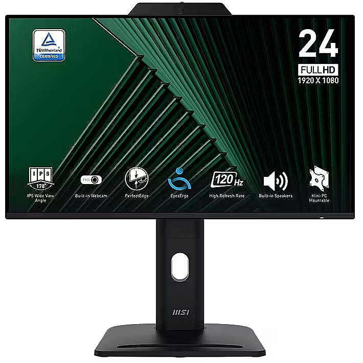 ShortSummaryDescription - MSI Pro MP242PMG 23.8 Inch Monitor, FHD (1920 x 1080), 120Hz, IPS, 1ms, 1x HDMI 1.4b, 1x DP 1.2a, 1x D-Sub(VGA), 2xUSB 5Gbps Type-A, 1x USB 5Gbps Type-B, Built-in Speakers, Webcam, Anti-Glare, Anti-Flicker, Less Blue light, TÜV Certified, VESA, Kensington, Black, 60.5 cm (23.8"), 1920 x 1080 pixels, Full HD, LCD, 4 ms, Black