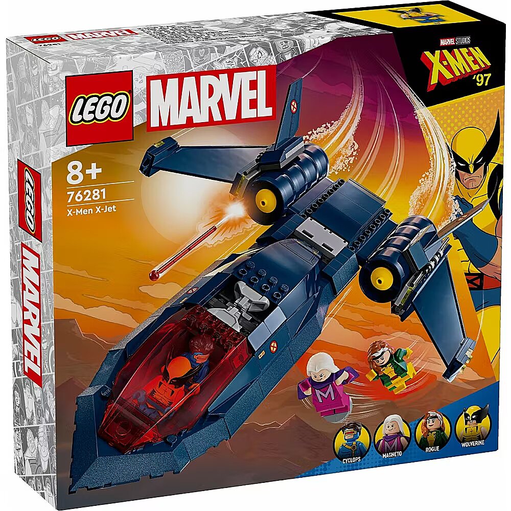Technical_details - The X-Men are coming - with this LEGO set from the Marvel Super Heroes series. It contains an approximately 30 centimeter long replica of the X-Men's X-Jet from the "X-Men '97" series and offers many play options. The model features two cockpits for 4 minifigures, two shooters on both sides and two spring-loaded shooters under the wings. There are two containers on board in which spare projectiles and Wolverine's claws can be stored. Four minifigures are included in this set: Cyclops, Rogue, Magneto and Wolverine. A great set for superhero fans ages 8 and up that offers lots of building fun with 359 pieces. Item no.: 100012431 Kind of construction toy EAN 5702017590318 Manufacturer no. 76281 Marvel Super Heroes series Parts 359 pieces Age recommendation from 8 years Target group school children Material: Plastic Warnings Warning: Not suitable for children under 36 months! Caution: Danger of suffocation due to small parts that can be swallowed! Further information The buildable jet measures over 8 cm high, 30 cm long and 25 cm wide.