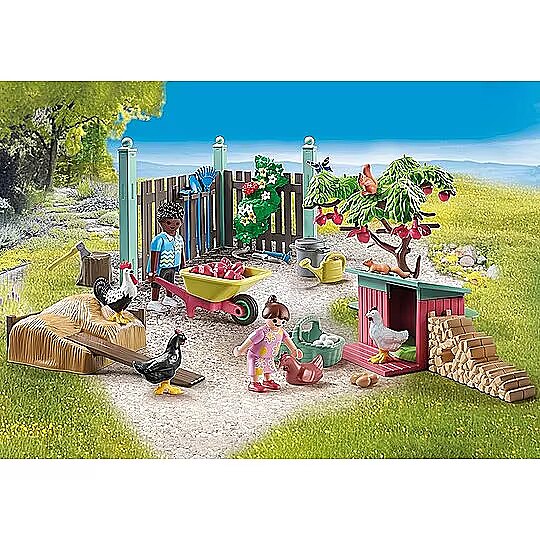 Description - Which came first, chicken or egg? In the Tiny House garden, there is a lot to discover about self-sufficiency: from keeping chickens to harvesting fruit and gardening. An exciting journey of experience. Discover farm fun with the PLAYMOBIL chicken coop Bring farm life to your childs playtime with the PLAYMOBIL Small Chicken Farm set! This delightful set includes a rooster, hens, and a coop for exciting farm adventures. Kids can collect eggs, tend to the chickens, and even harvest apples from the tree. With over 80% recycled and bio-based materials on average, this set is fun while encouraging children to explore self-sufficiency and environmental care. Bring the joy of farming to life The PLAYMOBIL Small Chicken Farm lets kids experience the fun of taking care of animals and farming. With a rooster, hens, and a cozy chicken coop, they can imagine gathering eggs, feeding the chickens, and keeping the farm tidy. This charming playset encourages imaginative play, as children take on the role of a farmer tending to their chickens and garden. Packed with farm-themed accessories The set includes plenty of accessories for endless play. From the apple tree with harvestable apples to a variety of garden tools, children can immerse themselves in farm life. Tools like a shovel, rake, and wheelbarrow add an extra layer of realism, making play both engaging and educational. Sustainability meets fun with PLAYMOBIL Tiny House Made from over 80% recycled and bio-based materials on average, the PLAYMOBIL chicken coop set is part of the Tiny House play world. This set not only provides fun but also introduces kids to the concept of sustainability through hands-on play.