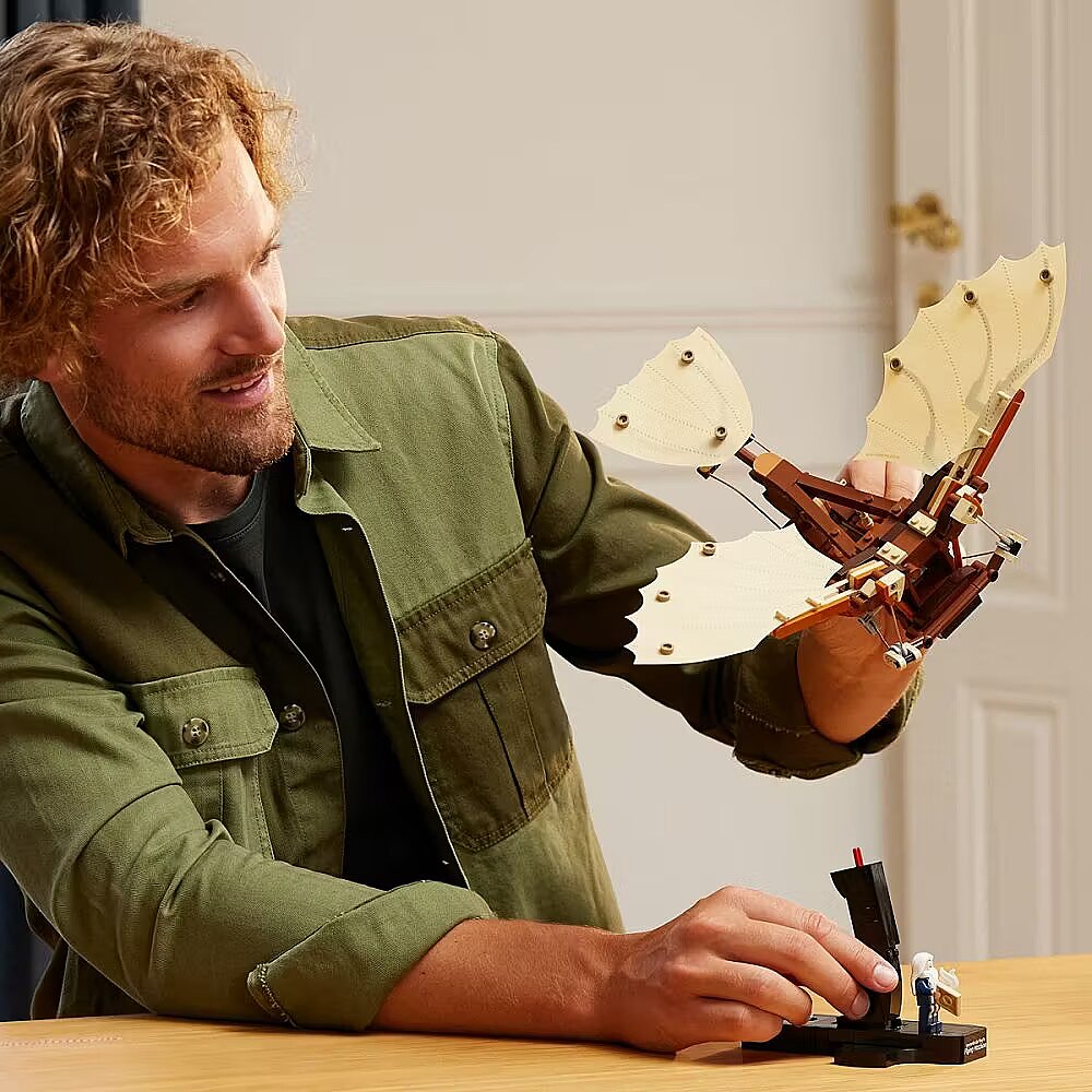 Take time out for a mindful building project with this collectible LEGO ornithopter set, a great Christmas or birthday gift idea for science and history enthusiasts. Discover the inspiring range of LEGO creative building sets designed specifically for adults. Da Vinci ornithopter building set for adults Immerse yourself in the history of aeronautical innovation with the LEGO Icons Leonardo da Vincis Flying Machine building project for adults Whats in the box Everything you need to craft a detailed LEGO interpretation of da Vincis visionary ornithopter, plus a display stand and a Leonardo da Vinci minifigure holding a quill and sketch Trigger-activated wings Recreate Leonardo da Vincis flying machine with its flappable textile wings and tail driven by an intricate, visible mechanism of string, hinges and pulleys Home and office desk decor Add a striking centrepiece to the home or office with this detailed display model depicting Leonardo da Vincis Flying Machine A LEGO gift for history-lovers Celebrate a birthday or special occasion with this gift for history-lovers and fans of aviation and historic innovation 3D building instructions Get ready to build like never before with the LEGO Builder app, where you can save sets, track your progress, zoom in and rotate your model in 3D Building kits for adults Discover a space for relaxation with the inspiring range of LEGO building sets (sold separately) designed specifically for adults Dimensions The model flying machine in this 493-piece building set measures over 25 cm (10 in.) high, 29 cm (11.5 in.) long and 35 cm (13.5 in.) wide