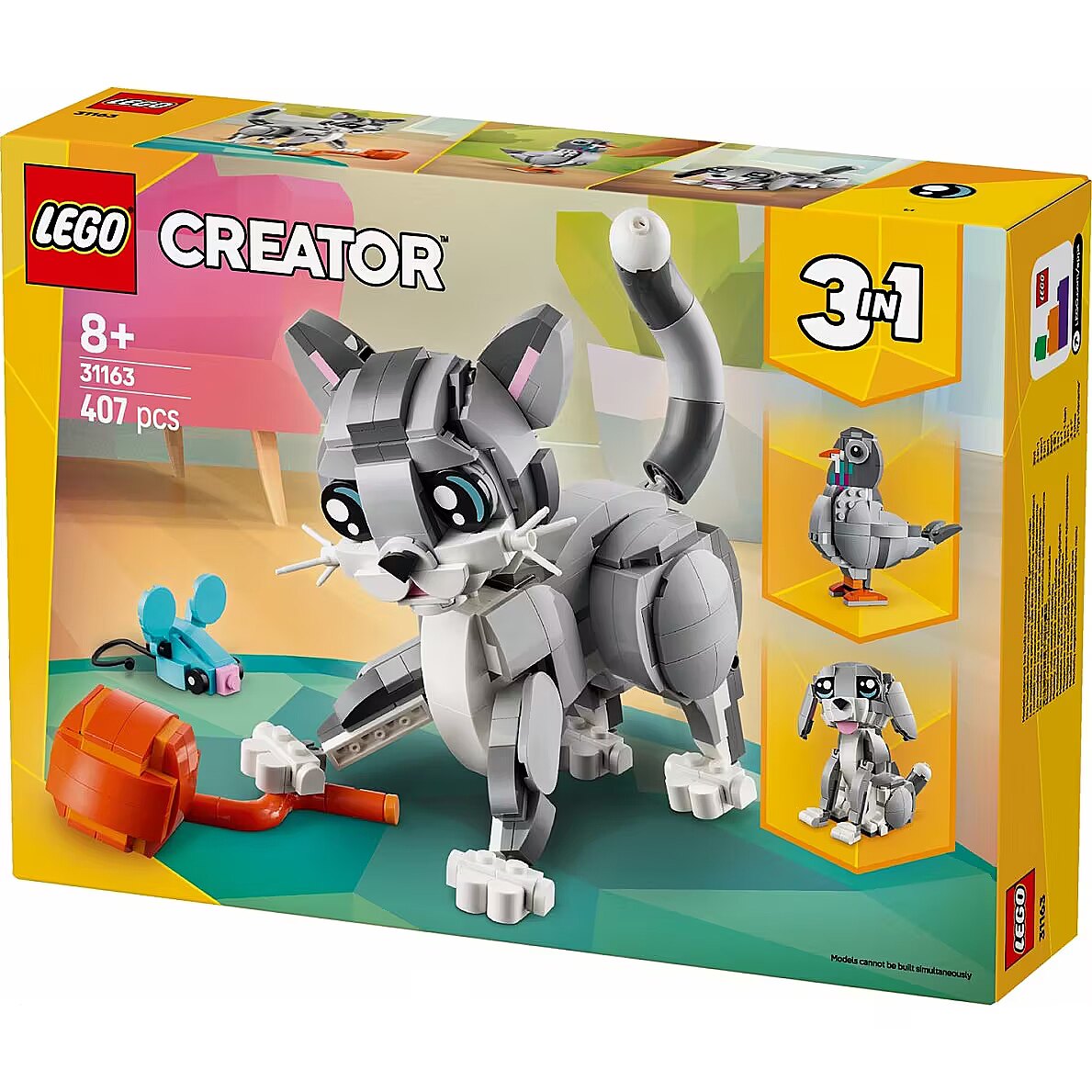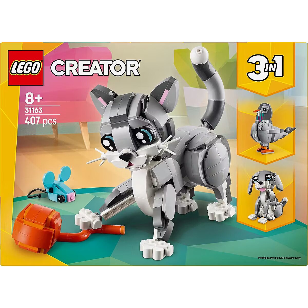 Description - Treat pet-lovers aged 8 and up with this adorable LEGO Creator 3in1 Playful Cat (31163) building set. The pet toy set features a cute cat toy with a posable head, ears, tail and legs, and accessories including a food bowl, toy mouse and ball of yarn, so kids can play out fun-filled stories. Girls and boys can build 3 different LEGO animal playsets with the same bricks: a posable cat toy who can sit, stand and pounce; a posable cute dog toy with a bone; and a pigeon toy with breadcrumbs. All 3scenes make this a great LEGO gift for kids to display and enjoy imaginative play. LEGO Creator 3in1 sets inspire kids imaginations with 3 different building options in every box. They will be excited to build, rebuild and build again. 3in1 sets offer a range that appeals to kids biggest passions, including superfast vehicles, amazing animals and detailed houses. Please note that models cannot be built simultaneously. 3 pet toy building options for kids in 1 box The LEGO Creator 3in1 Playful Cat building set lets girls and boys aged 8 and up build and rebuild 3 different animal playsets with the same bricks Endless animal play options Kids can choose exciting adventures with 3 different pet sets (models cannot be built simultaneously): a Playful Cat toy, a cheerful dog toy and a curious pigeon toy Highly posable pet toys The cat toy can move its head, ears, tail and legs; the dog figure can move its head, tail, legs and paws; and the cute pigeon toy can fully rotate its head Accessories for play and display The cat toy has a food bowl, mouse toy and yarn, the dog model has a bone, and the pigeon toy can peck at a pile of breadcrumbs Petgift for kids This 3in1 toy provides a fun build-and-play experience for little builders and can be given as a birthday or holiday gift More 3in1 fun Enjoy even bigger adventures with other sets (sold separately) from the LEGO Creator 3in1 range LEGO  Creator toys Every 3in1 set lets kids build 3 different models inspired by their biggest passions, including animals, vehicles and houses Measurements This 407-piece LEGO animal set features a buildable cat toy measuring over 3 in. (8cm) high, 5.5 in. (15 cm) long and 5.5 in. (15 cm) wide