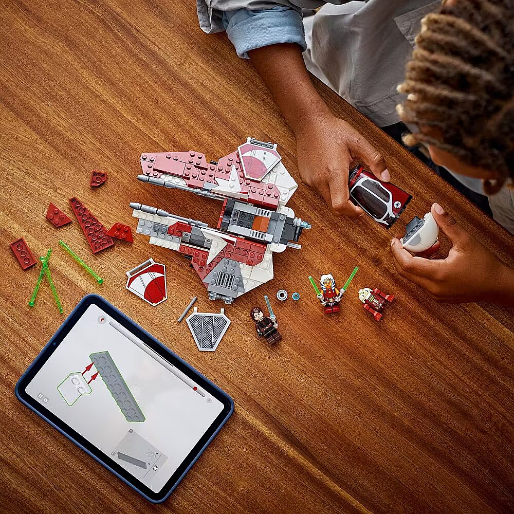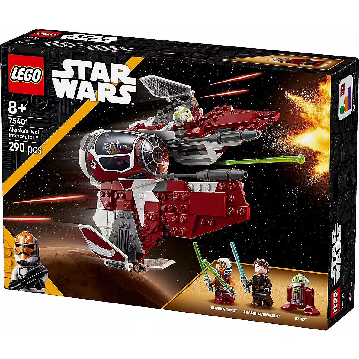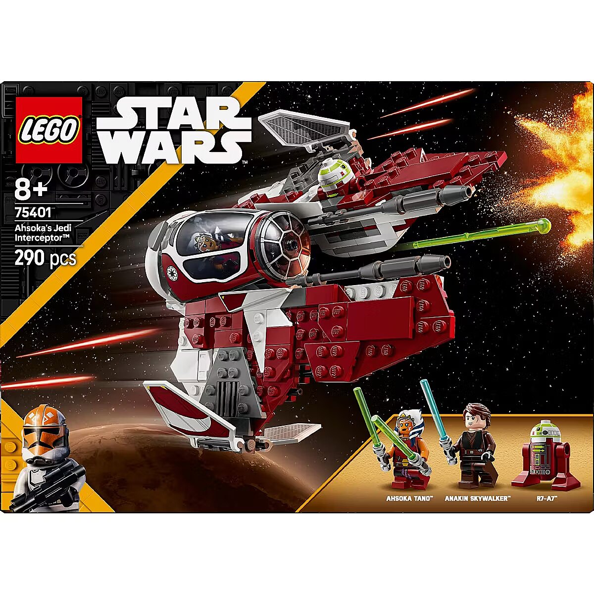 Description - Let kids create their own exciting Star Wars: The Clone Wars adventures with Ahsokas Jedi Interceptor Starfighter Building Toy (75401). A cool LEGO Star Wars  gift idea for boys, girls and fans aged 8 and up, this brick-built Jedi Interceptor features an opening cockpit, adjustable wings for attack and cruise modes, and 2 spring-loaded shooters. The buildable playset includes 2 LEGO Star Wars minifigures Ahsoka Tano and Anakin Skywalker with Lightsabers plus an R7-A7 LEGO droid figure for fantasy play. Ahsoka can be placed in the Jedi Interceptors cockpit, and theres room on board for R7-A7 and storage for Ahsokas Lightsabers. Enhance kids creative experience with the LEGO Builder app, where they can zoom in and rotate a digital 3D version of the Star Wars starship as they build. This buildable Star Wars vehicle toy is great to play with on its own and it can also be combined with other LEGO Star Wars sets (sold separately) in the extensive range. Jedi Interceptor starfighter building toy for kids Play out thrilling missions with this detailed LEGO brick-built model of Ahsokas Jedi Interceptor, as seen in Star Wars: The Clone Wars 2 LEGO Star Wars minifigures This buildable playset includes Ahsoka Tano and Anakin Skywalker, plus an R7-A7 LEGO droid figure Star Wars  starship The Jedi Interceptor has an opening cockpit for Ahsoka Tano, a space for R7-A7, adjustable wings, 2 spring-loaded shooters and storage for Ahsokas 2 Lightsabers LEGO brick-built fantasy set Ahsoka Tano has 2 green Lightsabers and Anakin Skywalker has a blue Lightsaber for action play Star Wars gift idea for kids aged 8 and up This LEGO Star Wars buildable toy vehicle makes a fun everyday gift or treat for creative boys, girls and any young Star Wars: The Clone Wars fans A helping hand Using the LEGO Builder app, kids can zoom, rotate and visualize a digital version of this construction model as they build, track their progress and save sets Explore the range Collectible LEGO Star Wars sets (sold separately) enable kids and adult Star Wars fans to recreate classic scenes, create their own stories or simply display the buildable models Dimensions The LEGO Star Wars vehicle in this 290-piece set measures over 2.5 in. (6 cm) high, 7.5 in. (19 cm) long and 6.5 in. (17 cm) wide