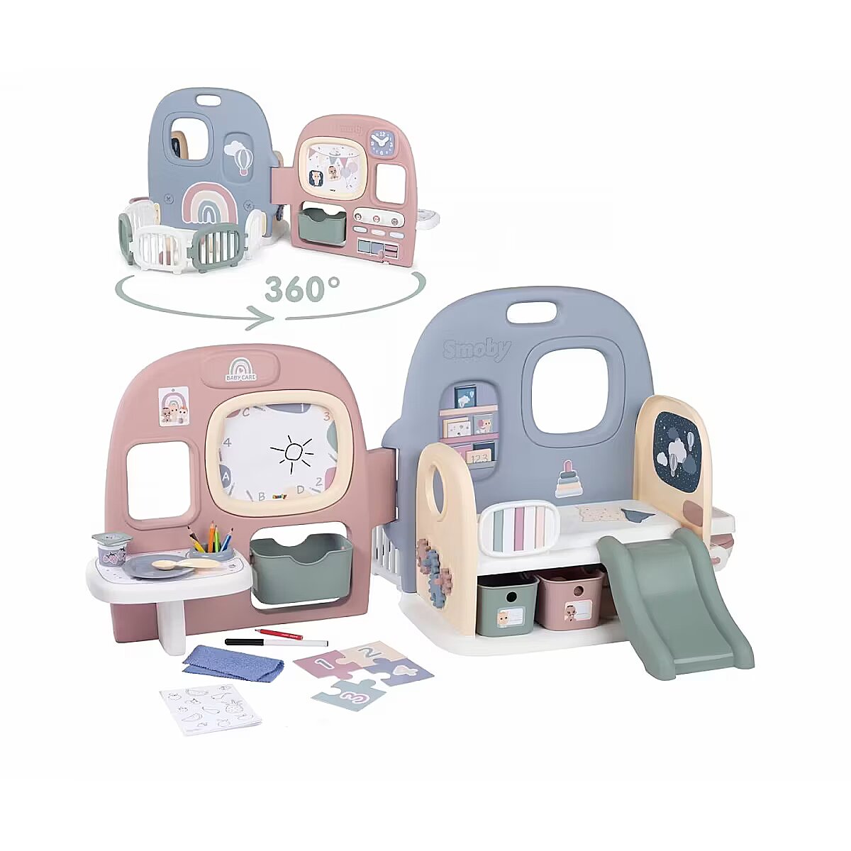 Description - Smoby Baby Care Play Corner The 5-in-1 Smoby Baby Care play area is double-sided and multifunctional. It combines up to 5 play areas in one product. The compact doll's house contains 5 zones - play area with playpen and balls; dining room; hall with clock, changing room with clothes hangers, bedroom and toilet with sink. Two-sided toy - one side consists of a dining area with table and study area with blackboard and a bedroom with cot and slide, the other side contains a toilet and play area for the toddlers. Many play options and numerous extras to add variety to the play - includes a total of 27 accessories, including markers, crayons, puzzles, balls, plate, spoon, yoghurt, cloth, colouring block, which can be neatly stored in the storage compartments. MADE IN FRANCE Develops empathy: Smoby Baby Care Play Corner allows your child to play the role of carer for the doll. Your child can nurse, feed and care for their doll, which helps develop empathy and understanding of the needs of others. Develops organisational skills: The play corner contains many accessories for tidying and organisation. Your child can practise tidying and organising skills, which may come in handy in the future. Group play: This play area from Smoby is great for group play, allowing children to practice social skills. Smoby is a parent-appreciated toy brand from France that has made it a priority to promote the healthy development of children since 1924. The reputation of the Smoby brand has been built on adherence to strict production standards for toy safety. Many years of experience and the use of high-quality materials as well as a high level of environmental awareness confirm its expertise. The variety of the Smoby range consists of durable and safe children's houses, garden toys, rides, play areas or Little Smoby educational toys for babies. Set for dolls up to 42 cm in height.