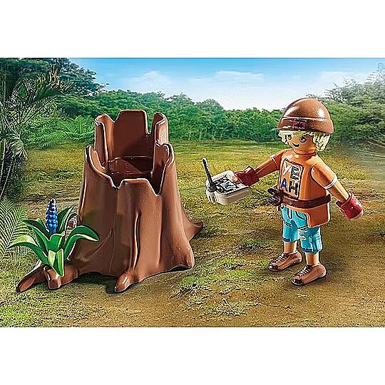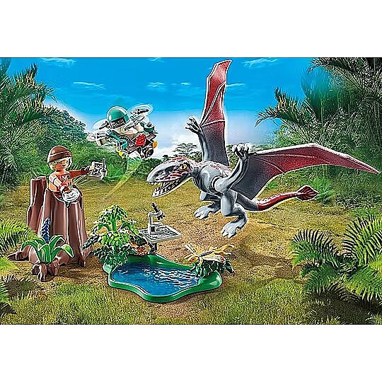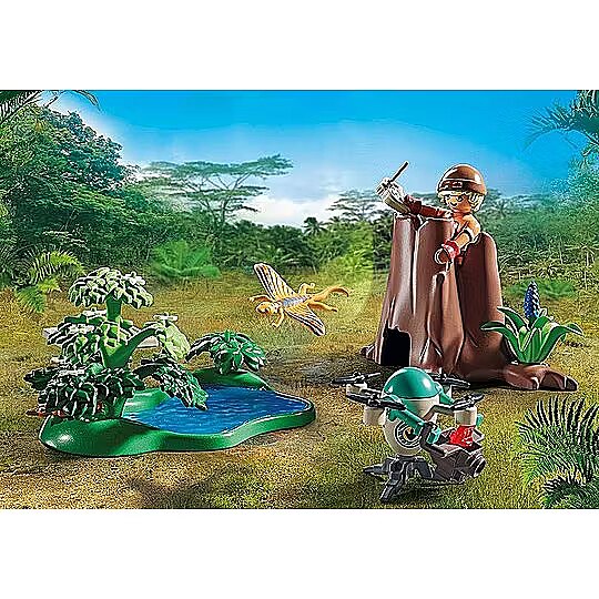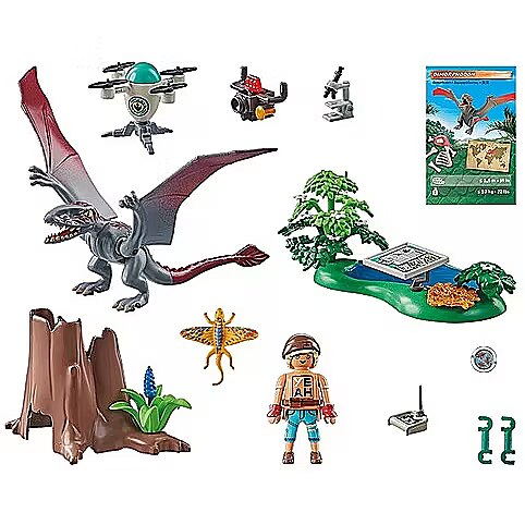 Accessories included - Figures: 1 man; Animals: 1 dimorphodon, 1 flying lizard; Accessories: 1 tree stump with plant, 1 pond with plants, 1 microscope with table, 1 petri dish, 1 drone with camera, 1 remote control, 1 cap; 1 dinosaur knowledge card