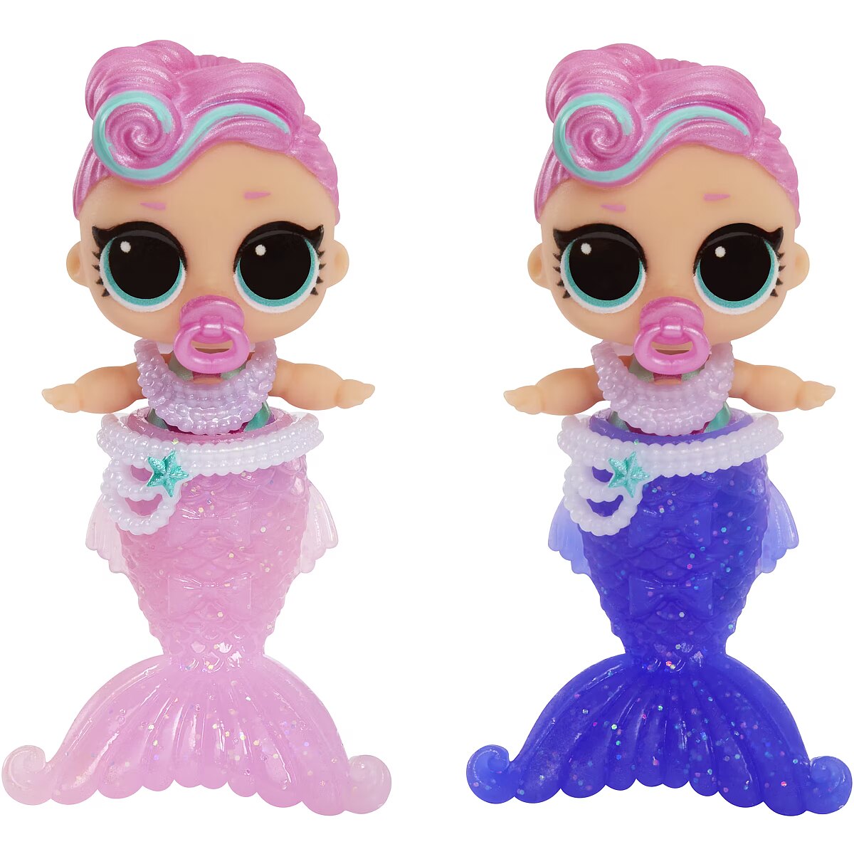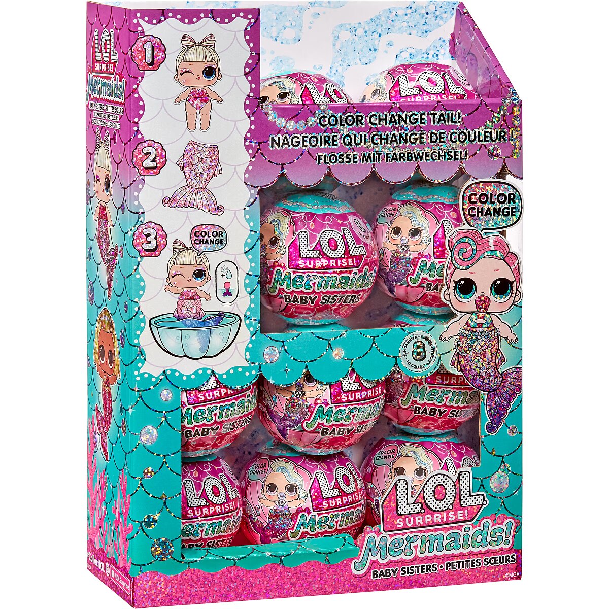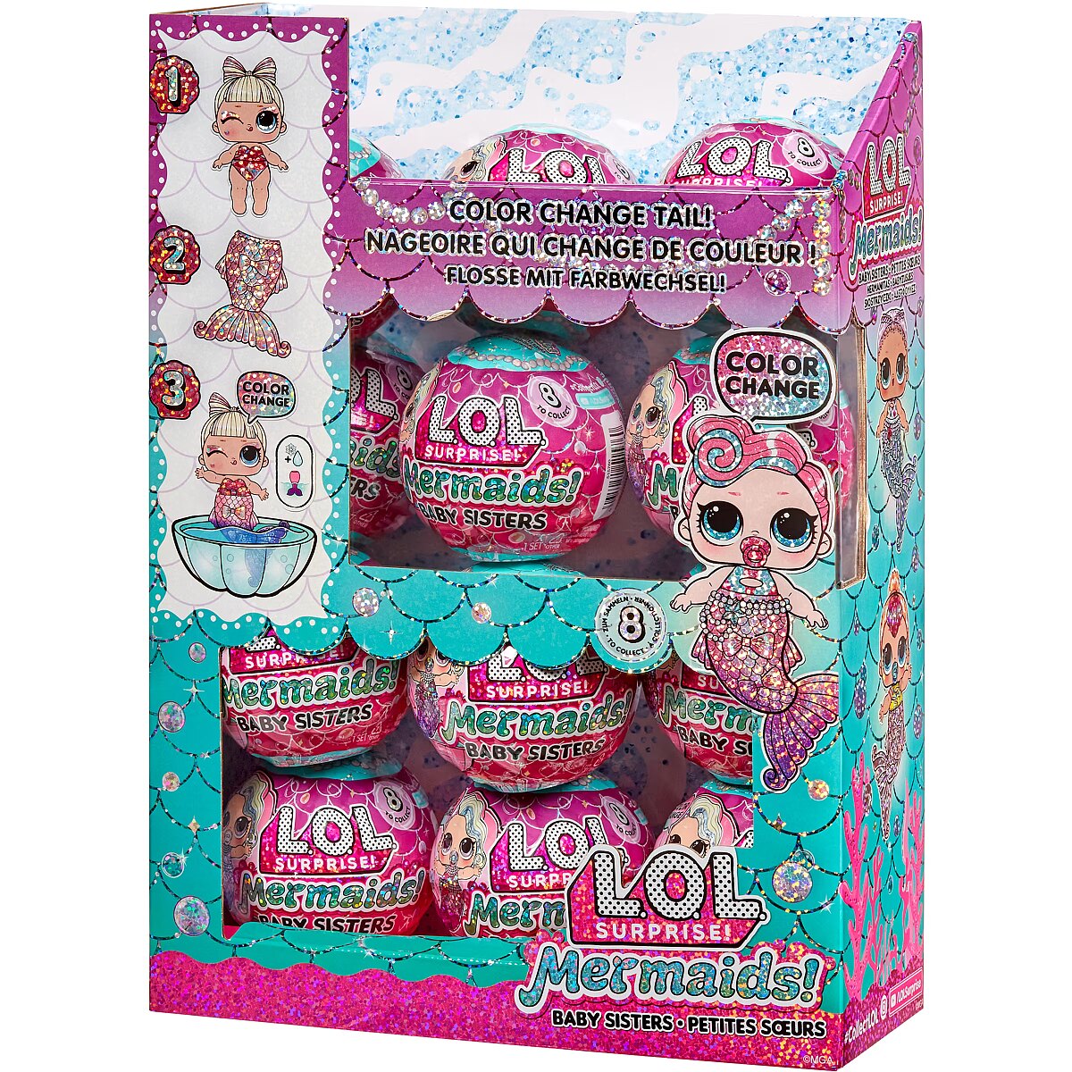 LongDesc - Get ready to make a splash with the adorable L.O.L. Surprise! Mermaids!™ Baby Sisters with color change tails! Once your Baby Sisters dolls are dressed in their stunning Mermaids tails, dip them in cold water to reveal a gorgeous color change! Discover what’s inside with fun mermaid-themed accessories. Show your Mermaids Baby Sisters dolls off and carry them around in their L.O.L. ball, which doubles as a clamshell display for your cute mermaids! Collect all 8 LOL Surprise Mermaids Baby Sisters and round out a world of play with their big sisters in the LOL Surprise Mermaids Tots collection, where you can Make A Mermaid Tail for your doll, and Mermaids Tweens, 4 NEW fashion dolls including beautiful color-changing mermaid tails!LOL Surprise collectible dolls with stylish hair, fun to dress outfits and many detailed accessory pieces make a perfect toy and playset for kids including 4- to 7-year-olds and up girls and boys for imaginative pretend play! As birthday gifts and gift for any special occasion, dolls provide hours of social play with siblings and friends! From MGA Entertainment, creators of L.O.L. Surprise!™ fashion and collectible dolls, Miniverse™ dolls, Rainbow High™ fashion dolls, Na Na Na Surprise dolls, Bratz® fashion dolls, MGA's Dream Ella™, MGA's Glitter Babyz™, Lalaloopsy™, Baby Born® Surprise baby dolls and collectibles, Little Tikes® kids' toys and many other favorite brands.