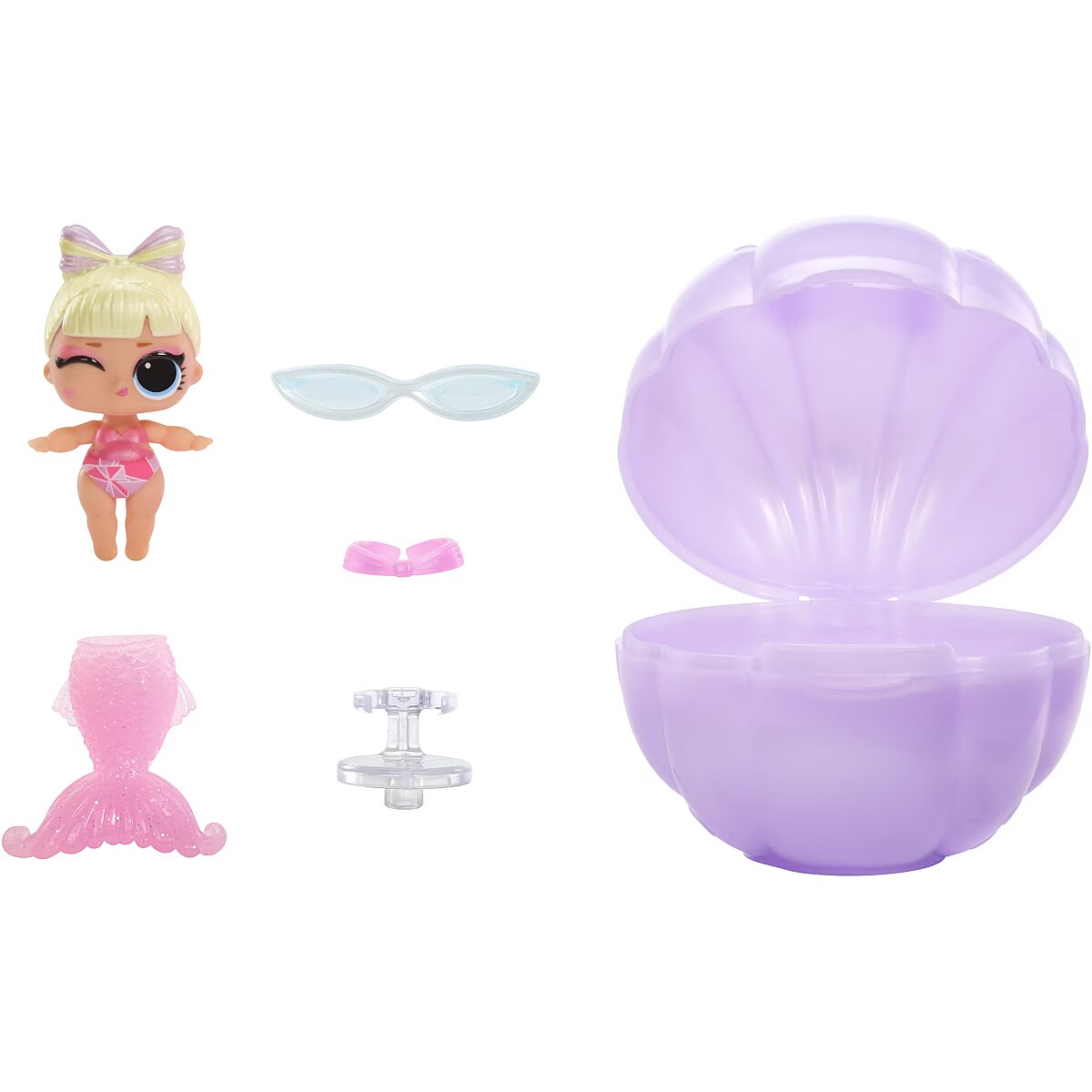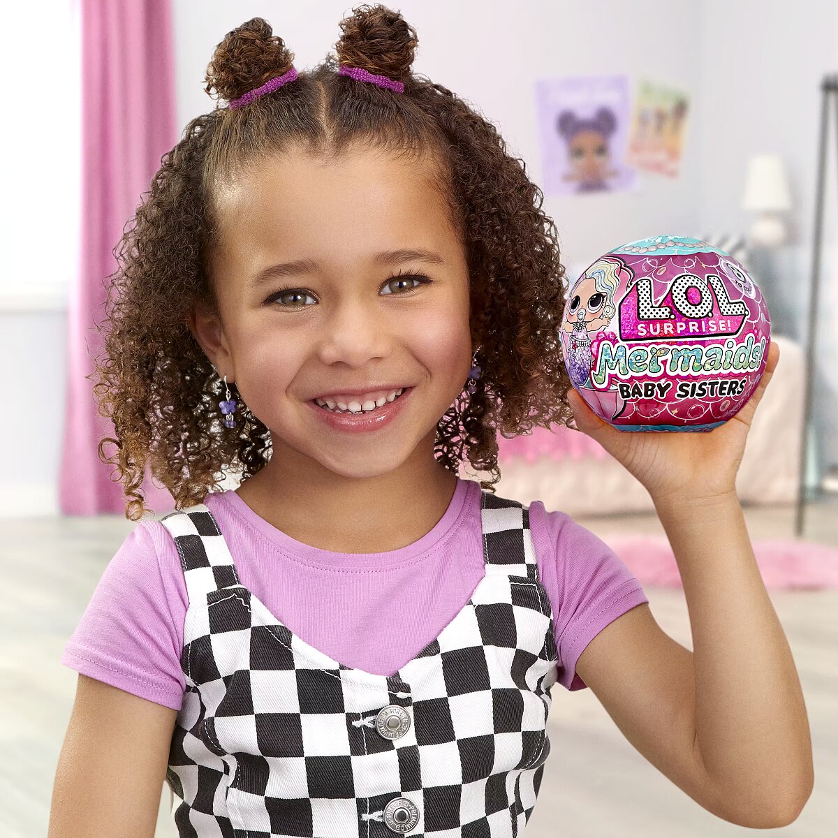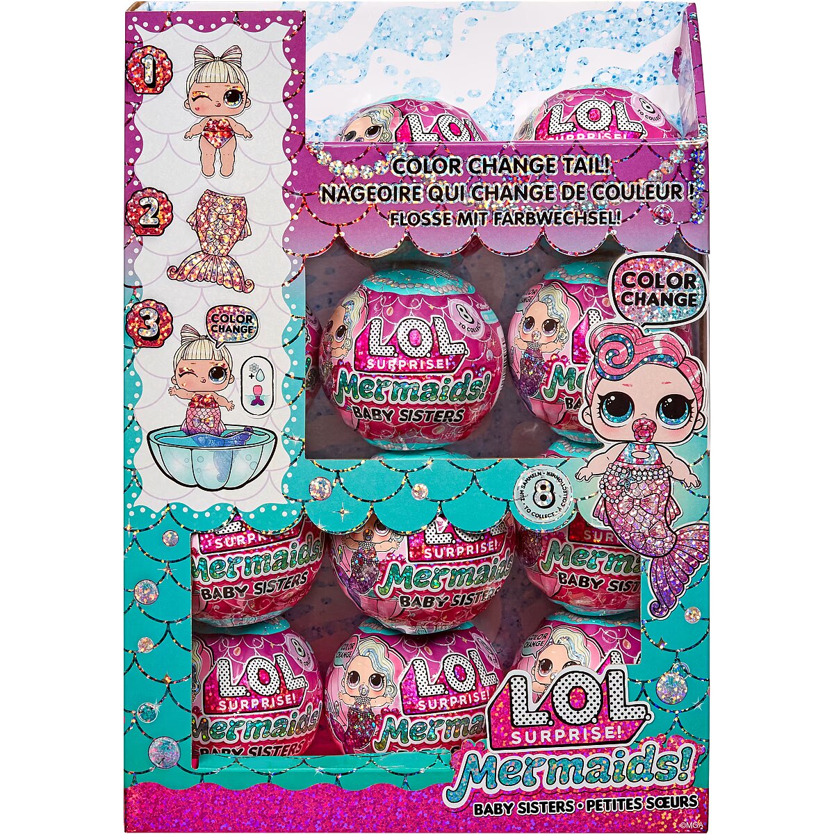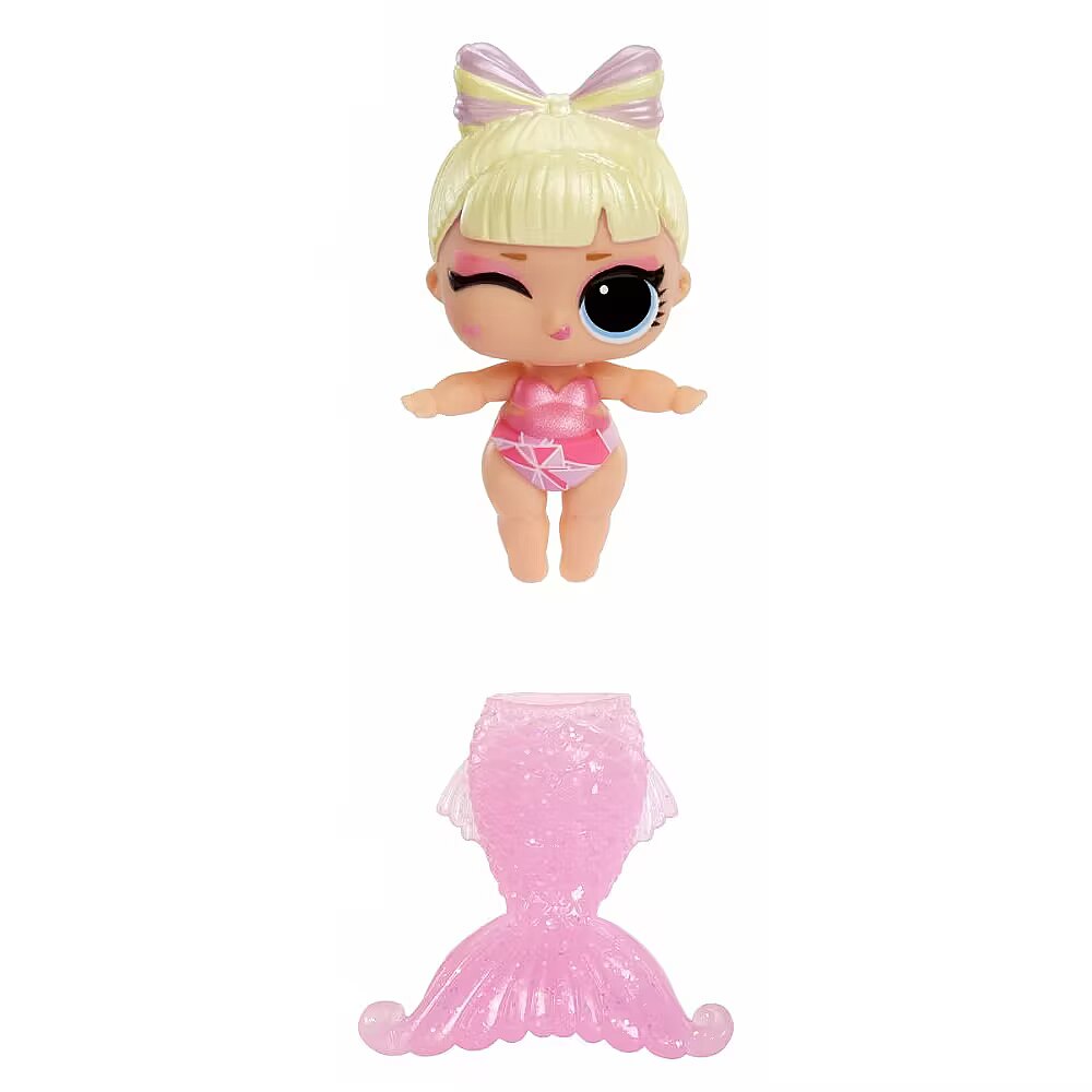 LongDesc - Get ready to make a splash with the adorable L.O.L. Surprise! Mermaids!™ Baby Sisters with color change tails! Once your Baby Sisters dolls are dressed in their stunning Mermaids tails, dip them in cold water to reveal a gorgeous color change! Discover what’s inside with fun mermaid-themed accessories. Show your Mermaids Baby Sisters dolls off and carry them around in their L.O.L. ball, which doubles as a clamshell display for your cute mermaids! Collect all 8 LOL Surprise Mermaids Baby Sisters and round out a world of play with their big sisters in the LOL Surprise Mermaids Tots collection, where you can Make A Mermaid Tail for your doll, and Mermaids Tweens, 4 NEW fashion dolls including beautiful color-changing mermaid tails!LOL Surprise collectible dolls with stylish hair, fun to dress outfits and many detailed accessory pieces make a perfect toy and playset for kids including 4- to 7-year-olds and up girls and boys for imaginative pretend play! As birthday gifts and gift for any special occasion, dolls provide hours of social play with siblings and friends! From MGA Entertainment, creators of L.O.L. Surprise!™ fashion and collectible dolls, Miniverse™ dolls, Rainbow High™ fashion dolls, Na Na Na Surprise dolls, Bratz® fashion dolls, MGA's Dream Ella™, MGA's Glitter Babyz™, Lalaloopsy™, Baby Born® Surprise baby dolls and collectibles, Little Tikes® kids' toys and many other favorite brands.