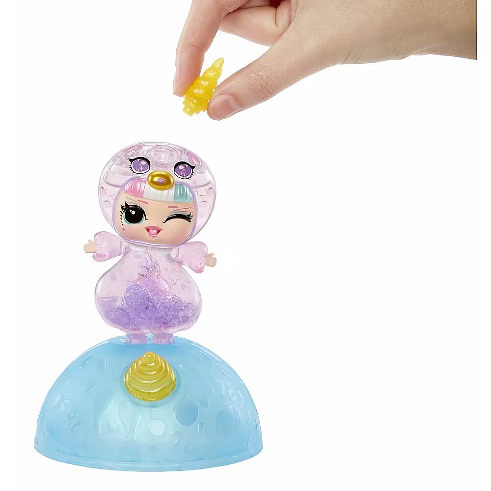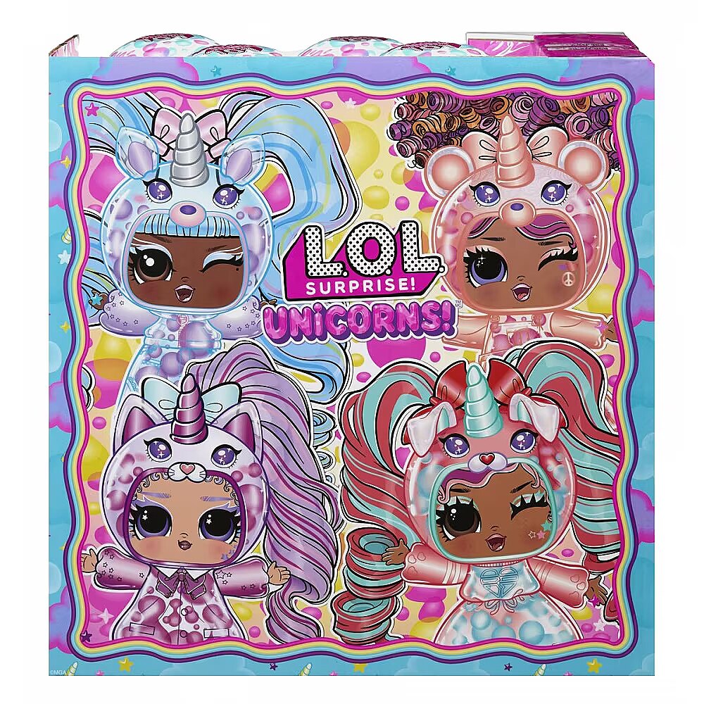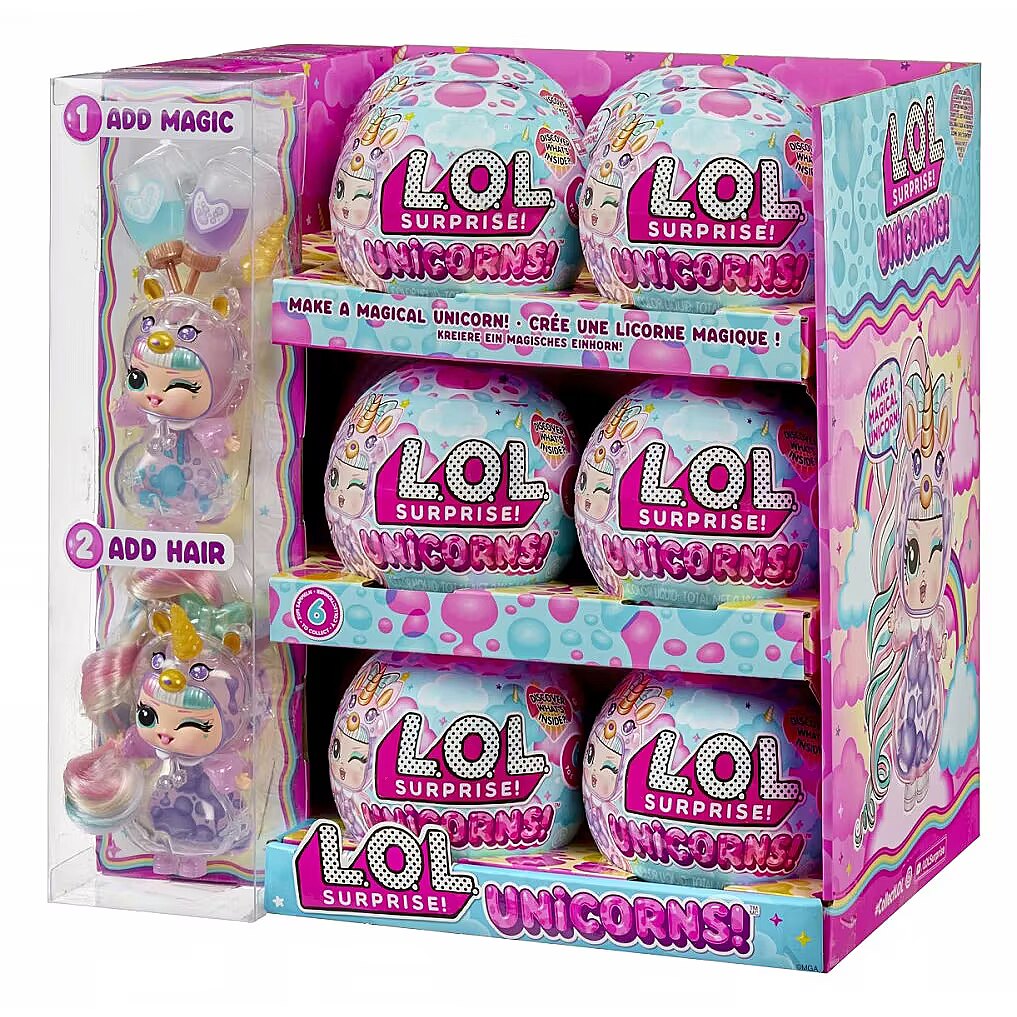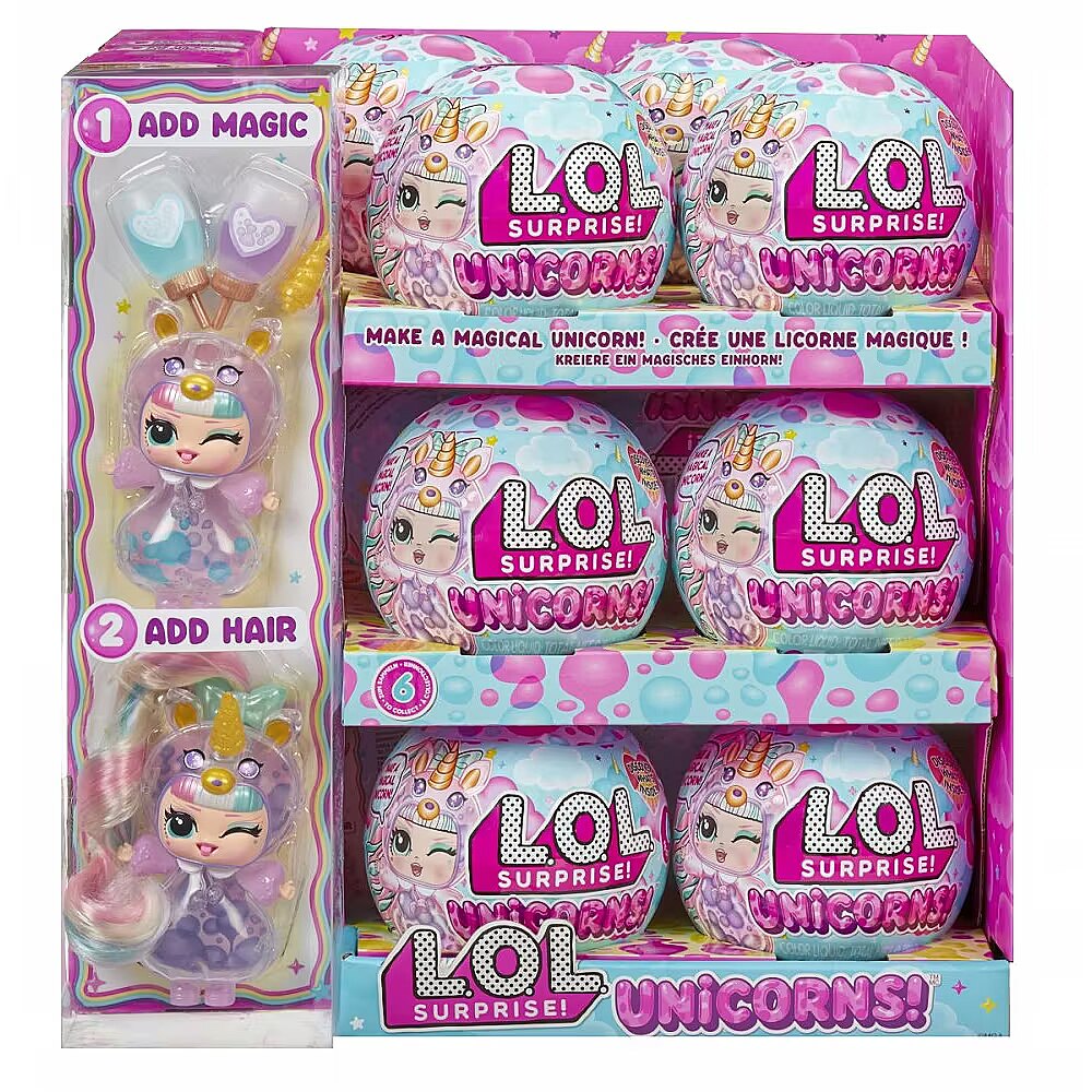 LongDesc - Introducing LOL Surprise Unicorns!™ Tots! Unbox a one-of-a-kind craft and play experience with this collection of make-your-own magical unicorn dolls. These colorful tots are the perfect collectible for kids, providing a simple introduction to imaginative crafts. Discover the enchanted magic of your Unicorn Tots by opening the ball to reveal your surprise translucent doll, colorful “potions,” unicorn accessories, and “real” doll hair! To customize her magical design, set the bottom half of the ball on the included playmat opening side-down and attach your tot to her built-in display stand on the ball. Locate the opening on the top of your doll’s cute face and use the funnel and adorable heart droppers to carefully squeeze the colorful potions inside your tot. When you’re ready for the magic to happen, seal the opening with your tot’s unicorn horn and turn her over to watch the colorful blobs slide past each other! For an additional magical effect, shine a phone light through your tot to illuminate her colorful interior. Don’t forget to unwrap the other cute surprises to dress your tot with her adorable hairstyle and ears! Each doll has sweet features and a unique unicorn hairstyle, horn, and ears that you can mix-and-match between Unicorn Tots. Swap hairstyles! When playtime is over, the ball doubles as a display stand to show off your Unicorn Tot and her magical design! Discover what’s inside and collect all 8 LOL Surprise Unicorns!™ Tots collectible dolls with colorful, customizable designs and interchangeable accessories.