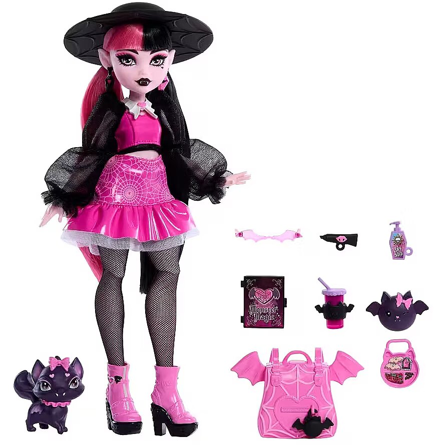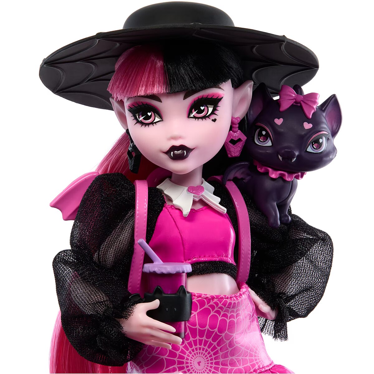 Packaging content - Packaging content - Includes 1 Draculaura doll, 1 pet figure, and accessories. Doll stand not included. Doll cannot stand alone. Colours and decorations may vary.