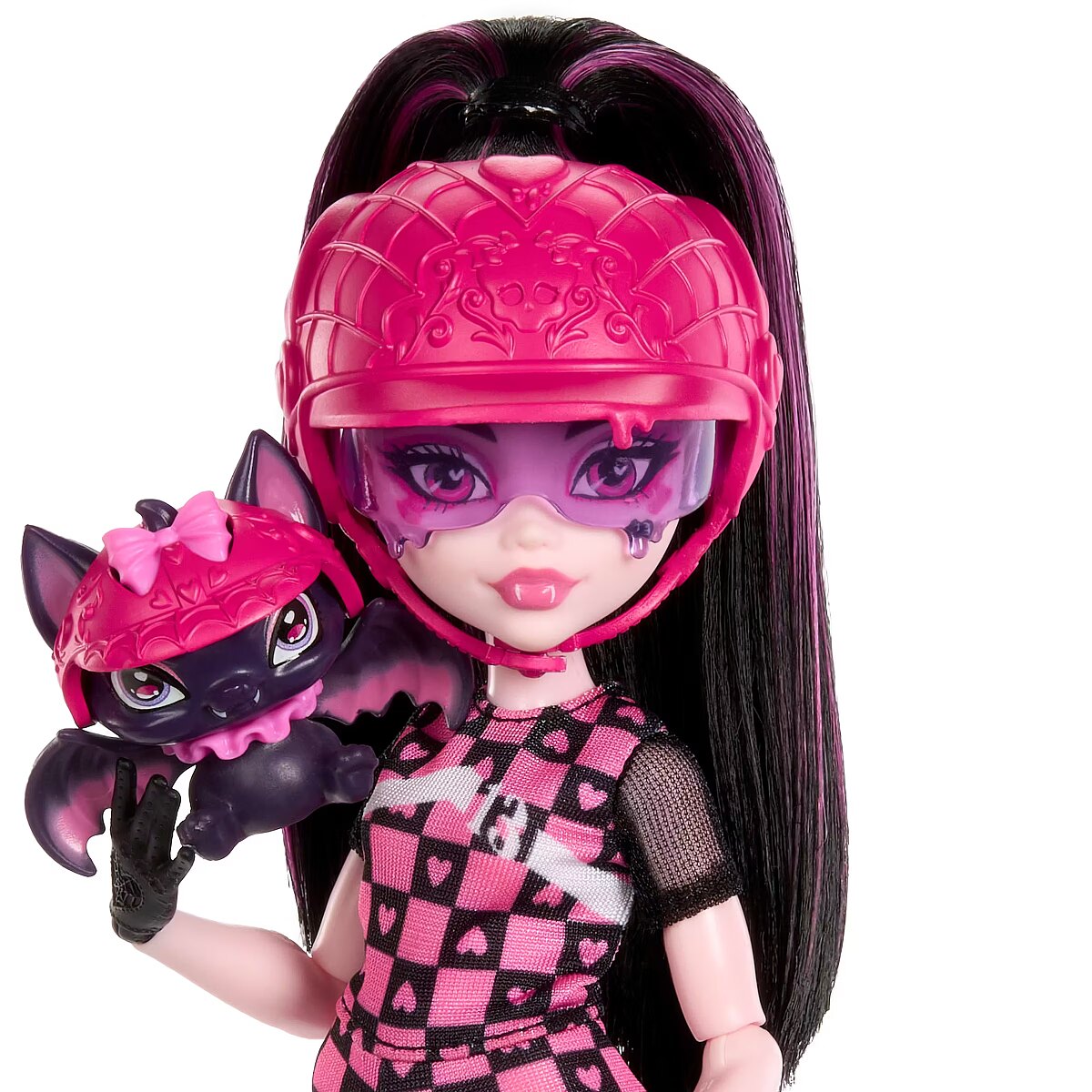Packaging content - Packaging content - Includes 1 Draculaura doll, 1 scooter, 1 pet, 2 helmet accessories. Doll cannot stand alone. Colours and decorations may vary.