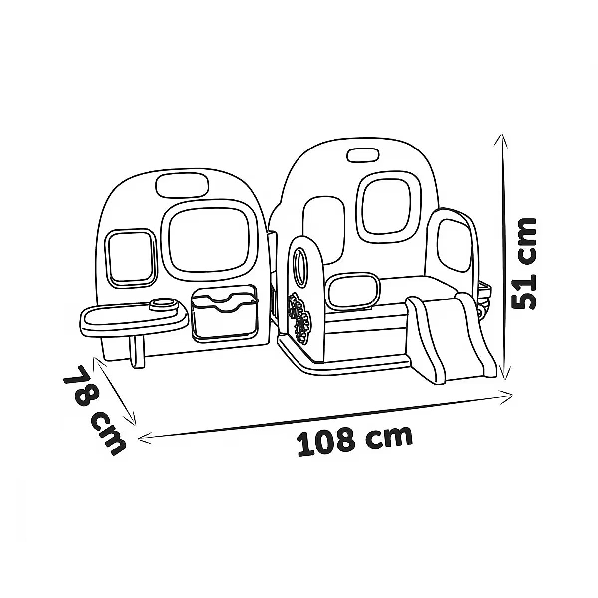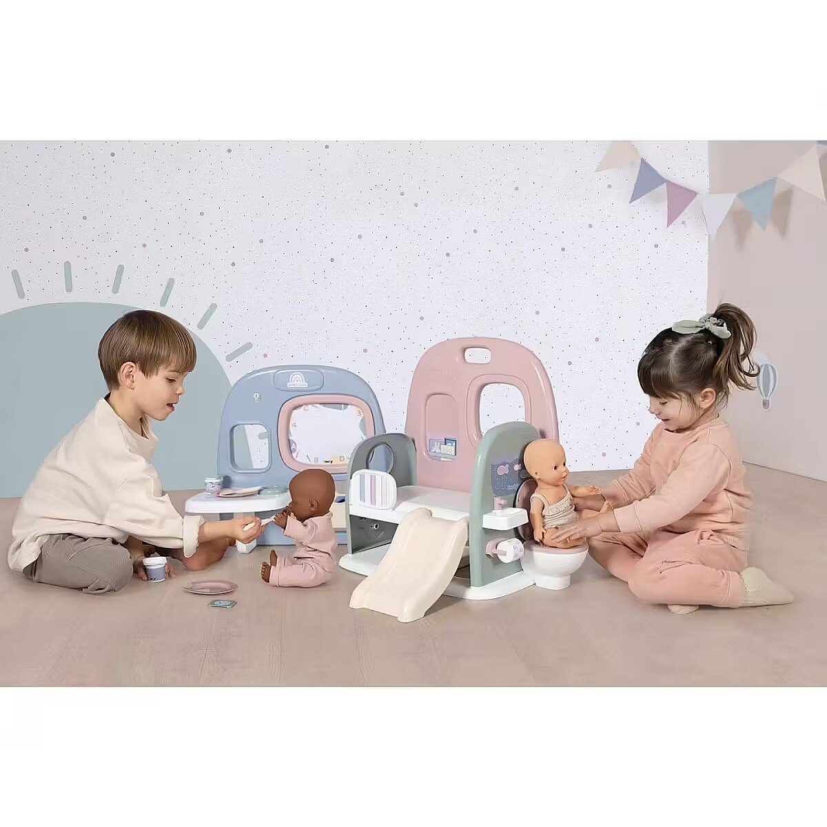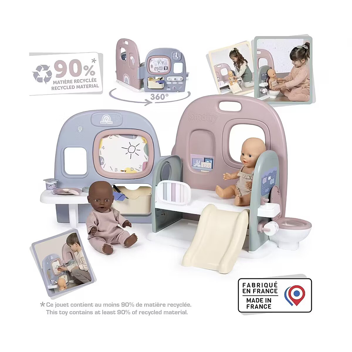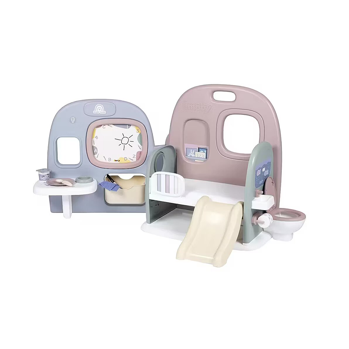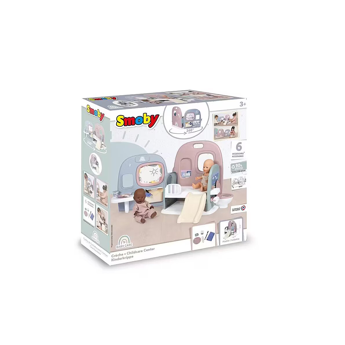 Description - Smoby Baby Care Childcare Centre Thanks to the small bathroom with toilet, sink and toilet paper roll, kids can playfully learn about personal hygiene. There is a separate loft bed with a slide for the dolls' afternoon nap. Lunch is served in the combined dining and creative area, where kids can also get creative on the small whiteboard. Underneath is a toy box for storing accessories. Thanks to its folding mechanism and carrying handle, the Baby Care Daycare Centre can be conveniently folded up and easily stored away after playtime. Numerous accessories complement the extensive play functions: a plate, a spoon, a yoghurt, a felt-tip pen and a cloth are included. The wide range of play options ideally supports the child's development and encourages imagination and creativity. Suitable for dolls up to 42 cm.