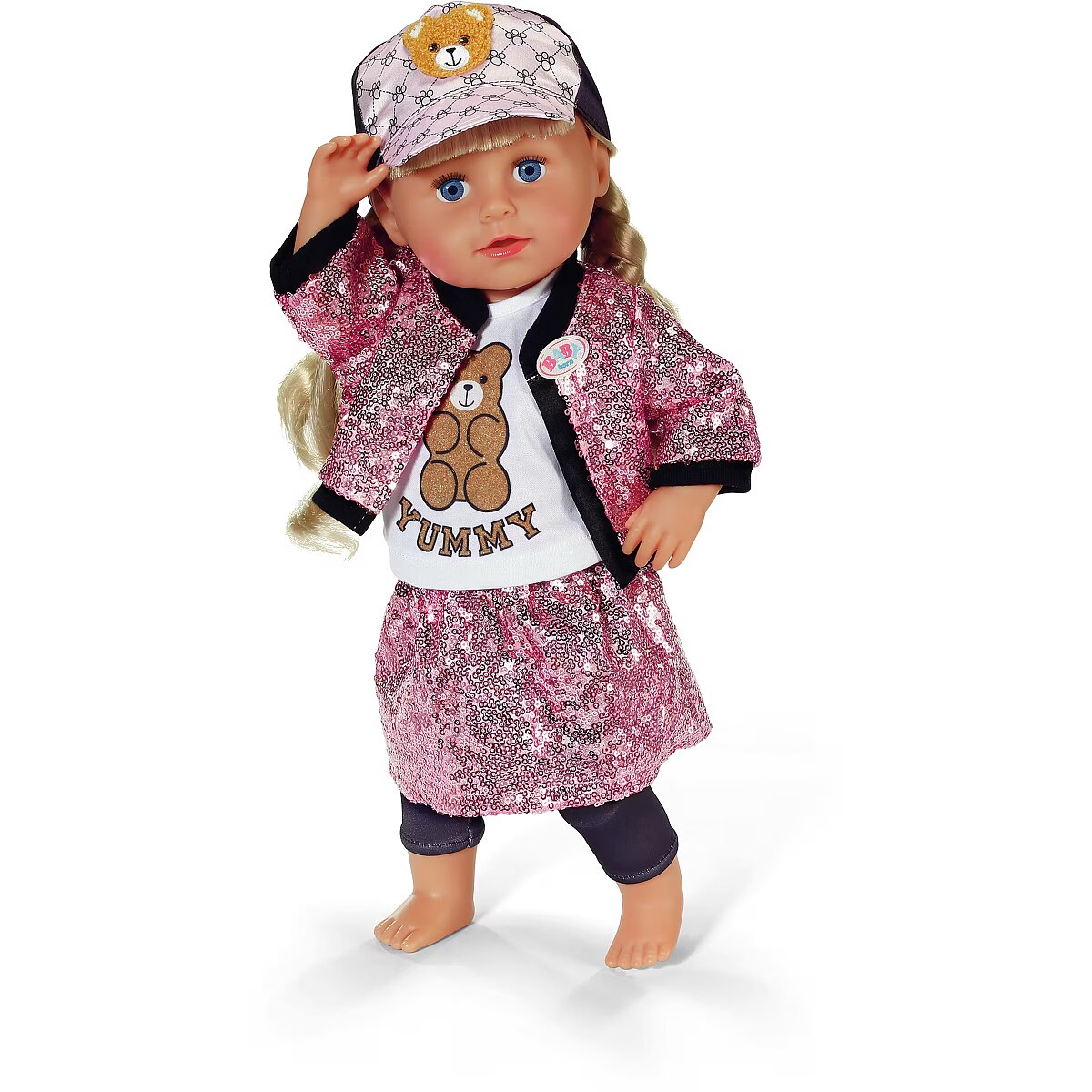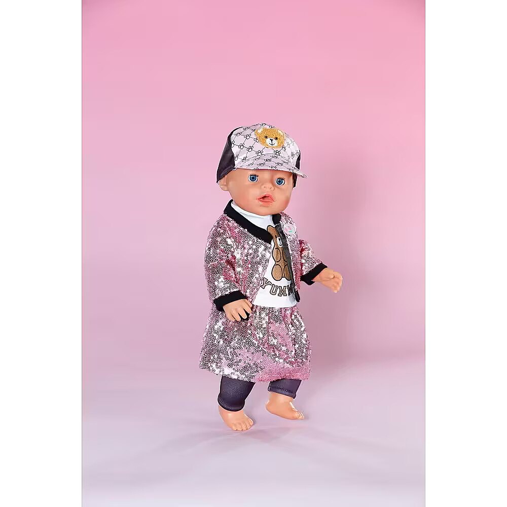 LongDesc - With this glamous 5 piece outfit, BABY born sparkles with the stars! In this set you get shiny leggings and a glitter shirt, complemented by a college-style skirt and jacket with pink sequins, and a cool cap with teddy appliqué rounds off the outfit perfectly. For 43cm dolls. Suitable for children aged 3+. Doll not included.