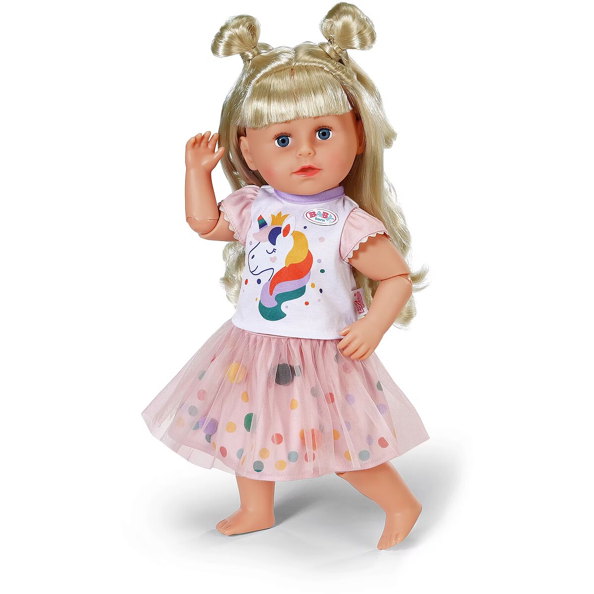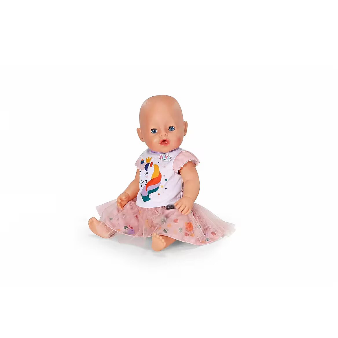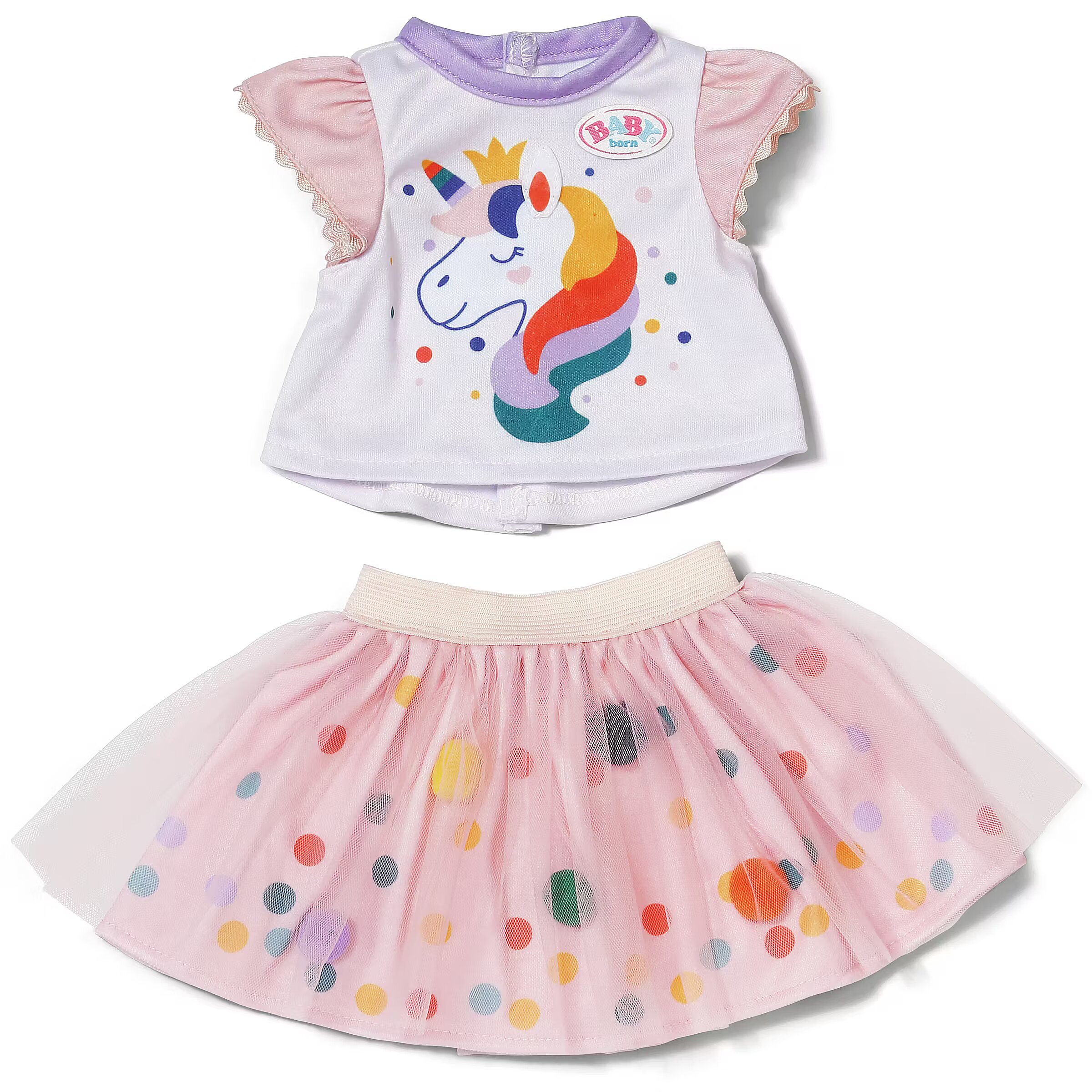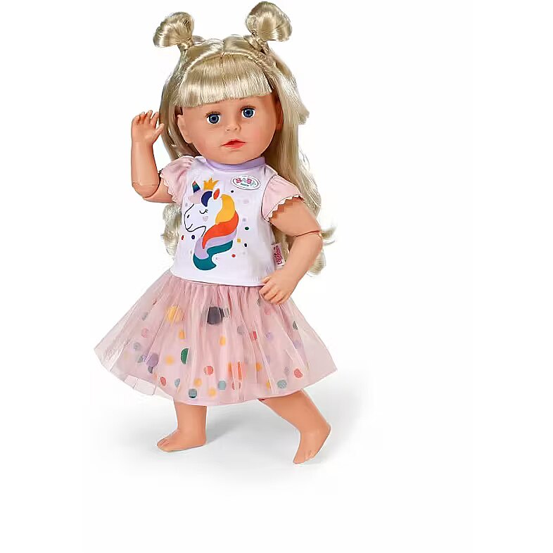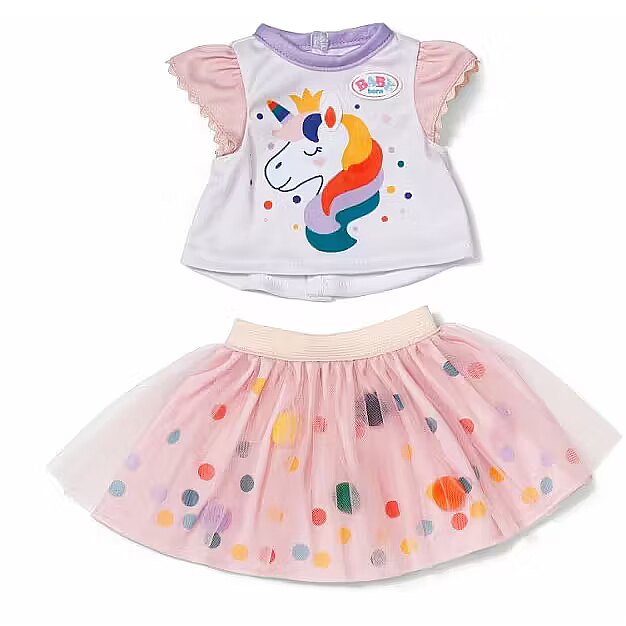 Description - BABY born Sukienkę Tutu Jednorożec - bajecznie kolorowy zestaw, który wnosi do zabawy odrobinę magii i blasku! Uroczy komplet składa się z jasnej bluzeczki z motywem jednorożca oraz tiulowej spódniczki tutu ozdobionej pomponikami. To idealny strój do kreatywnej zabawy w przebieranie i tworzenia magicznych historii z lalką BABY born. Pasuje do lalek o wysokości do 43 cm. Lalka nie jest dołączona.