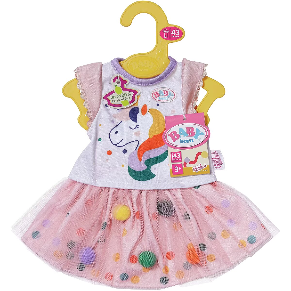 LongDesc - This bright and beautiful 2 piece unicorn dress made of tutu with colorful confetti pom-poms brings joy to the doll's wardrobe. To fit 43cm dolls. Suitable for children aged 3+. Doll not included.