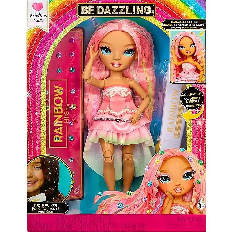LongDesc - The Rainbow High girls dare to shine in the new Be Dazzling line! Now you and your fashion doll can sparkle from head to toe with glitter gems. Each doll comes with a stylin’ outfit and an easy-to-use Rainbow High branded bedazzling tool. Decorate your doll’s hair and clothing — it’s all in the details! And you can shine too with matching bedazzled bling. When it comes to your dazzling creativity - more is more! Collect them all to complete the Be Dazzling Rainbow High squad with Adeline, Vivienne, Cèline, Geneviève, and Noèmie.