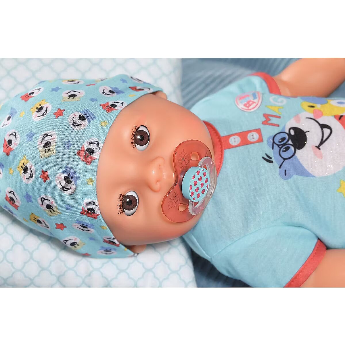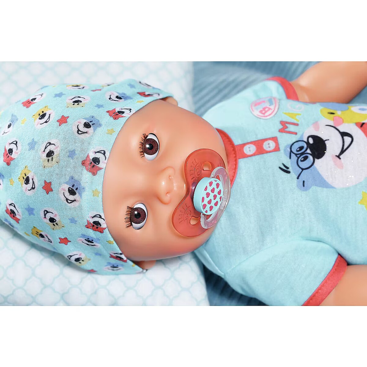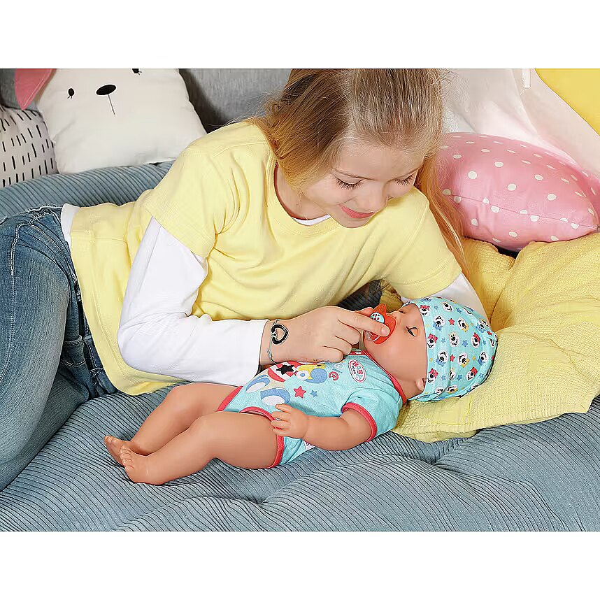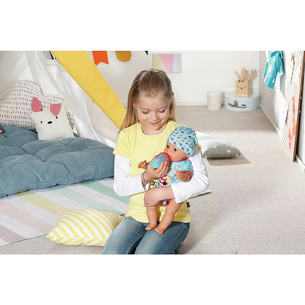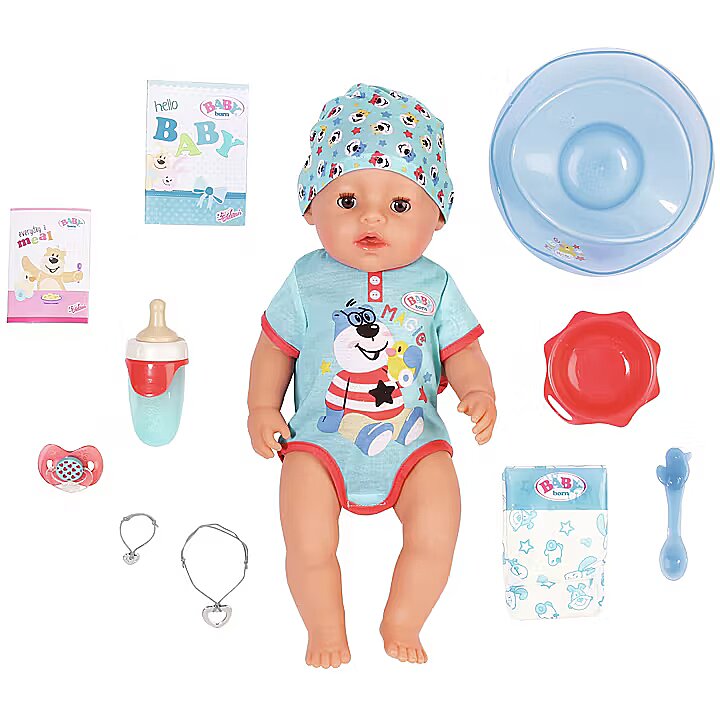 Description - BABY born Magiczny Chłopczyk 43 cm z body i czapeczką "Hej chłopczyku, czemu jeszcze nie chcesz spać?" Bobas leży w łóżeczku. Oczy ma otwarte, ssie smoczek. Jest pewien trik, który każdy rodzic i każda niania chcieliby za wszelką cenę poznać: obracasz smoczek i dzidzia zamyka śliczne swe oczęta.  Żeby to było takie proste z prawdziwymi dziećmi...  Gdy przekręcasz smoczek, oczy lalki zamykają się lub otwierają, bez względu na to, w jakiej jest pozycji. Oczka są takie śpiące: jeśli położysz lalkę na plecach bez smoczka, oczka zamkną się same. Niektóre czynności tak bardzo go bawią. Uwielbia spać, kocha jeść i oczywiście nie może doczekać się kąpieli. Chętnie pije wodę z butelki. Siusia w pieluchę albo do nocnika. Płacze prawdziwymi łzami. Nie tylko pije wodę. Chłopczyk BABY born potrafi jeść owsiankę. A potem to już tylko czas na kupkę. Ma ruchome rączki, nóżki i główkę. Łatwo jest go rozebrać, a potem ubrać w te wszystkie fajne ciuszki. Ciało bobaska jest takie miękkie i przyjemne w dotyku. Podstawowy zestaw zawiera 10 dodatków współgrających z funkcjami zabawki, do kompletu niebieskie body i czapeczka.  BABY born Magic 10 funkcji niekończąca się zabawa Zabawa zestawami BABY born z podziałem na role pobudza dziecięcą wyobraźnię. Dowiedziono, że ten rodzaj zabawy sprzyja rozwojowi kompetencji społecznych i wartości, takich jak odpowiedzialność, zdolność komunikacji i empatia Smoczek pasuje do wszystkich lalek BABY born w rozmiarze 43 cm Funkcja śpiących oczek sterowanych obrotem smoczka działa tylko w serii BABY born Magic Zabawka nie wymaga baterii