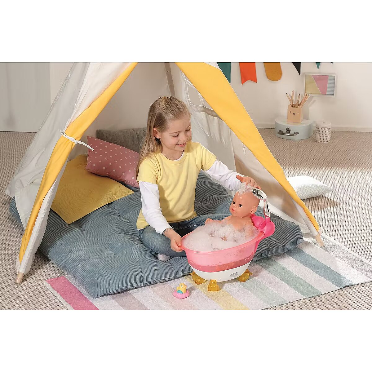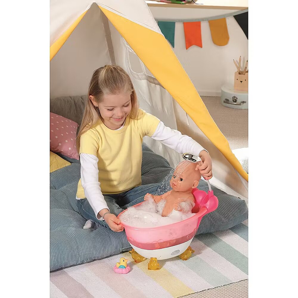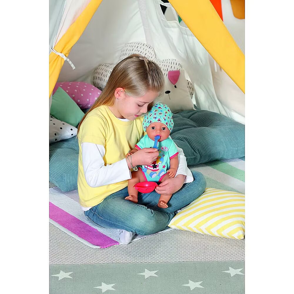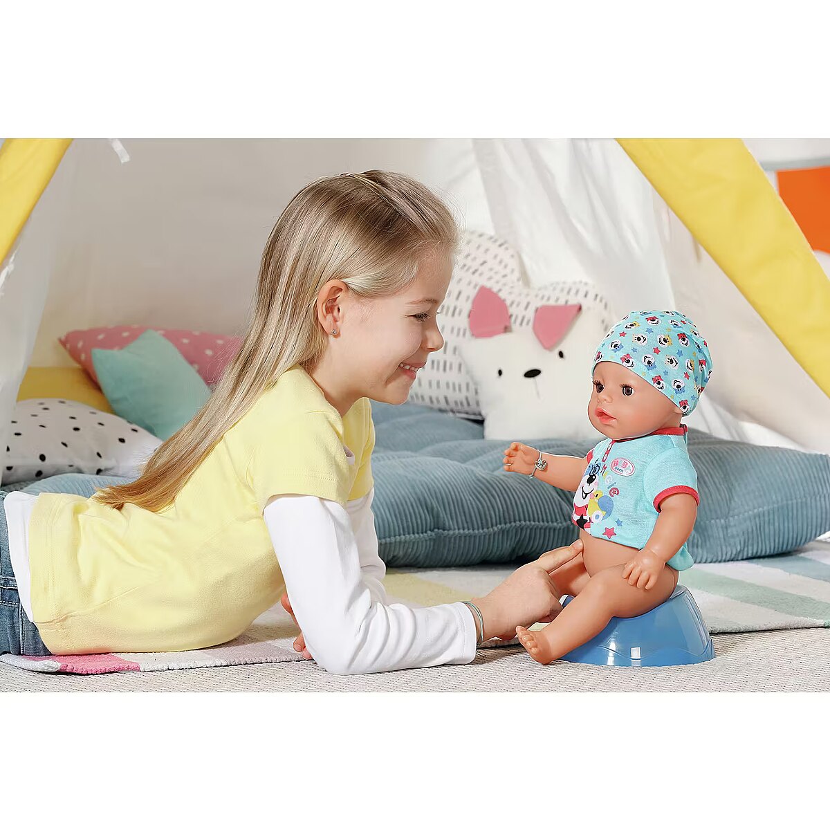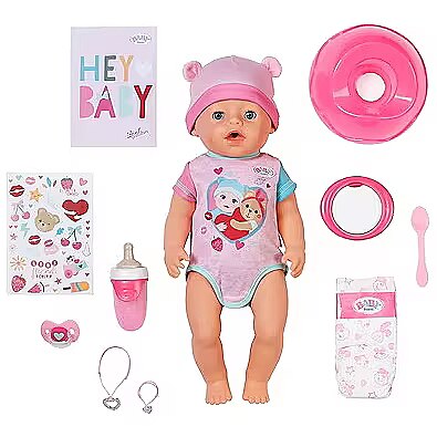 Description - BABY born Magiczny Chłopczyk 43 cm z body i czapeczką "Hej chłopczyku, czemu jeszcze nie chcesz spać?" Bobas leży w łóżeczku. Oczy ma otwarte, ssie smoczek. Jest pewien trik, który każdy rodzic i każda niania chcieliby za wszelką cenę poznać: obracasz smoczek i dzidzia zamyka śliczne swe oczęta.  Żeby to było takie proste z prawdziwymi dziećmi...  Gdy przekręcasz smoczek, oczy lalki zamykają się lub otwierają, bez względu na to, w jakiej jest pozycji. Oczka są takie śpiące: jeśli położysz lalkę na plecach bez smoczka, oczka zamkną się same. Niektóre czynności tak bardzo go bawią. Uwielbia spać, kocha jeść i oczywiście nie może doczekać się kąpieli. Chętnie pije wodę z butelki. Siusia w pieluchę albo do nocnika. Płacze prawdziwymi łzami. Nie tylko pije wodę. Chłopczyk BABY born potrafi jeść owsiankę. A potem to już tylko czas na kupkę. Ma ruchome rączki, nóżki i główkę. Łatwo jest go rozebrać, a potem ubrać w te wszystkie fajne ciuszki. Ciało bobaska jest takie miękkie i przyjemne w dotyku. Podstawowy zestaw zawiera 10 dodatków współgrających z funkcjami zabawki, do kompletu niebieskie body i czapeczka.  BABY born Magic 10 funkcji niekończąca się zabawa Zabawa zestawami BABY born z podziałem na role pobudza dziecięcą wyobraźnię. Dowiedziono, że ten rodzaj zabawy sprzyja rozwojowi kompetencji społecznych i wartości, takich jak odpowiedzialność, zdolność komunikacji i empatia Smoczek pasuje do wszystkich lalek BABY born w rozmiarze 43 cm Funkcja śpiących oczek sterowanych obrotem smoczka działa tylko w serii BABY born Magic Zabawka nie wymaga baterii