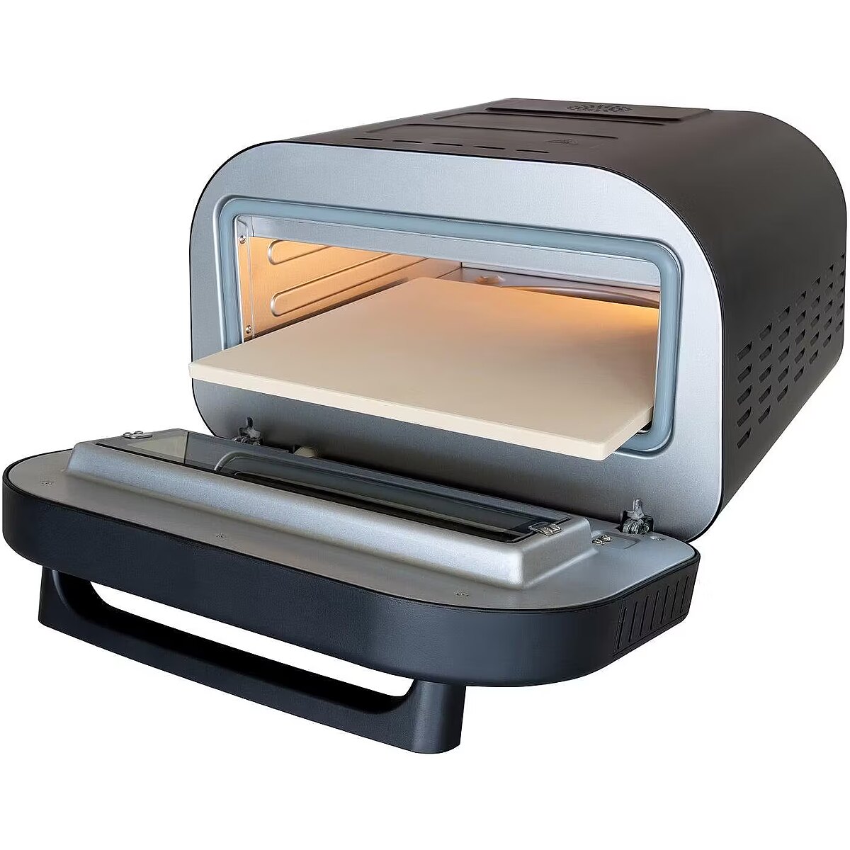 LongDesc - The Don Luigi pizza oven has a sleek black steel design and includes a pizza peel, pizza stone, pizza baking tray and professional pizza cutter. This electric pizza oven can reach temperatures of up to 450°C, allowing you to make the perfect pizza in just about 2 minutes. It is designed for safety and features a double-glazed door and cool-touch handle for easy handling. Say goodbye to gas-powered ovens and enjoy the convenience and efficiency of this electric pizza oven.