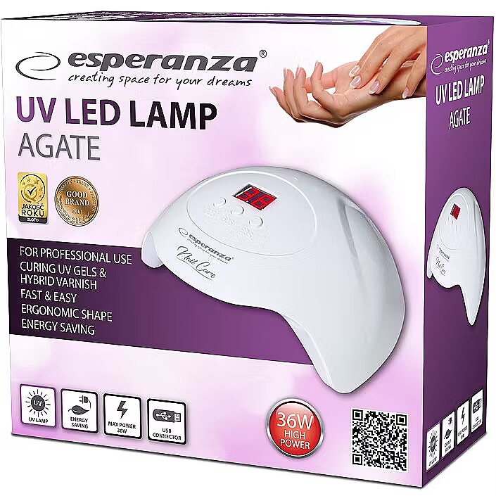 Description - The professional ESPERANZA AGATE UV lamp allows you to forget about frequent visits to beauty parlours and expensive manicure. It enables you to make it quicker, cheaper and exactly how you want it to be. The lamp evenly cures all hybrid, acrylic, gel varnishes and other nail products that need to be cured with UV light. The lamp is perfect both for manicure and pedicure at home and for professional beauty parlours. It is equipped with 15 efficient LEDs with the total output of 36 W giving white light and double wavelength of 365 nm and 405 nm. It has a motion sensor and a curing time display which facilitate operation. Your nails will be beautiful and shiny for many days or even weeks. FOR PROFESSIONAL USE