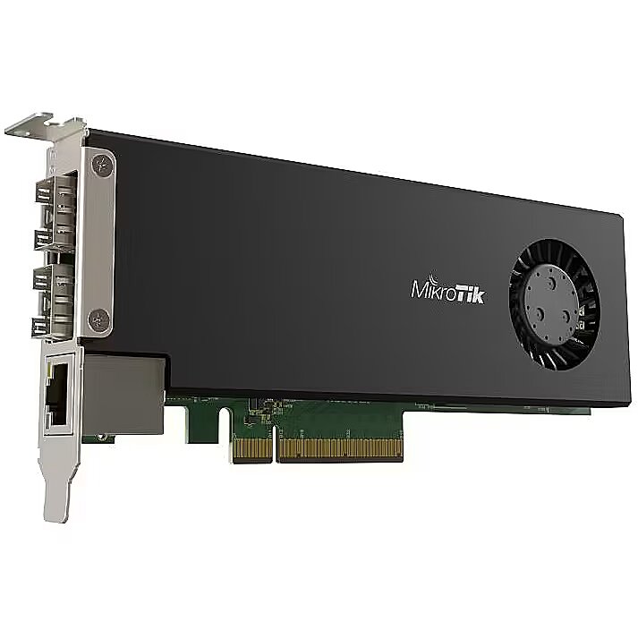 Description - Save space in your server room by adding a real CCR2004.. within the server itself! This unique product combines a simple 2x 25 Gigabit PCIe Ethernet adapter with the impressive capabilities of a fully-fledged router. By default, the PCIe interface will show up as four virtual Ethernet interfaces. Two interfaces in passthrough mode to the 25G SFP28 cages. Remaining two virtual Ethernet-PCIe interfaces are bridged with the Gigabit Ethernet port for management access. The user can configure all interfaces and settings freely since we are running fully functional RouterOS here. To get this CCR device to work as an NIC, a new Passthrough mode was implemented. Basically, a FastForward FastPath mode that can also pass hardware link statuses. This NIC can reach wire-speed (100Gbps) with Jumbo frames. It ensures that in most server setups this CCR network card will not be the bottleneck. With 4 GB of RAM, 128 MB of NAND storage, and a powerful quad-core ARMv8 64-bit CPU, this device can handle a lot: firewalls, user management and access control for home media and file servers, and even some traffic control in data centers – without the need for a stand-alone router. This form-factor does come with certain limitations that you should keep in mind. The CCR NIC card needs some time to boot up compared to ASIC-based setups. If the host system is up before the CCR card, it will not appear among the available devices. You should add a PCIe device initialization delay after power-up in the BIOS. Or you will need to re-initialize the PCIe devices from the HOST system. We are looking forward to see your unique use-cases for this unconventional device: a simple high-speed networking card combined with a powerful Cloud Core Router.
