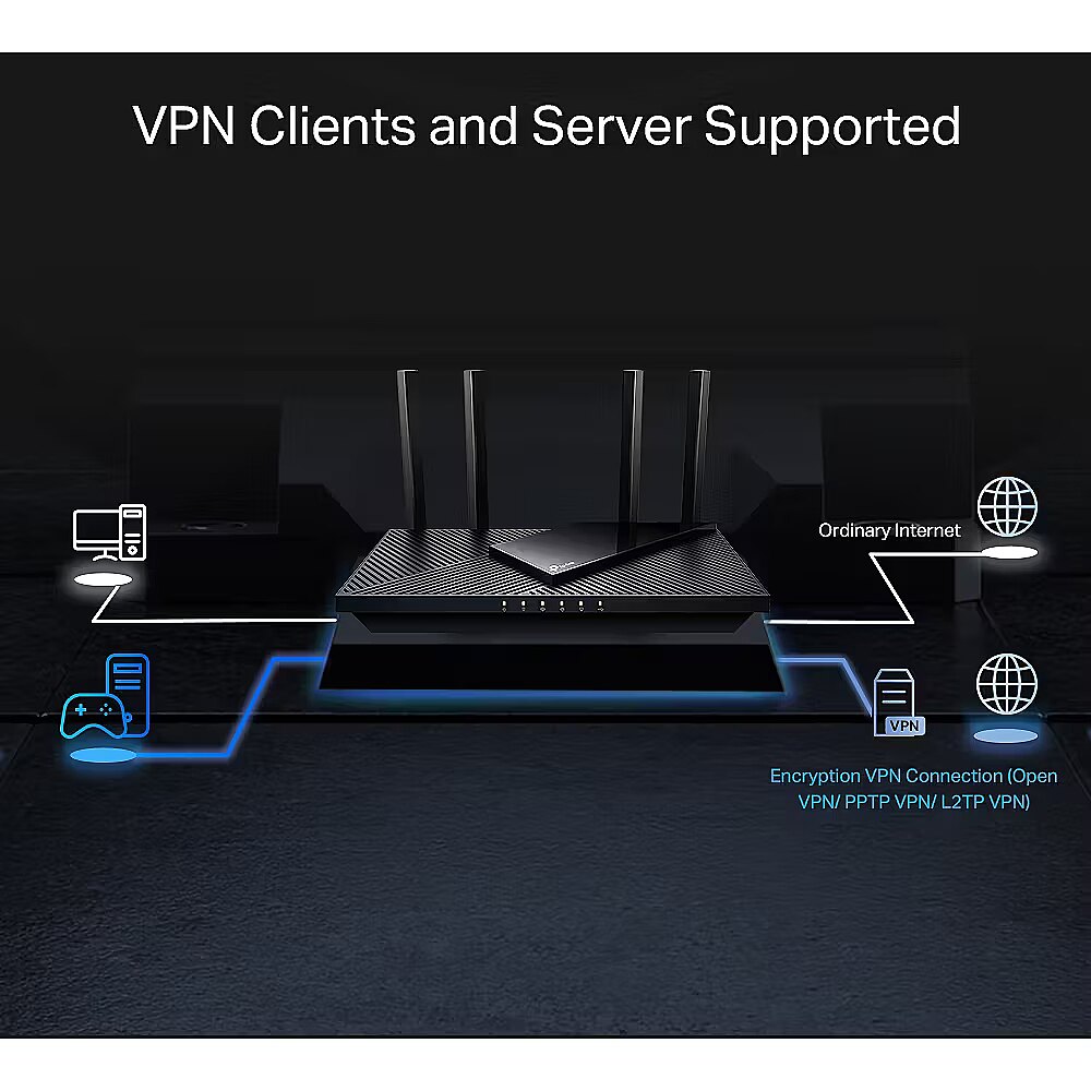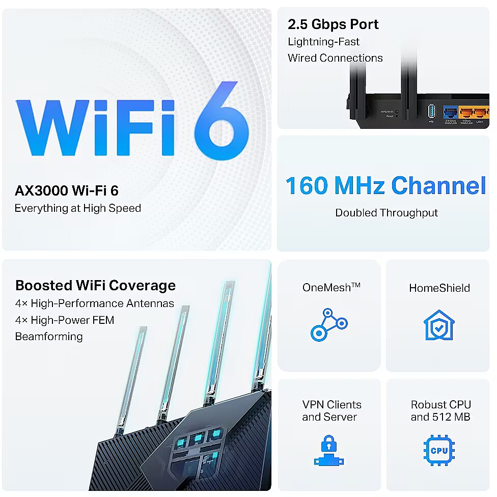 LongSummaryDescription - TP-Link Archer AX3000 Multi-Gigabit Wi-Fi 6 Router with 2.5G Port. WAN connection type: RJ-45. Wi-Fi band: Dual-band (2.4 GHz / 5 GHz), Top Wi-Fi standard: Wi-Fi 6 (802.11ax), WLAN data transfer rate (max): 2402 Mbit/s. Ethernet LAN interface type: Gigabit Ethernet, Networking standards: IEEE 802.11a, IEEE 802.11ac, IEEE 802.11ax, IEEE 802.11b, IEEE 802.11g, IEEE 802.11n, VPN server: OpenVPN, PPTP, L2TP. Security algorithms: WPA, WPA2, WPA3, Firewall security: SPI Firewall, NAT functionality: • Port Forwarding • Port Triggering • DMZ • UPnP. Product type: Desktop/pole router, Product colour: Black