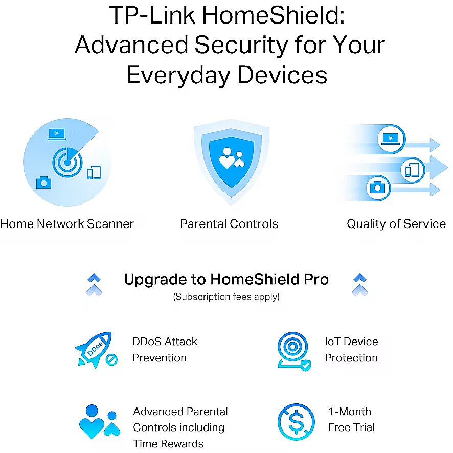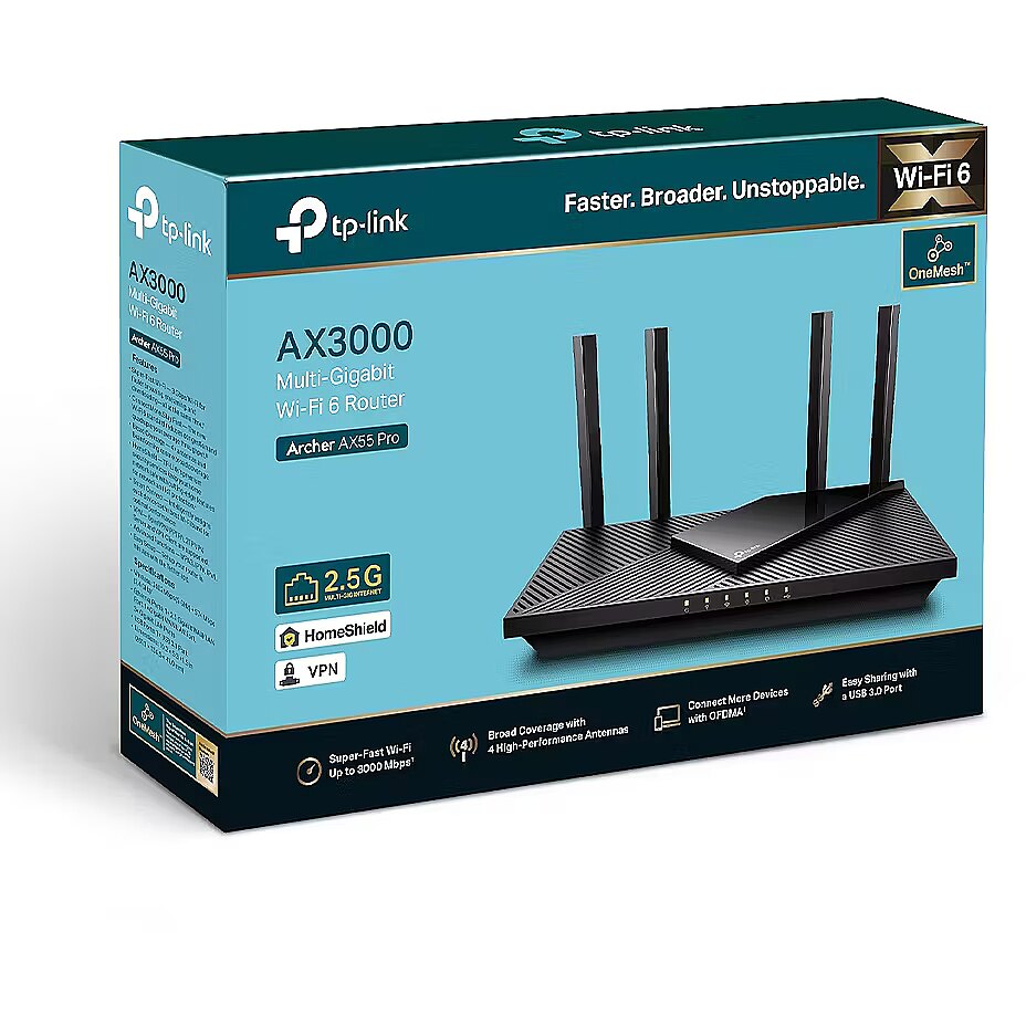 LongDesc - The New Era of Connectivity with 2.5G PortsAX3000 Multi-Gigabit Wi-Fi 6 RouterArcher AX55 ProIncredible Speed,AX3000 WiFi 6Drastically improved WiFi 6 speeds enable streaming, fast downloading, and gaming—all at the same time. 5 GHz with 160 MHz channel support doubles the bandwidth, enabling 8K video without lag.Go Faster — Multi-Gig Wired ConnectionsIn addition to stunning wireless speeds, AX55 Pro also provides premium wired connections. A 2.5 Gbps port and 1 Gbps port make full use of gigabit speeds from your local ISP. Break through the 1G bottleneck and drive your devices to peak performance. WAN/LAN support gives you remarkable flexibility to tailor both ports to fit your network’s needs.WiFi Coverage Throughout Your Home4× high-performance antennas boost WiFi signals throughout your home. Beamforming technology detects devices and concentrates signals towards them, especially to previously hard-to-reach areas.Massively Expanded Device CapacityLess Loading WheelsEnjoy smooth gaming, video streaming, and live feeds simultaneously. OFDMA makes your WiFi stronger by allowing multiple clients to share one band at the same time, which cuts latency and jittering.Improved Cooling Design for Full OutputNo heat ups, no throttles. A larger heat sink and refined case design cool the WiFi 6 system and enable your network to stay at top speed in more versatile environments.TP-Link OneMeshTM:Flexibly Create Whole Home WiFi with Archer AX55 ProWant to build a whole-home Wi-Fi? Archer AX55 Pro supports OneMesh to form seamless whole-home coverage, preventing drops and lag when moving between signals.TP-Link HomeShield:Advanced Security for Your Everyday DevicesWith TP-Link HomeShield, enjoy advanced security features dealivering a safe environment that protects your family and network's data and privacy.Home Network ScannerReal-time network scanner to detect potential threats and security issues.Parental ControlsManage time online and block inappropriate content to keep your family safe online.Quality of ServiceAssign your favorite devices to have the fastest connections for top performance.Upgrade to HomeShield Pro- DDoS Attack Prevention- IoT Device Protection-Advanced Parental Controls including Time Rewards- 1-Month Free TrialVPN Clients and Server SupportedAllow devices in your home network to access remote VPN servers without needing to install VPN software on every device. Archer AX55 Pro can run both the VPN and ordinary internet connections at the same time, delivering security and flexibility.USB 3.0 PortsEasily share files between connected devices by plugging into an external drive. You can even make it your personal cloud storage and access it from outside securely.Easy Setup and UseWhether you prefer the intuitive Tether app or TP-Link’s powerful web interface, you can set up your Archer AX55 Pro in minutes.The Tether app allows you to manage network settings from any Android or iOS device.Protect Your ChildrenBlock inappropriate content for your children, and customize a time range for better online habits.New Connection NotificationsYou will be notified by your phone when new devices connect. Kick off any suspicious connections and block them. It’s as simple as that.Easy Firmware UpgradesTired of upgrading firmware manually? OTA updates simplify firmware upgrades with a click in the management panel. To keep your security and functions always up to date, just turn on the auto schedule.