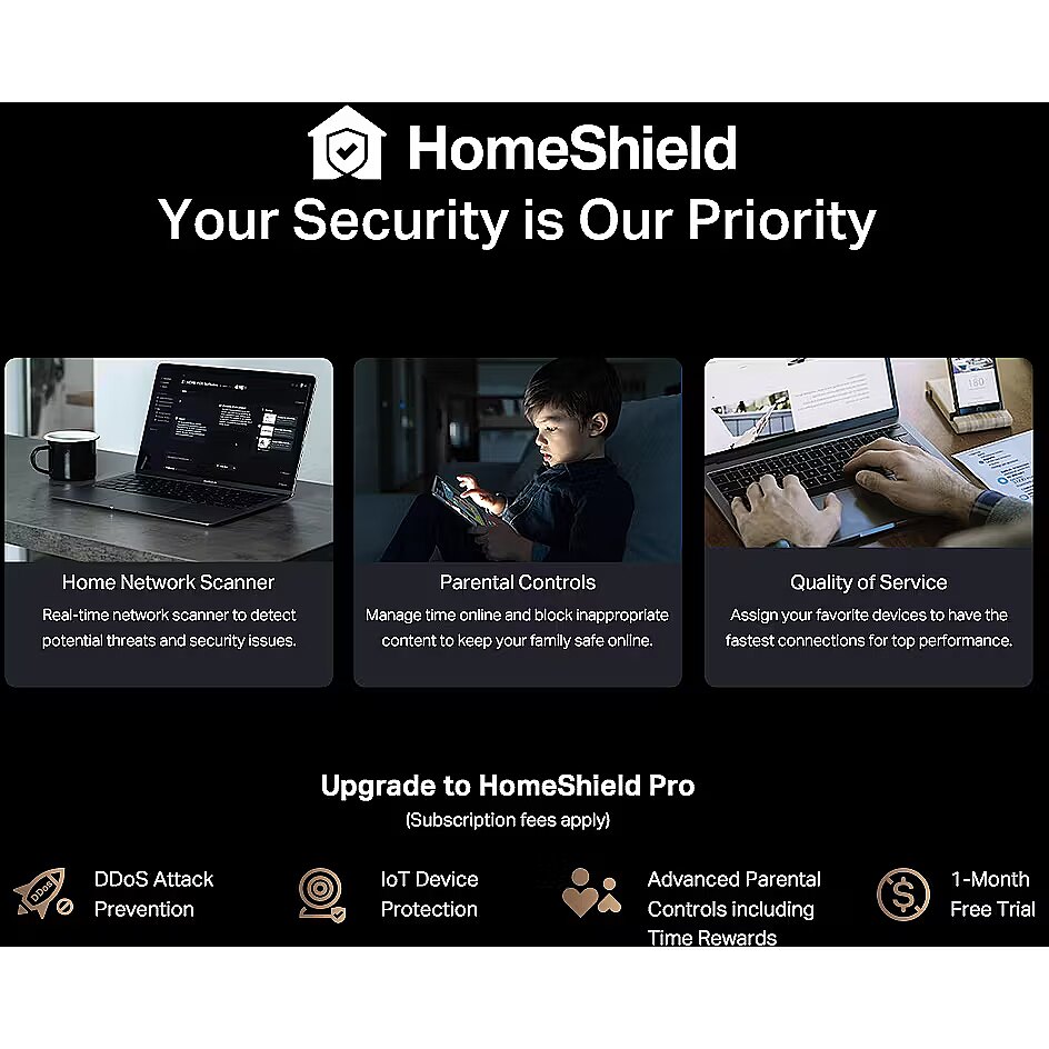 Security - SPI Firewall Access Control IP & MAC Binding Application Layer Gateway HomeShield Security Real-time IoT Protection Malicious Site Blocking Intrusion Prevention System DDoS Prevention Home Network Scanner VPN Server OpenVPN Server PPTP VPN Server L2TP VPN Server VPN Client Open VPN Client PPTP VPN Client L2TP VPN Client WiFi Encryption WPA WPA2 WPA3 WPA/WPA2-Enterprise (802.1x)