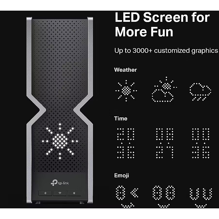 Description - Archer BE800 BE19000 Tri-Band Wi-Fi 7 Router Redefining Wi-Fi routers: Featuring powerful Wi-Fi 7 performance, lightning-fast wired connections, a brand new design, and an LED screen. Lightning-fast 19Gbps Tri-Band Wi-Fi 7: Keeps your devices running at full speed. Enjoy smooth 4K/8K streaming, immersive AR/VR gaming, and blazing-fast downloads. Multi-Link Support (MLO): Boosts throughput, reduces latency, and improves reliability for new applications. Dual 10G ports: 1 x 10Gbps Ethernet/Fiber Combo WAN/LAN port + 1 x 10Gbps WAN/LAN port + 4 x 2.5Gbps ports + 1 x USB 3.0 port for maximum flexibility and increased bandwidth. Maximum Coverage: Proprietary Wi-Fi optimization and 8 optimally positioned antennas with Beamforming provide greater capacity, stronger and more reliable connections, and less interference. EasyMesh Compatible: Works with EasyMesh routers and range extenders to create a seamless mesh Wi-Fi network throughout your home, preventing drops and delays as signals switch. TP-Link HomeShield: Enhanced security protects against the latest cyber threats. Easy and Fun to Use: Conveniently manage everything with the Tether app and visually display the time, weather, and fun graphics on the LED screen.