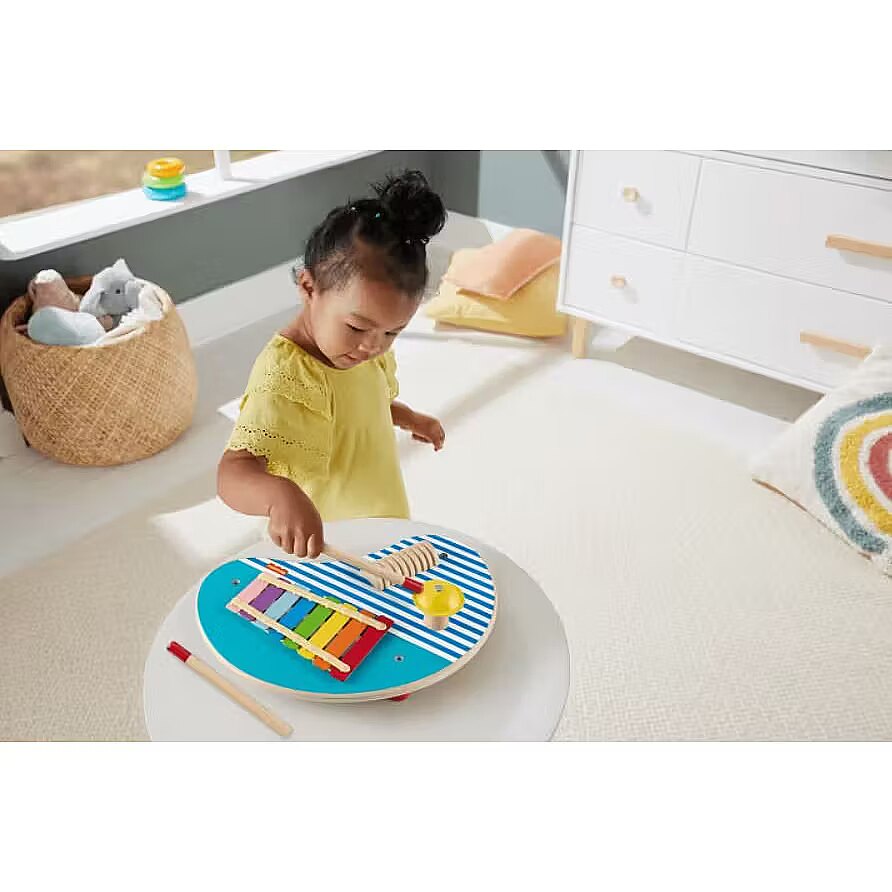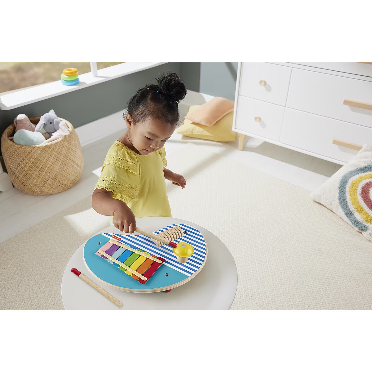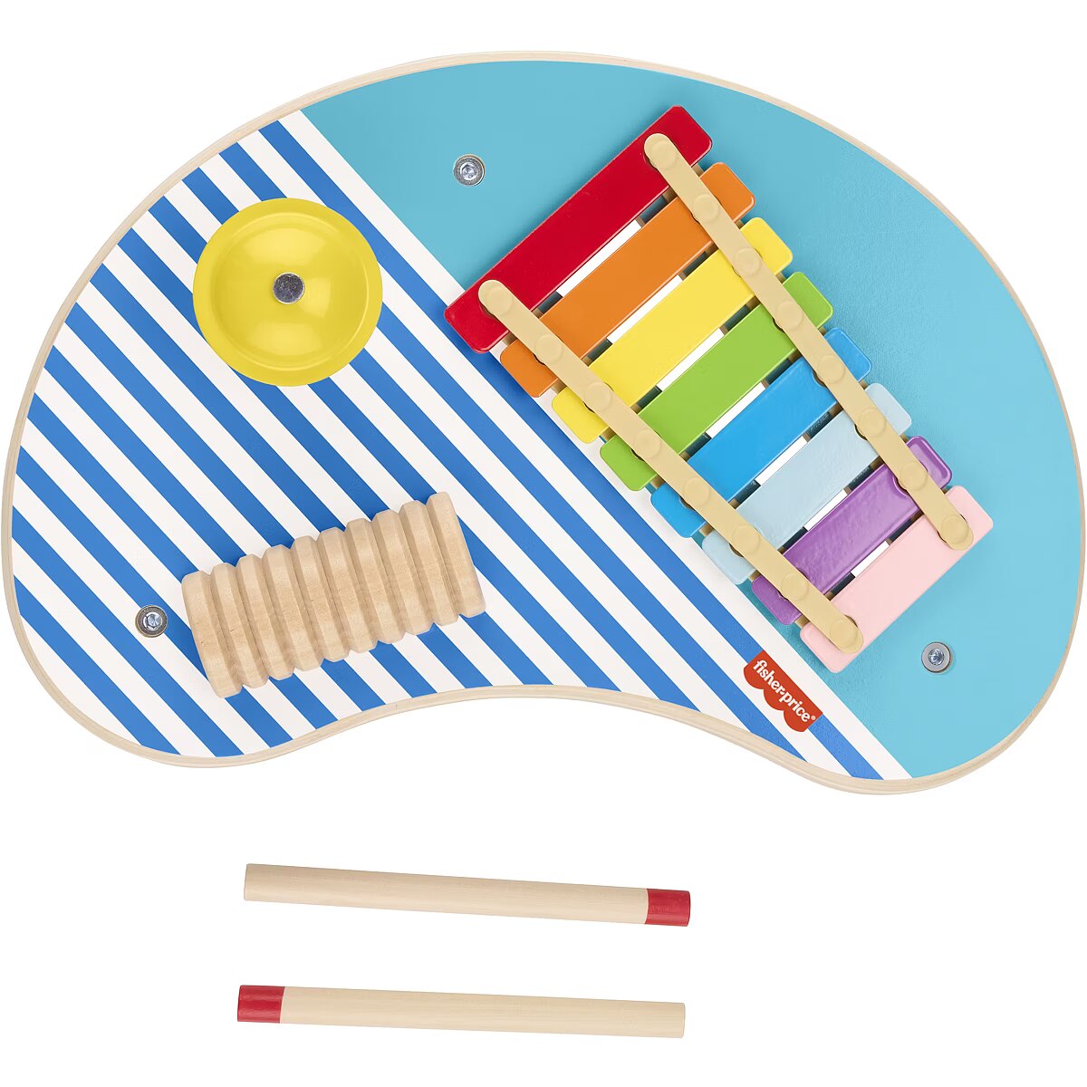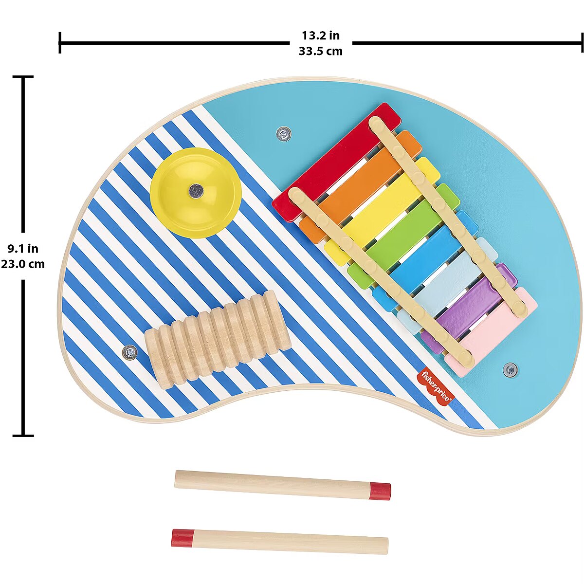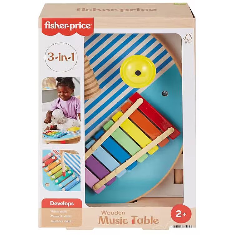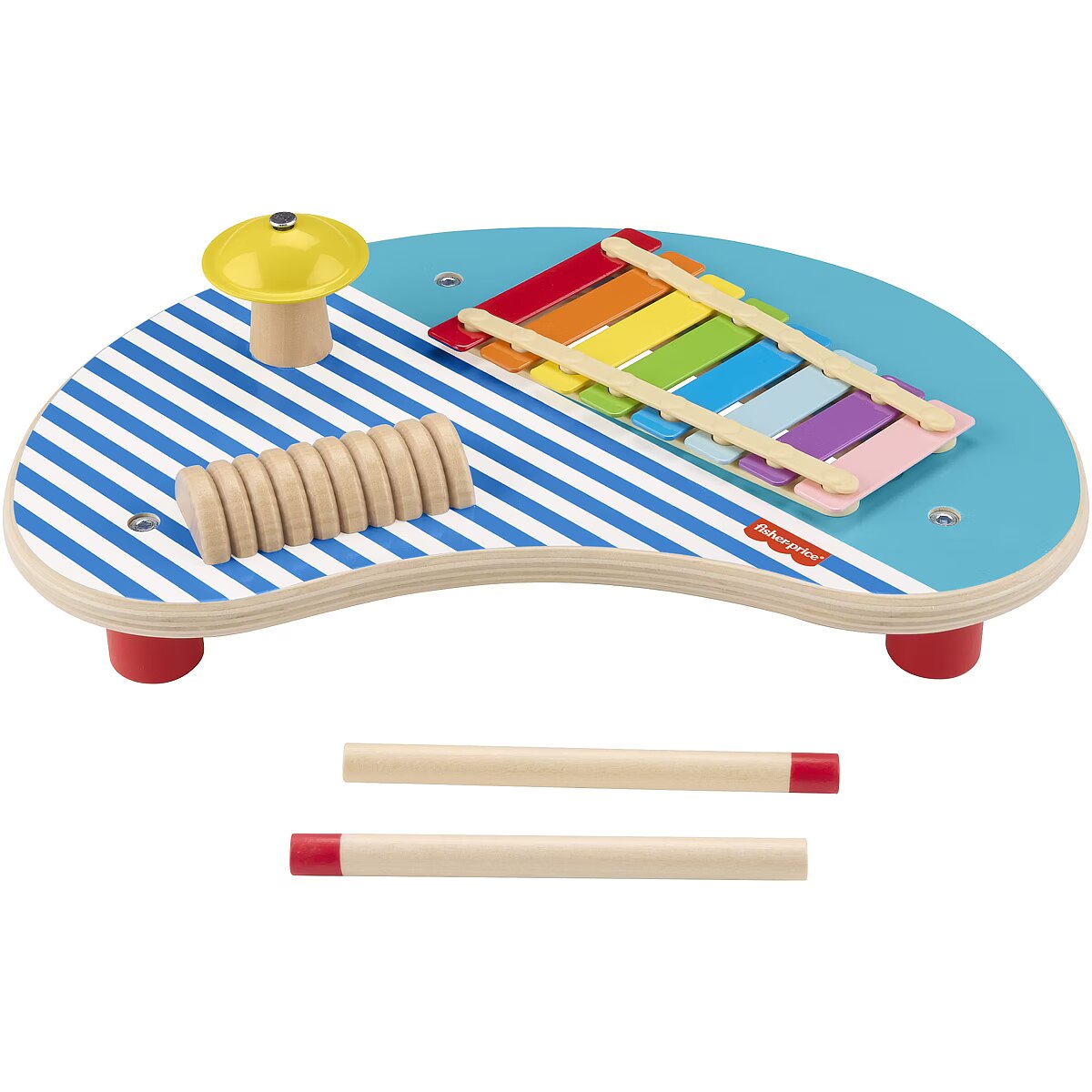 LongDesc - The Wooden Musical Table from Fisher-Price combines 3 percussion instruments into one fun toddler music toy. Kids can find their rhythm and exercise their fine motor skills using the mallets to play the xylophone, cymbal and guiro. Made with wood from Forest Stewardship Council-certified sources (FSC-N004566) and decorated with non-toxic, water-based paints, this toy can help inspire creativity and introduce music to your child in a fun and exciting way! Colours and decorations may vary.