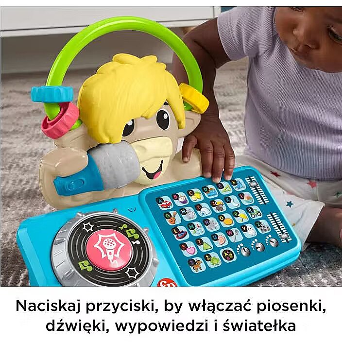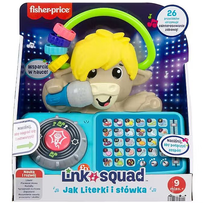 Description - Little ones can direct their play with this Fisher-Price Link Squad Jak Letters & Words musical toy. As the little music lover presses the 26 letter buttons on the DJ deck or spins the turntable, Jak's microphone lights up to playful songs, sounds, and phrases about letters, first words, and more. Kids can record a fun message, and DJ Jak will remix it into an original song! The clacking stick helps develop dexterity. And when Jak meets other Link Squad members, he lights up with them so they can sing and learn together! This toy is available in Polish. (Additional Link Squad toys sold separately, subject to availability. *Fisher-Price Link Squad toys are not compatible with Fisher-Price Linkimals toys.) Interactive Jak with over 115 activations, including songs, sounds, and phrases that teach letters, the alphabet, first words, and more. Press the letter buttons on the DJ deck or spin the turntable to make Jak's microphone light up in time with the beat. Record a fun message, and the DJ will remix it into an original song. Collect other interactive toys in the Link Squad line to see how they interact with each other! (Sold separately, subject to availability). Helps strengthen fine motor skills and introduce cause and effect play for babies 9 months and up. Gay development: Welcome each milestone with a smile! Link Squad toys develop early learning skills, helping babies learn and expand their skills through interactive, educational play.