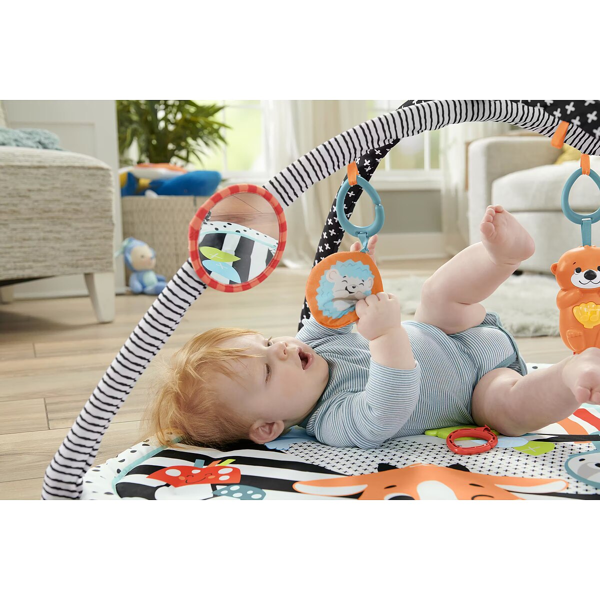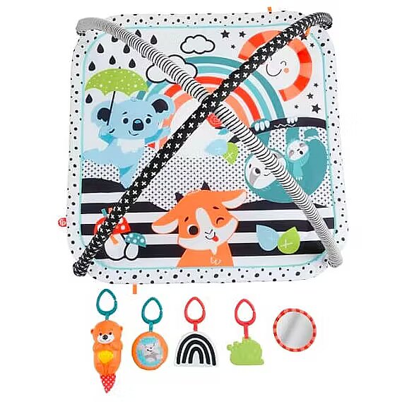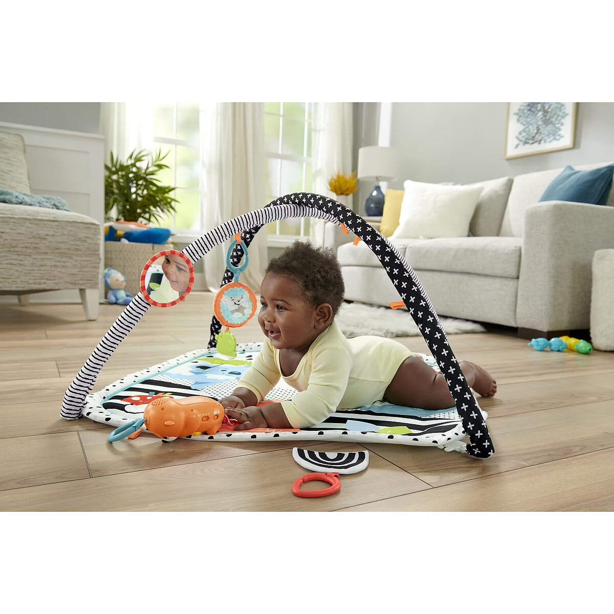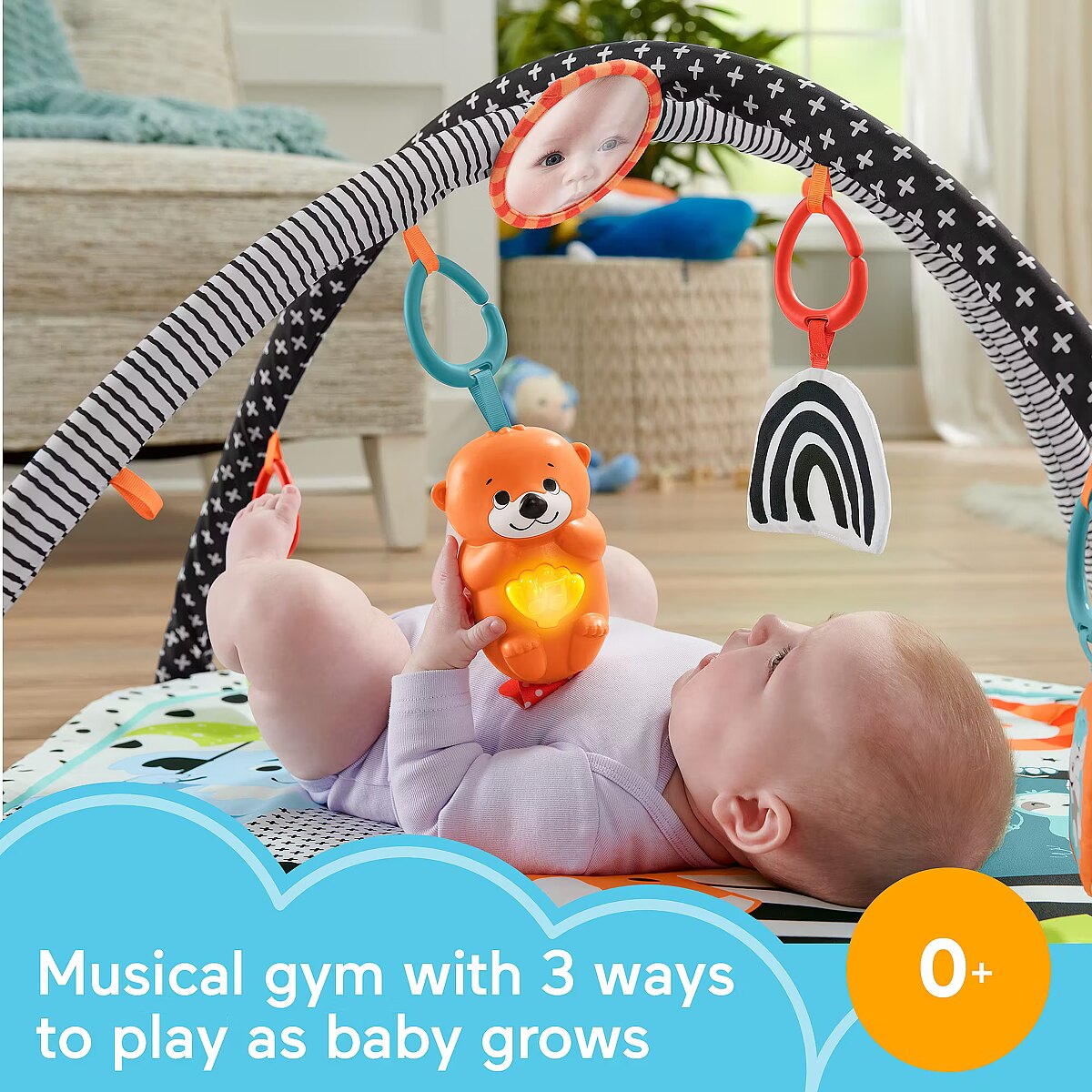 LongDesc - Your baby can continue their early development with the Fisher-Price 3-in-1 Music, Glow and Grow Gym! This bright activity play mat comes with five linkable activity toys that include a mirror, soft rattle hedgehog toy, BPA-free snail teether, crinkle rainbow toy, and a music and lights otter for more fun both on and off the mat! When your child is old enough, remove the two arches from the large mat to encourage your baby to push up and engage new muscles. This Fisher-Price play mat is suitable for all babies from newborn up.