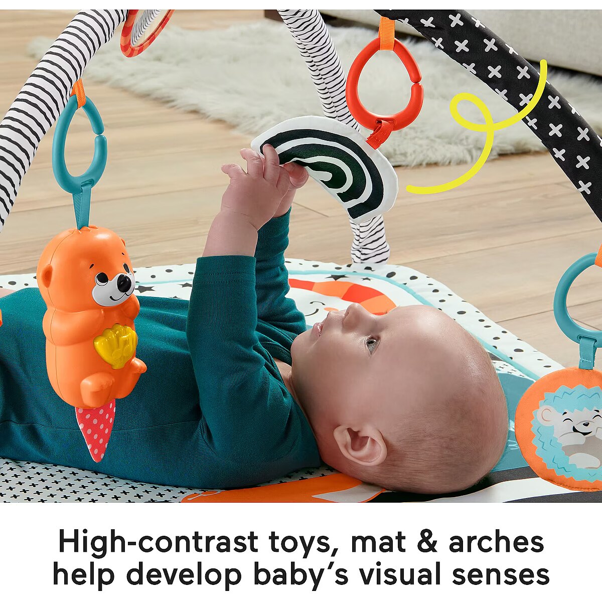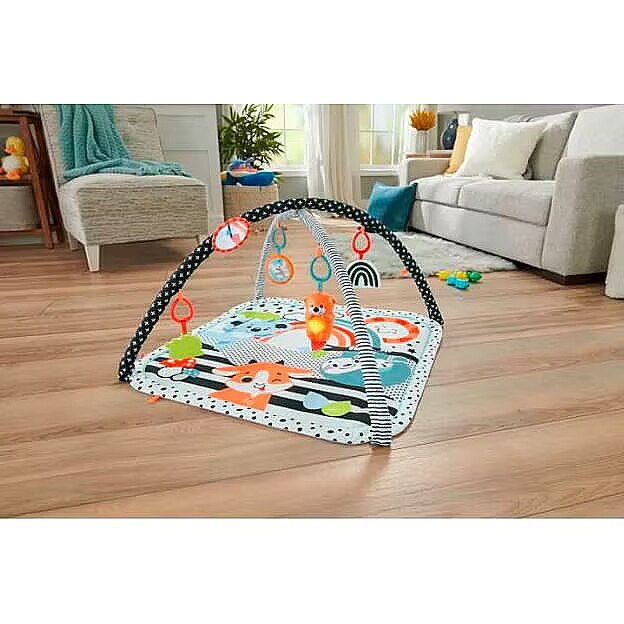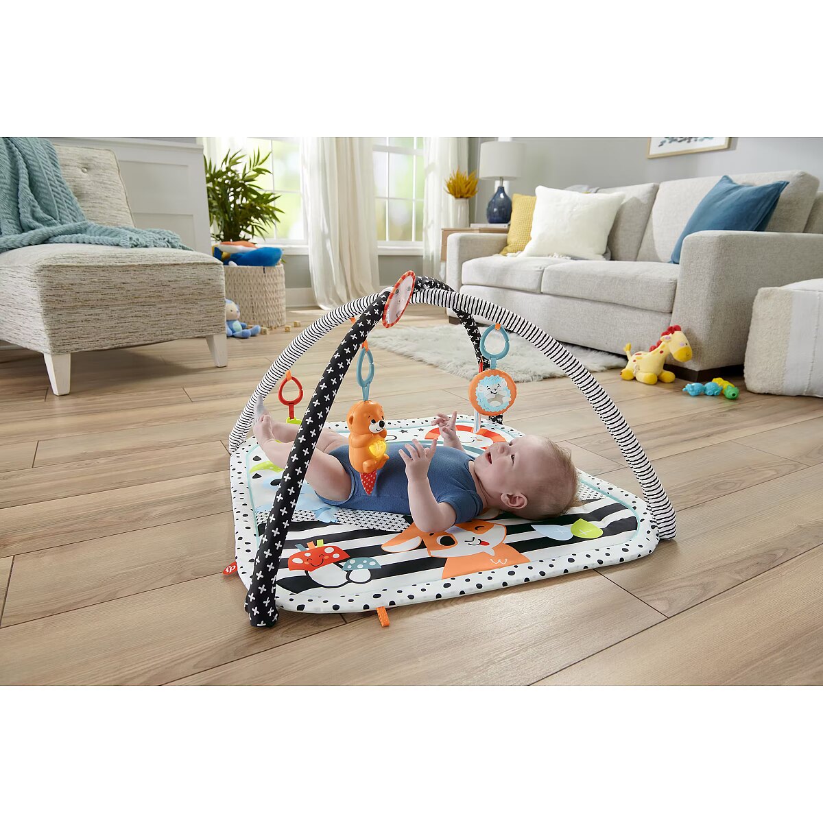 LongDesc - Your baby can continue their early development with the Fisher-Price 3-in-1 Music, Glow and Grow Gym! This bright activity play mat comes with five linkable activity toys that include a mirror, soft rattle hedgehog toy, BPA-free snail teether, crinkle rainbow toy, and a music and lights otter for more fun both on and off the mat! When your child is old enough, remove the two arches from the large mat to encourage your baby to push up and engage new muscles. This Fisher-Price play mat is suitable for all babies from newborn up.
