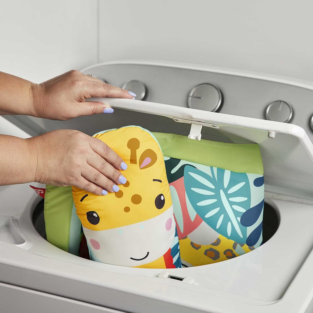 Technical_details - The Fisher-Price 3-in-1 Rainforest Playmat offers wild sensory experiences for babies, newborns and even toddlers. Newborns can lie down on the soft play mat while six toys hang from the arches above them. For tummy time play, the adjustable arch can slide down to put the toy within baby's reach, while the giraffe play pillow supports baby while playing. In addition, the sloth offers exciting fun with up to 20 minutes of music and lights, whether playing in the prone position, playing while sitting or playing on the go. Item no.: 1888524 Type of play arch/blanket EAN 0194735095919 Manufacturer no. HJW08 Contents/equipment 1 crackling tiger, 1 rattle parrot, 1 butterfly mobile, 1 BPA-free leaf teething toy, 1 mirror, 1 sloth with music and lights Age recommendation from 0 months Target group: babies, toddlers Material fabric Sound Yes Lighting Yes Warnings Attention: Product contains batteries, please note the information inside! Note The play mat and play cushion can be washed in the washing machine (remove sheets and toys beforehand). Accessories available AA battery