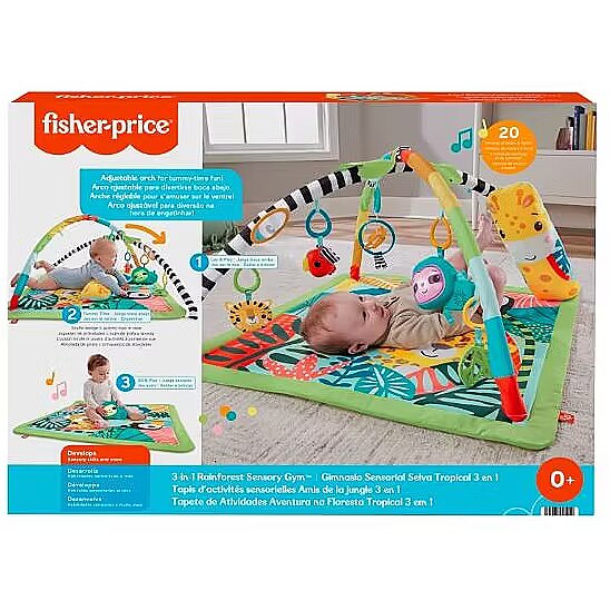 LongSummaryDescription - Fisher-Price 3-in-1 Rainforest Sensory Gym Tummy Wedge with 6 Baby Toys Newborn to Toddler. Product type: Baby play mat, Material: Plastic, Product colour: Multicolour. Battery type: AA, Battery technology: Alkaline. Width: 889 mm, Height: 533.4 mm, Depth: 788.4 mm. Package width: 622.3 mm, Package depth: 95.3 mm, Package height: 457.2 mm. Packaging content: 1 gym, 1 tummy wedge, 6 toys