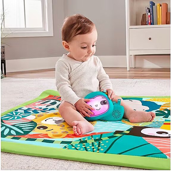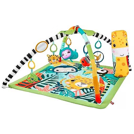 LongDesc - Go on a sensory rainforest adventure with Fisher Price Play Matt Baby! Our playmate for babies invites your little one to explore the rainforest and learn about new sensations, lights and sounds with the crinkle tiger, rattle parrot, butterfly mobile, BPA-free leaf teether, and music & lights Sloth! Also included is a self-discovery mirror which helps baby's self discovery. Our baby play mats for floor has 2 removable arches to cater for never-ending fun when your child grows and grows and a tummy support wedge that allows for essential Tummy Time play that ensures they grow big and strong core muscles! They'll love finding out the new textures and shapes of the sensory toys. Keep them entertained and let them find their rhythm to the beat of the tunes. Stimulate their visual senses with an array of lights and colours. These babygym sensory mats can be offered as the perfect 1 year baby gifts girls and boys to the new parents in your life - it might just be the toy that facilitates their first play time together! Check out the rest of the Fisher Price range for more 0-3 months baby toys, baby gym play mat 0-6months, 10 months baby toys and sensory toys for babies 6-12 months.